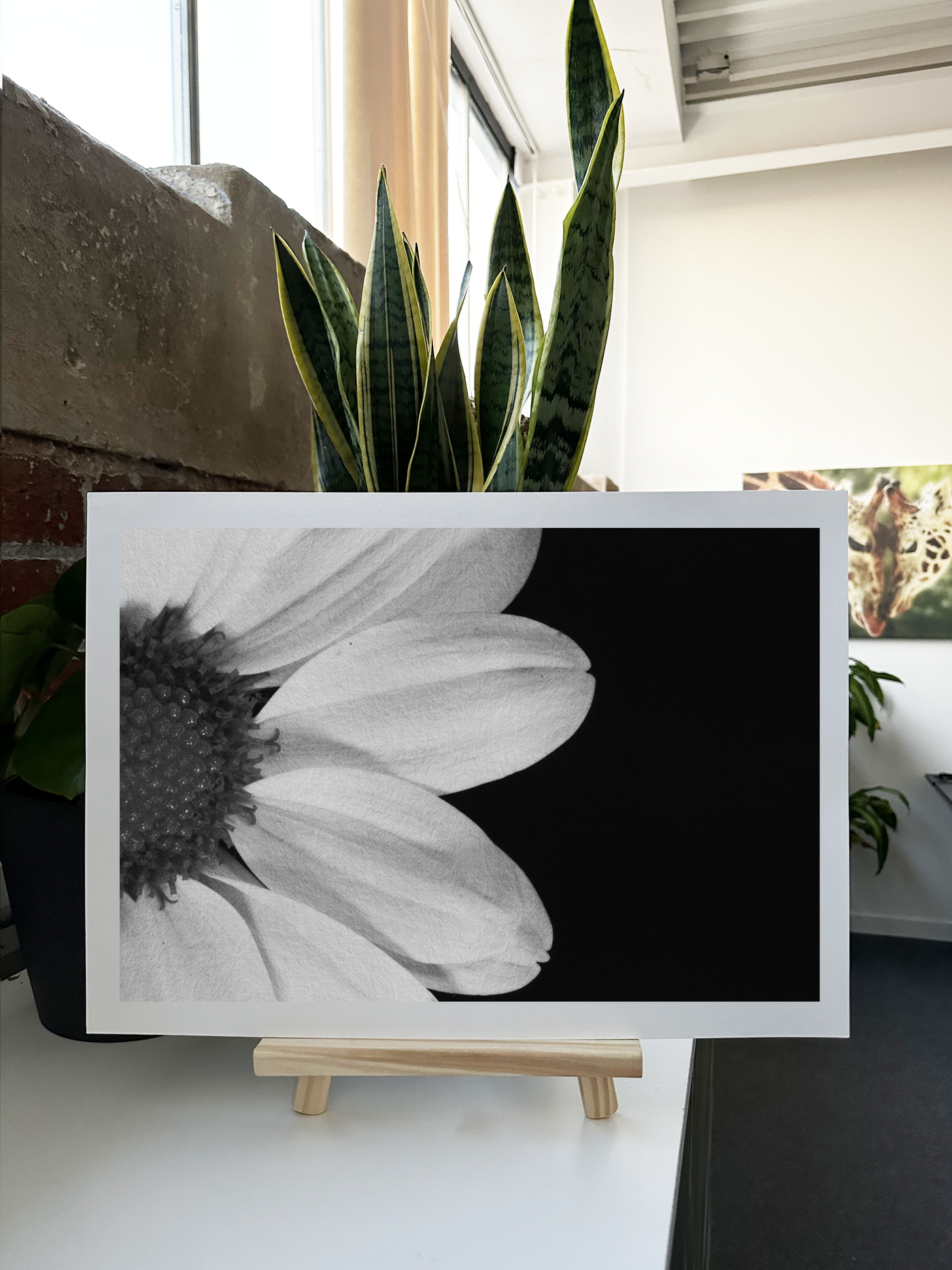 The Monochrome Fine Art medium enhances this image beautifully, its natural texture complementing the organic subject matter. The matte finish of the Fine Art paper softens the contrast between the flower and the background, creating a sense of depth and dimensionality that draws the viewer in. Our team at 101 Canvas Prints has worked diligently to ensure every nuance of Monochromatic tonality and texture is faithfully reproduced, resulting in a piece that would add a touch of serene elegance to any space. This print would be particularly striking in a bedroom, study, or any area where its quiet beauty can be appreciated up close.