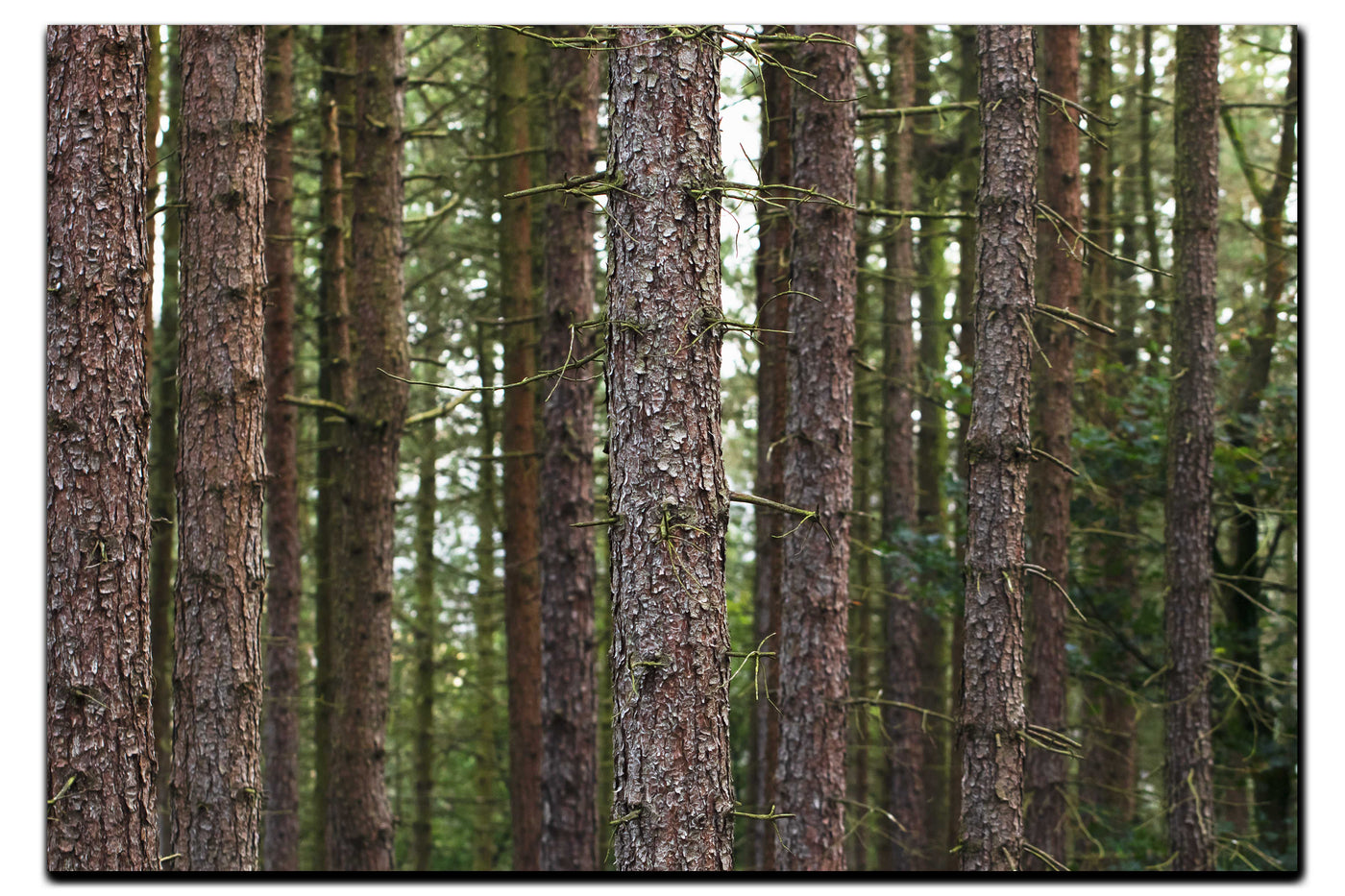 This striking forest photograph captures the essence of a dense pine woodland, with tall, straight trunks creating a compelling vertical composition. The image draws the viewer's gaze through a corridor of trees, each trunk standing like a natural pillar.