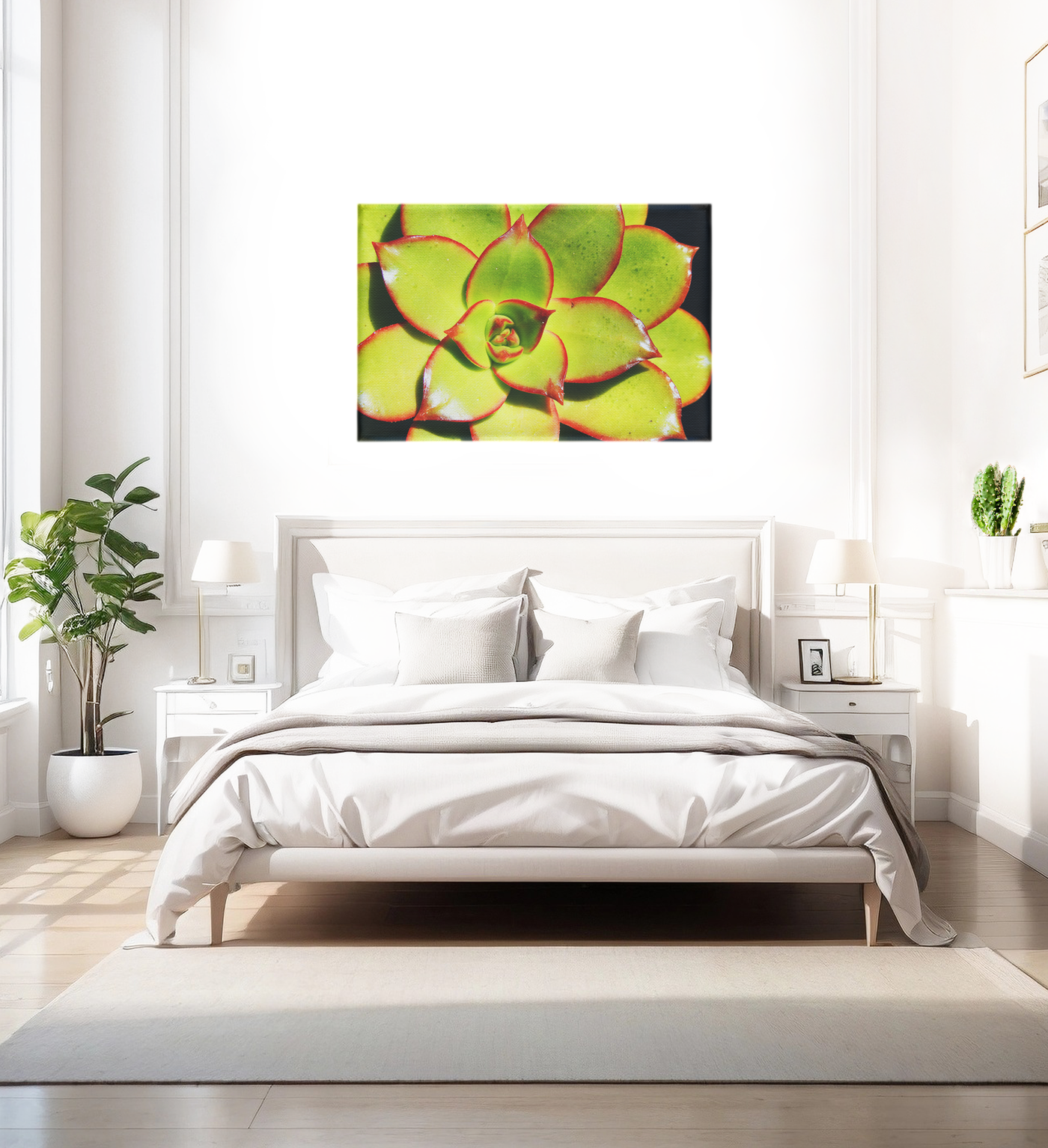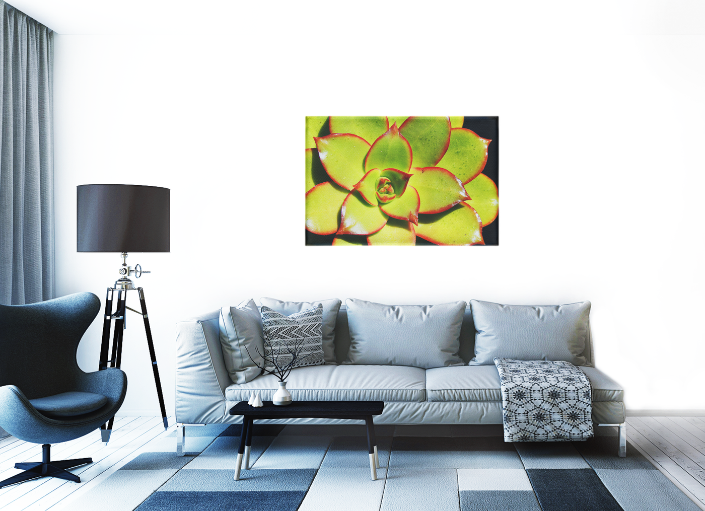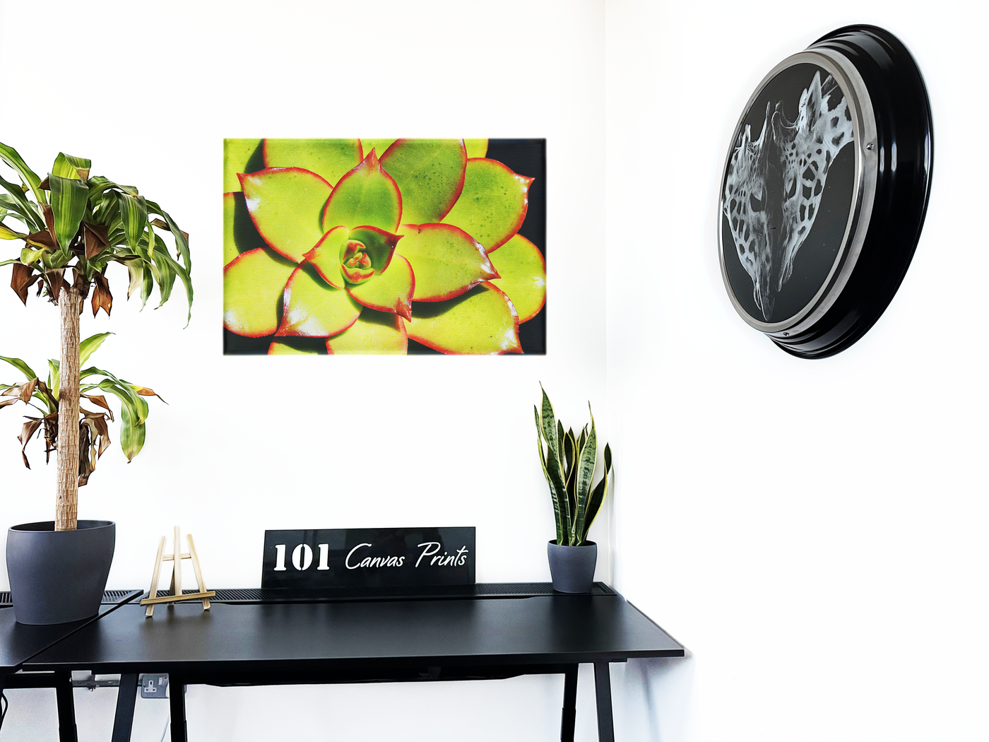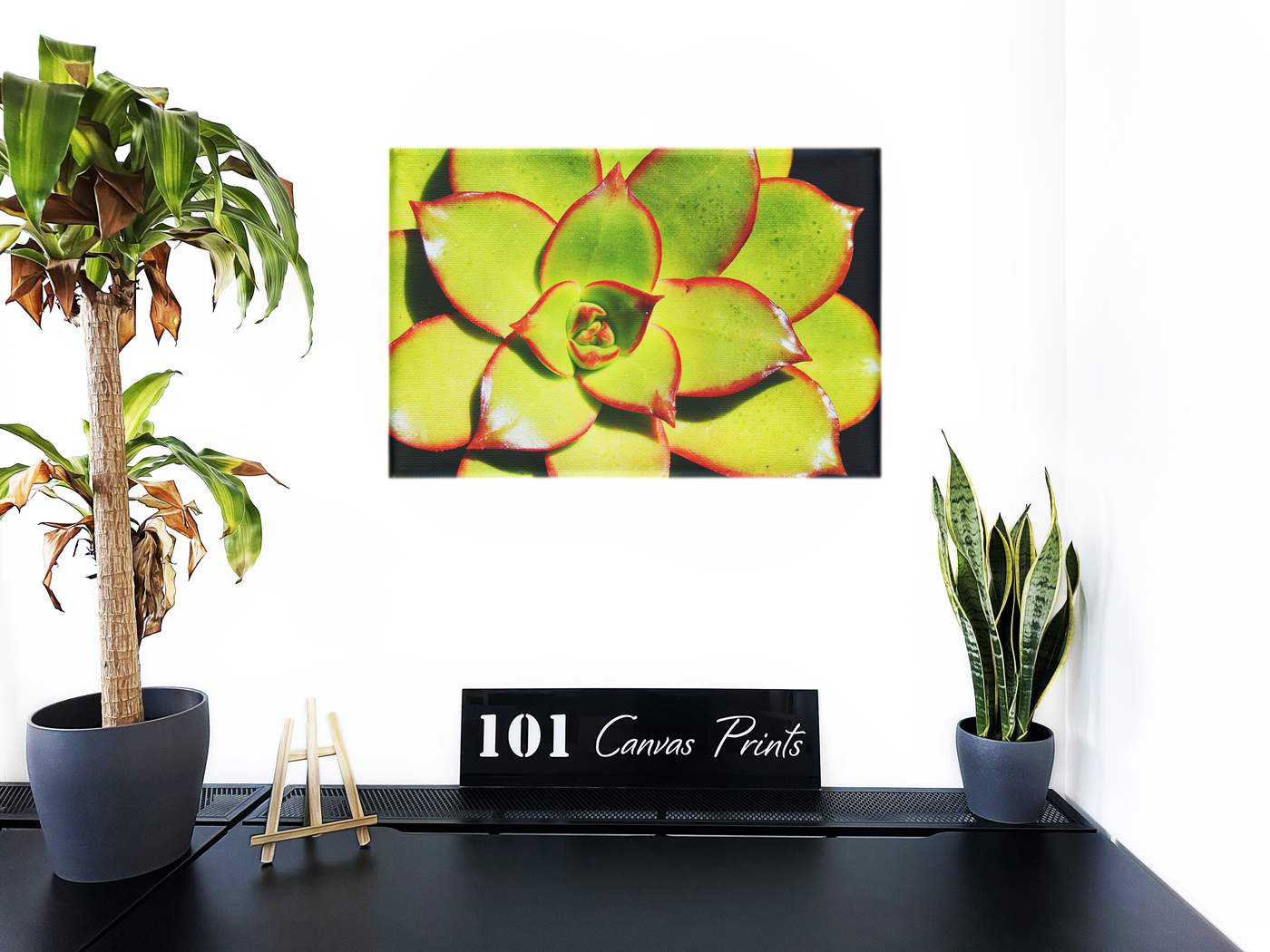 The rosettes of triangular leaves have been captured in amazing detail by the 101 Canvas Prints photography team, making superb use of an EF Macro 100mm f/2.8 lens for a high definition finish, and excellent use of lighting to create depth and enhance the range of colours on display.