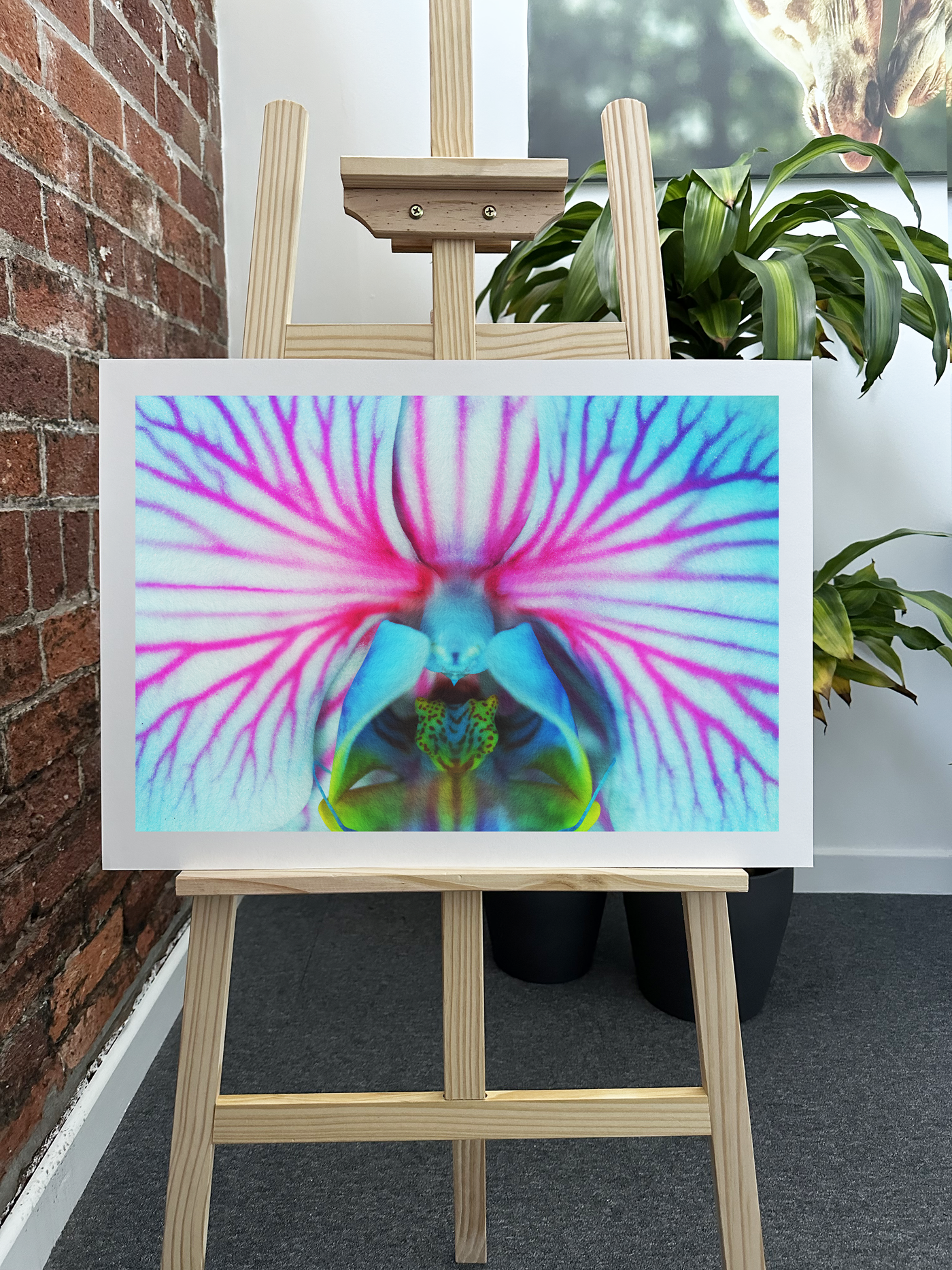 Hang this captivating piece in your home or office to bring a touch of tropical mystery and vibrant energy to your space. The unique perspective of this macro orchid image, combined with its psychedelic colour palette, makes it a versatile artwork that can complement both modern and eclectic interior designs. Let this stunning Fine Art print transport you to a world where nature's beauty is magnified and transformed into pure visual poetry.