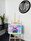 The natural texture of the Fine Art print softens the electric hues of the image, creating a harmonious balance between the vibrant colours and the organic feel of the print. This interplay enhances the dreamlike quality of the macro photograph, making the fluorescent pinks, ethereal blues, and lime greens appear to glow from within the fabric.