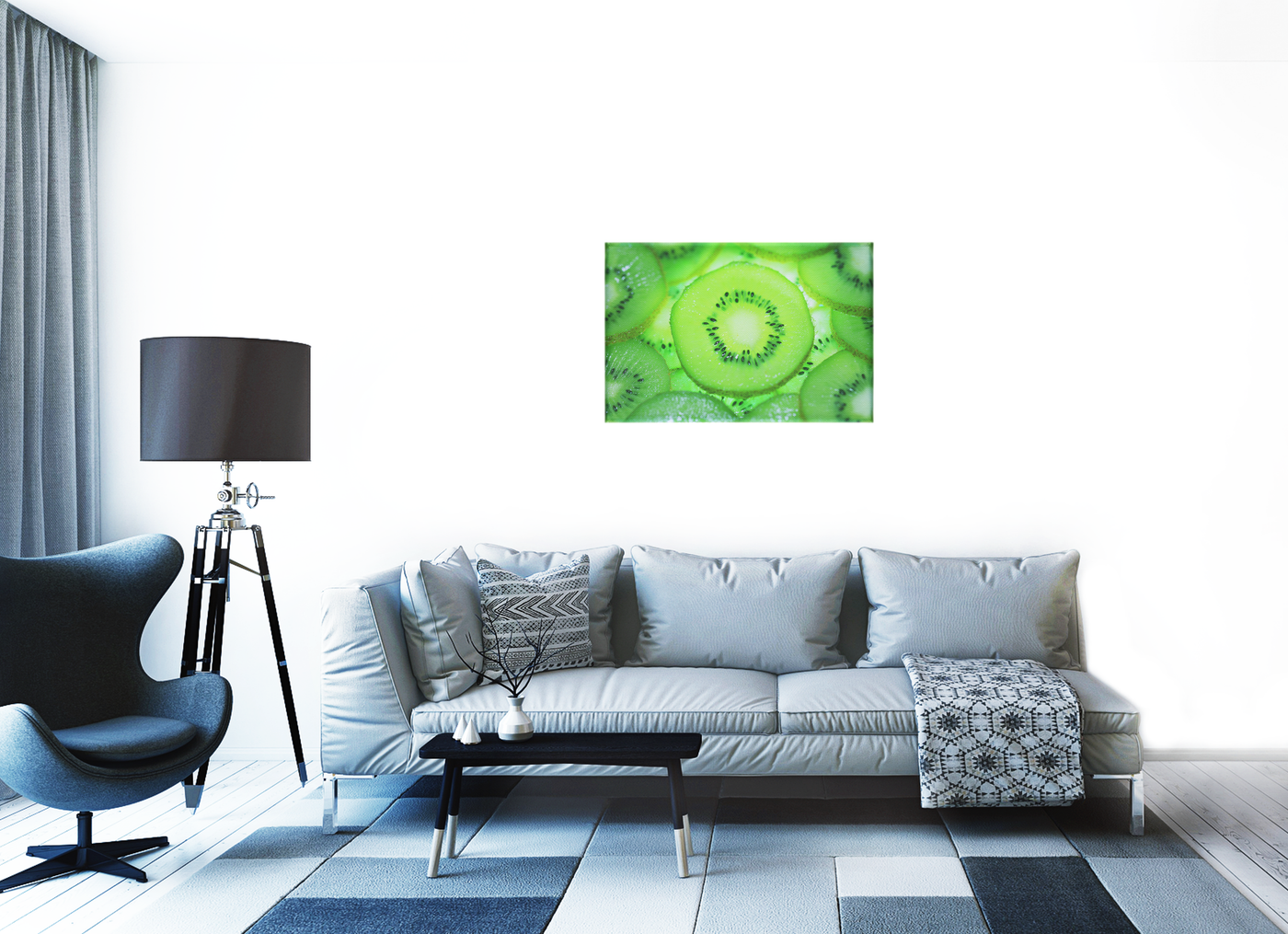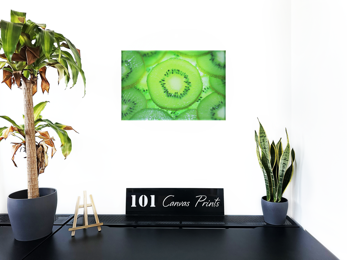 This captivating photograph by the 101 Canvas Prints photography team showcases a vibrant arrangement of kiwi fruit slices. The composition centres on a perfect cross-section, surrounded by partial slices that create a sense of depth and abundance. The image offers a mesmerising study of the fruit's intricate internal structure, with its distinctive seed pattern radiating from the centre like a natural mandala.