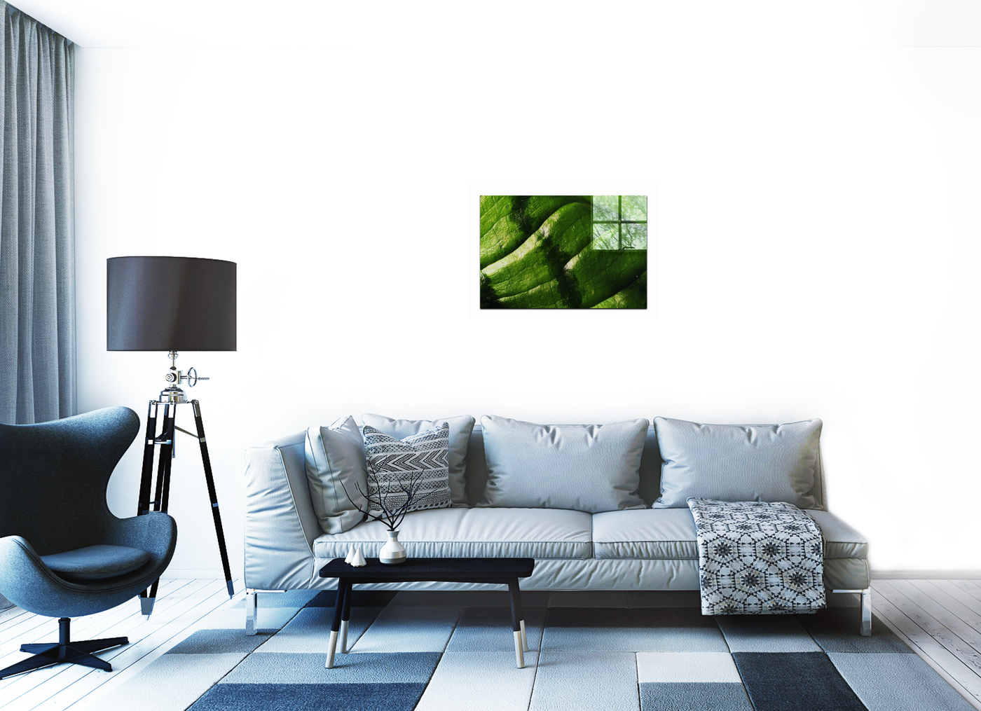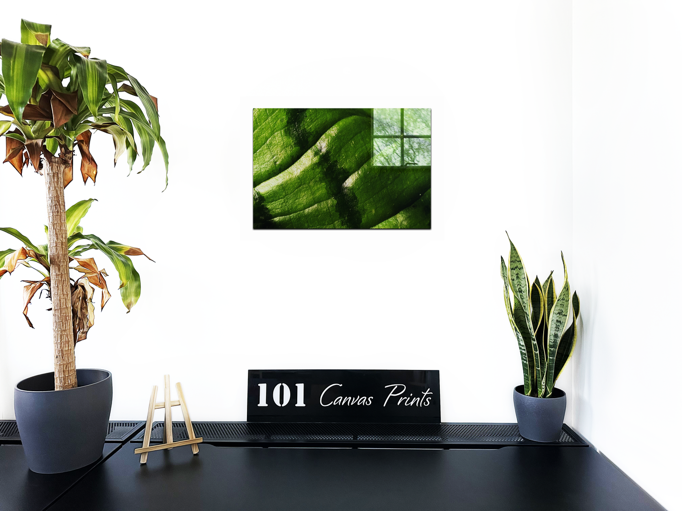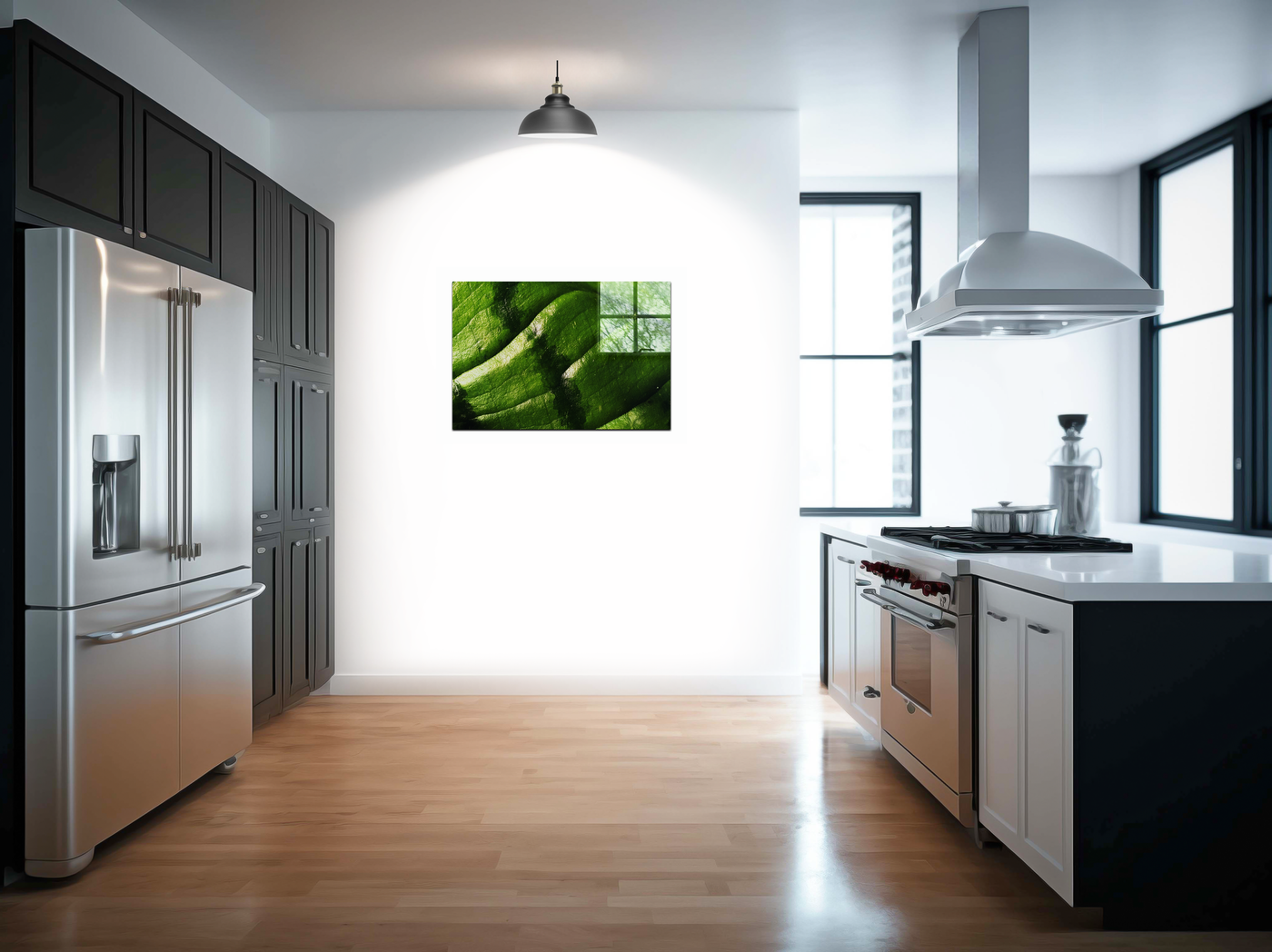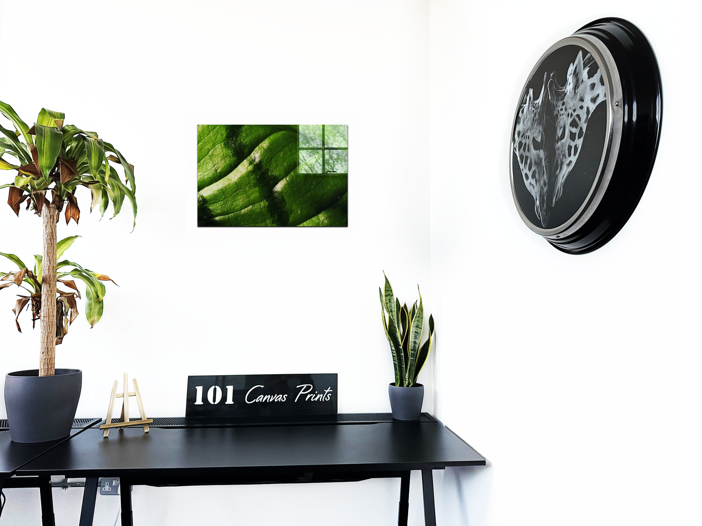 The Acrylic medium intensifies the greens, bringing out their jewel-like quality and creating a striking visual impact. The glossy surface also adds a sense of moisture, as if capturing the leaf in the fresh aftermath of a gentle rain. This print would be particularly well-suited to modern, minimalist interiors, perhaps in a spa-like bathroom, a contemporary living room, or as a focal point in a biophilic office space, where its vibrant colours and glossy finish would create a vivid connection to the natural world.