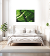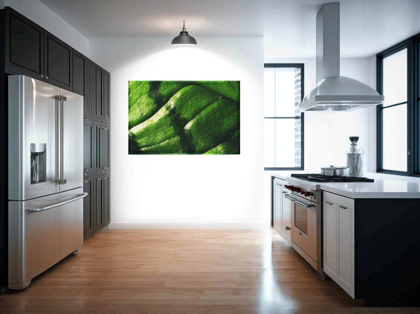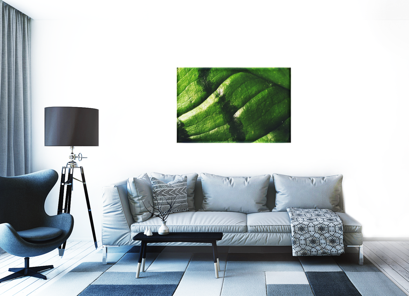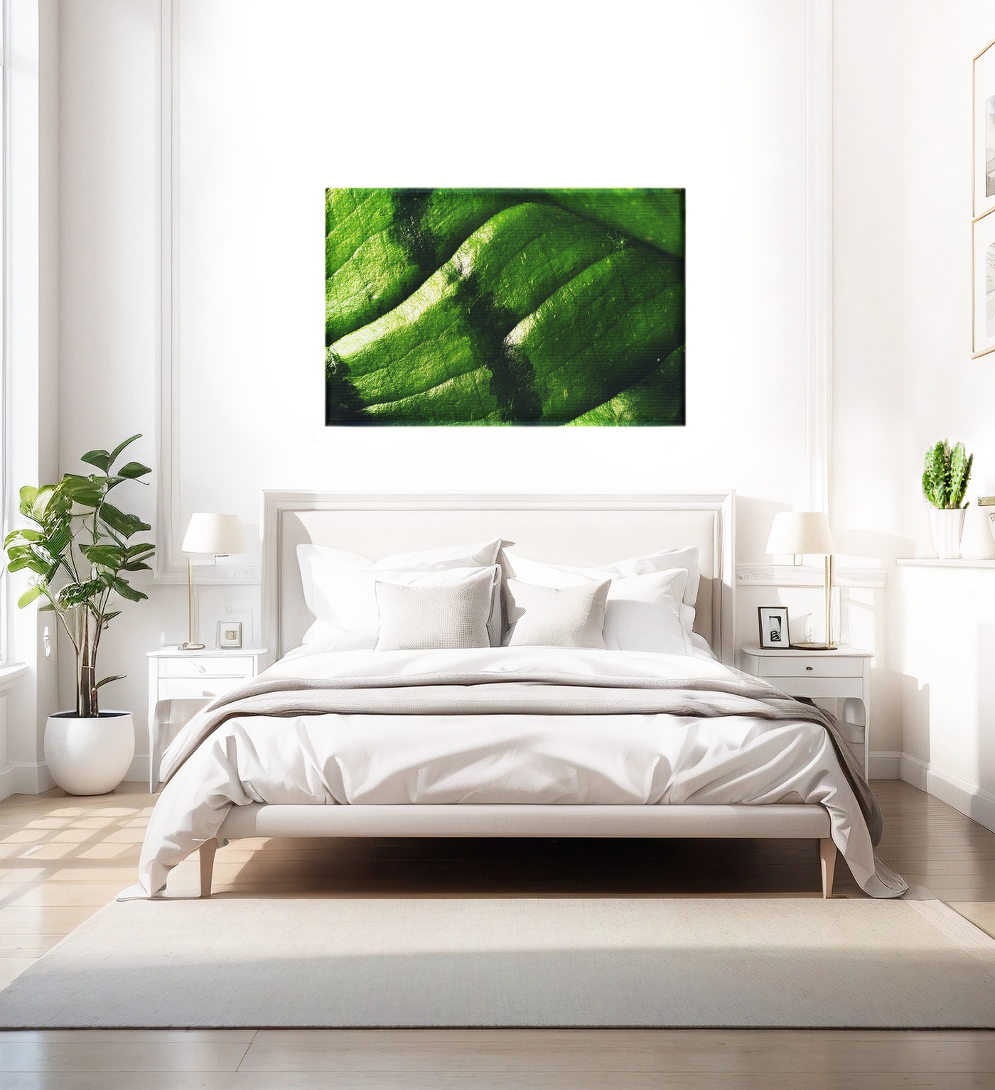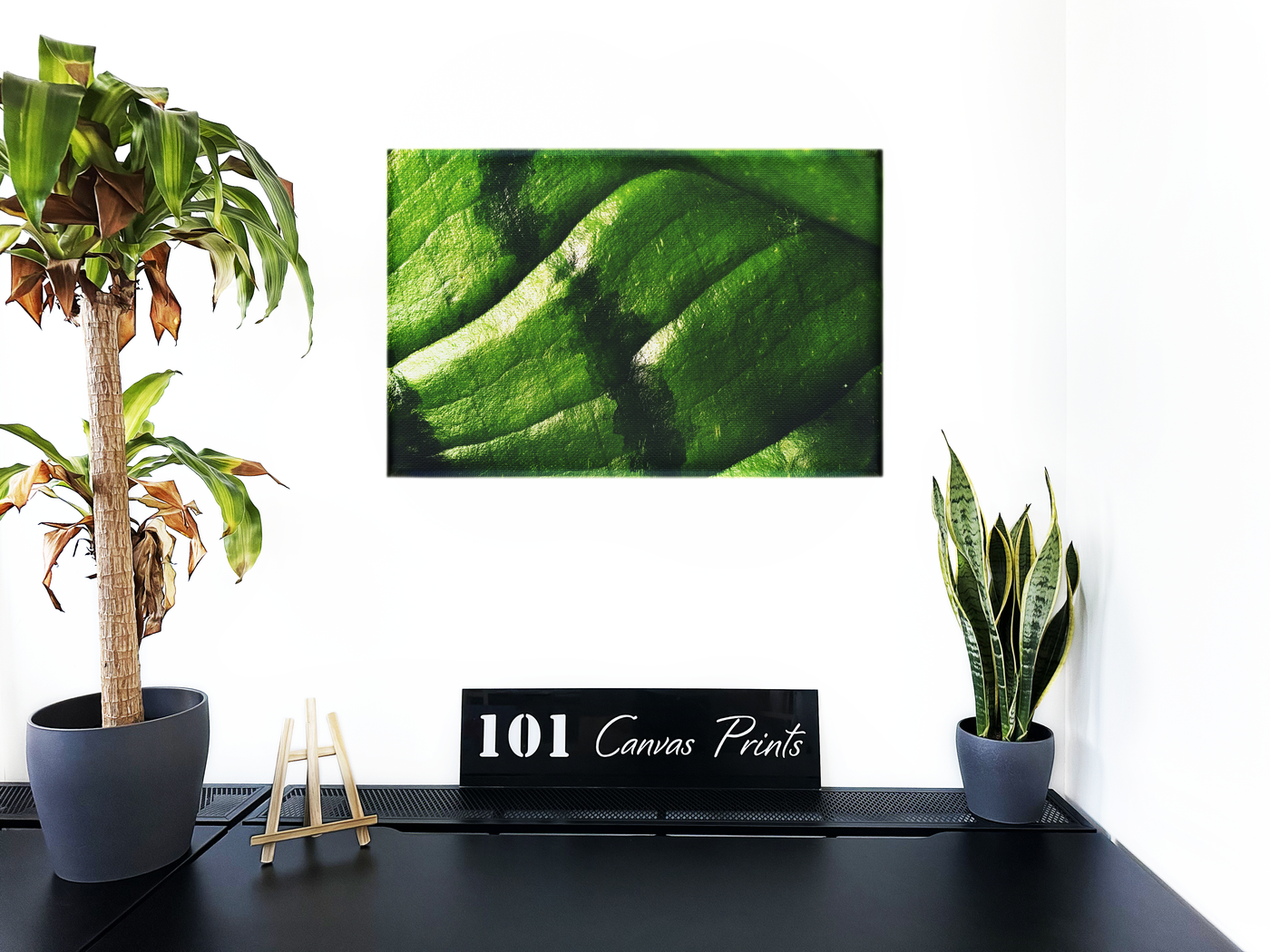 Rendered on Canvas, this image takes on a particularly fitting quality. The natural, slightly textured surface of the Canvas complements the organic subject matter, enhancing the perception of the leaf's texture. The matte finish softens the overall effect, creating a harmonious balance between the print medium and the leaf's inherent lustre. This print would be an excellent addition to a variety of spaces, from a serene bedroom to an office environment, where its calming green tones and organic forms could bring a touch of nature's tranquillity indoors.