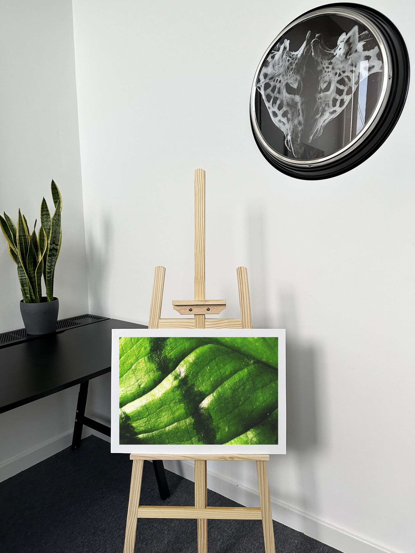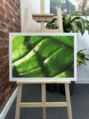 Rendered on Fine Art paper, this image takes on a particularly fitting quality. The natural, slightly textured surface of the Fine Art print complements the organic subject matter, enhancing the perception of the leaf's texture. The matte finish softens the overall effect, creating a harmonious balance between the print medium and the leaf's inherent lustre. This print would be an excellent addition to a variety of spaces, from a serene bedroom to an office environment, where its calming green tones and organic forms could bring a touch of nature's tranquillity indoors.