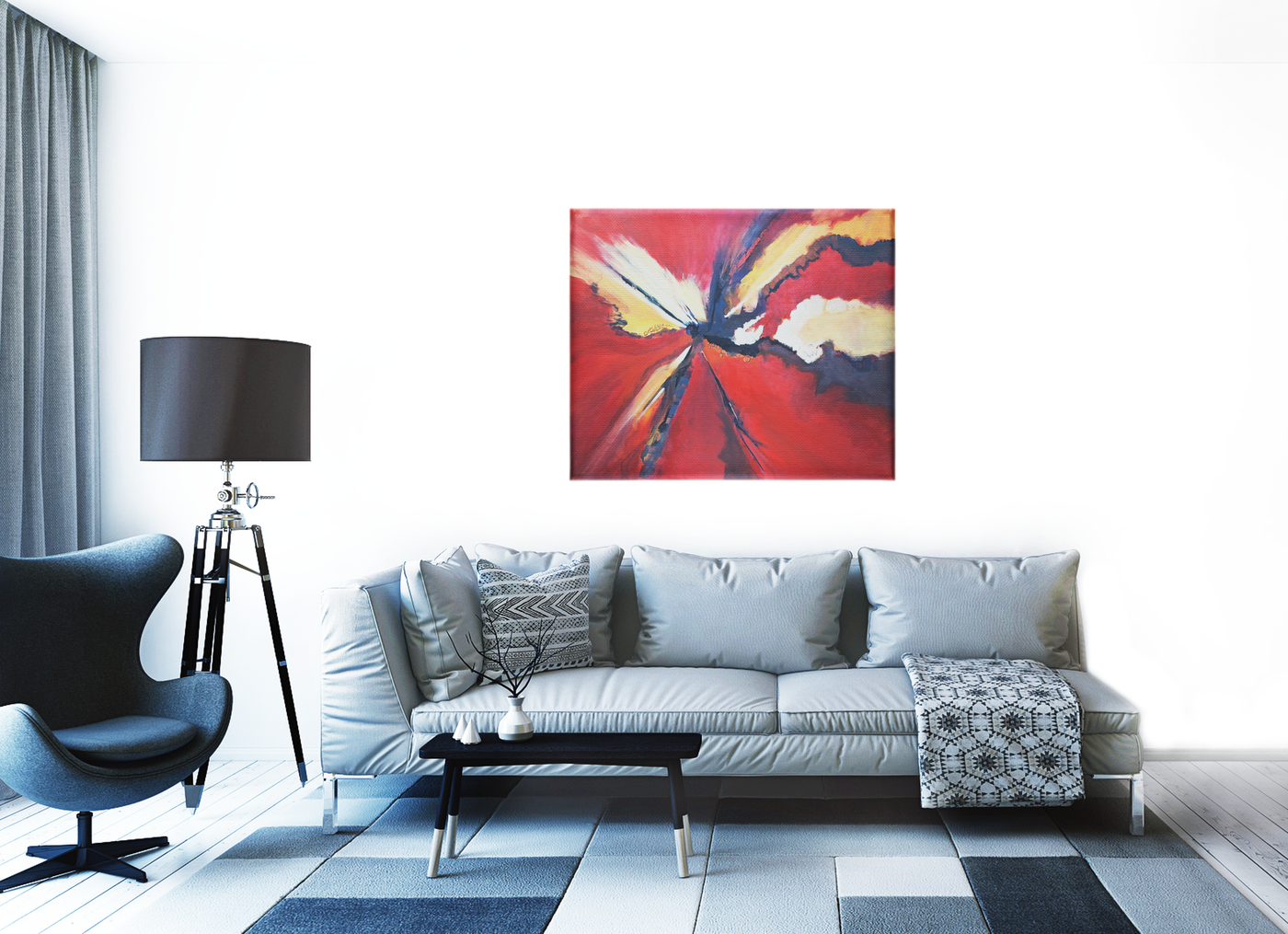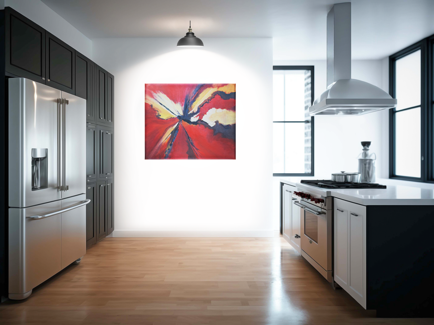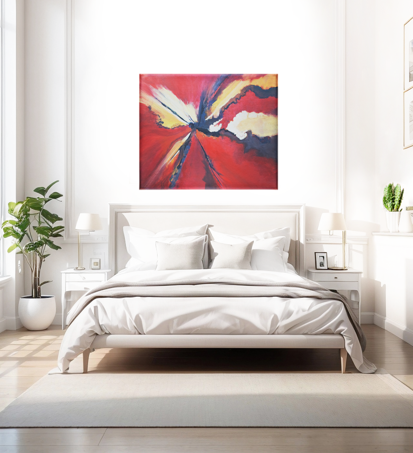 The colour palette is dominated by passionate reds intersected by bold strokes of navy blue and brilliant white, with touches of warm yellow creating points of energetic contrast. Our print enhancement team have preserved every nuance of the artist's brushwork, from the explosive central point to the fluid movements that radiate outward, capturing both the violence and beauty of evolutionary processes. The interplay between light and shadow creates a sense of depth that pulls viewers into this cosmic narrative.