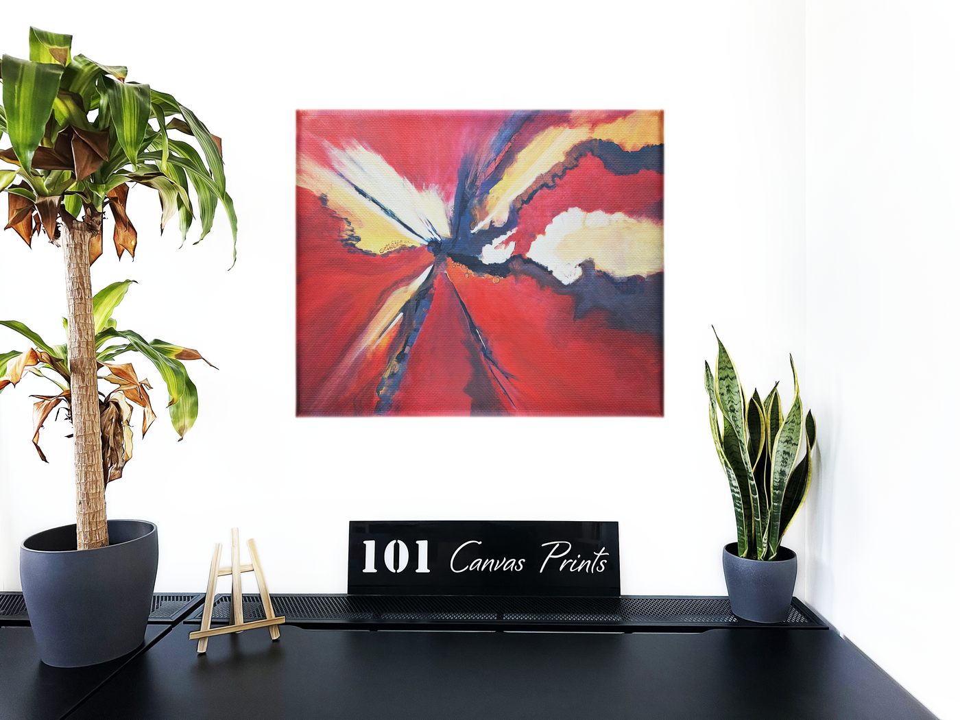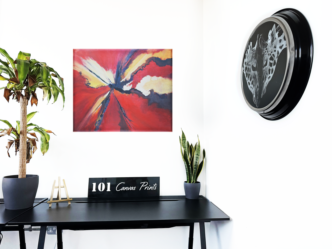 Masterfully captured by the 101 Canvas Prints photography team, this dynamic piece from "The Big Bang and Evolution" diptych created during lockdown presents a powerful meditation on life's emergence. The composition explodes from a central point, with dramatic rays of colour suggesting both cosmic forces and biological emergence. Created as a companion to "The Big Bang," this piece continues the narrative of creation, focusing on the extraordinary journey of life's development on Earth.