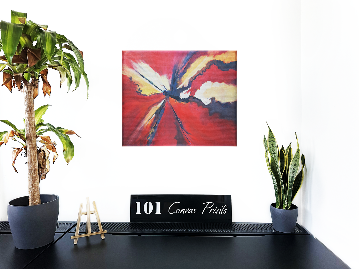 Masterfully captured by the 101 Canvas Prints photography team, this dynamic piece from "The Big Bang and Evolution" diptych created during lockdown presents a powerful meditation on life's emergence. The composition explodes from a central point, with dramatic rays of colour suggesting both cosmic forces and biological emergence. Created as a companion to "The Big Bang," this piece continues the narrative of creation, focusing on the extraordinary journey of life's development on Earth.