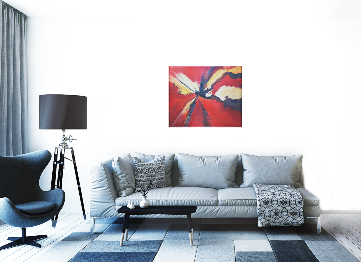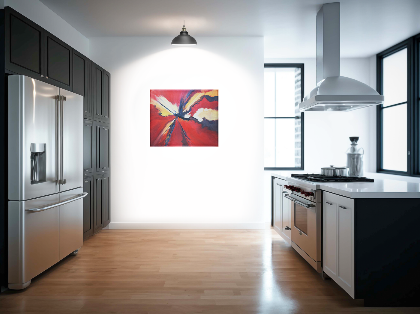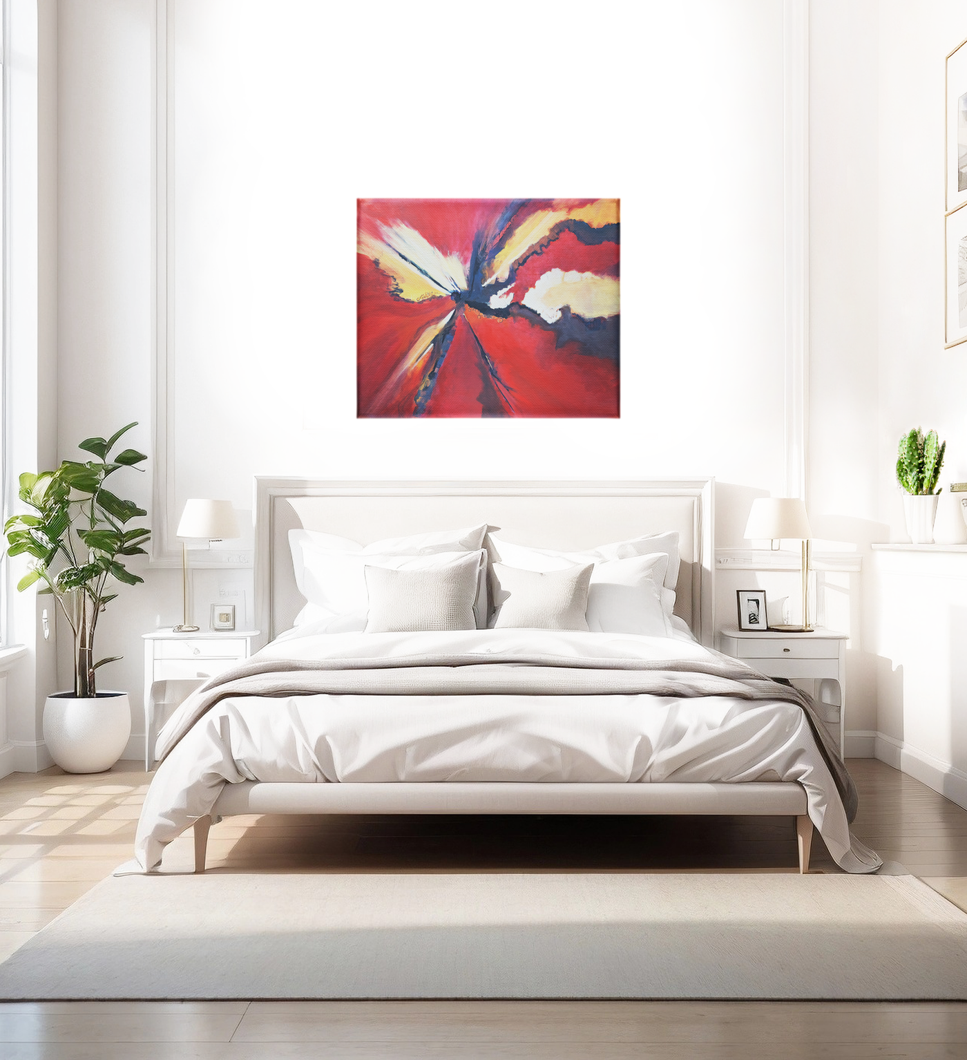 The colour palette is dominated by passionate reds intersected by bold strokes of navy blue and brilliant white, with touches of warm yellow creating points of energetic contrast. Our print enhancement team have preserved every nuance of the artist's brushwork, from the explosive central point to the fluid movements that radiate outward, capturing both the violence and beauty of evolutionary processes. The interplay between light and shadow creates a sense of depth that pulls viewers into this cosmic narrative.