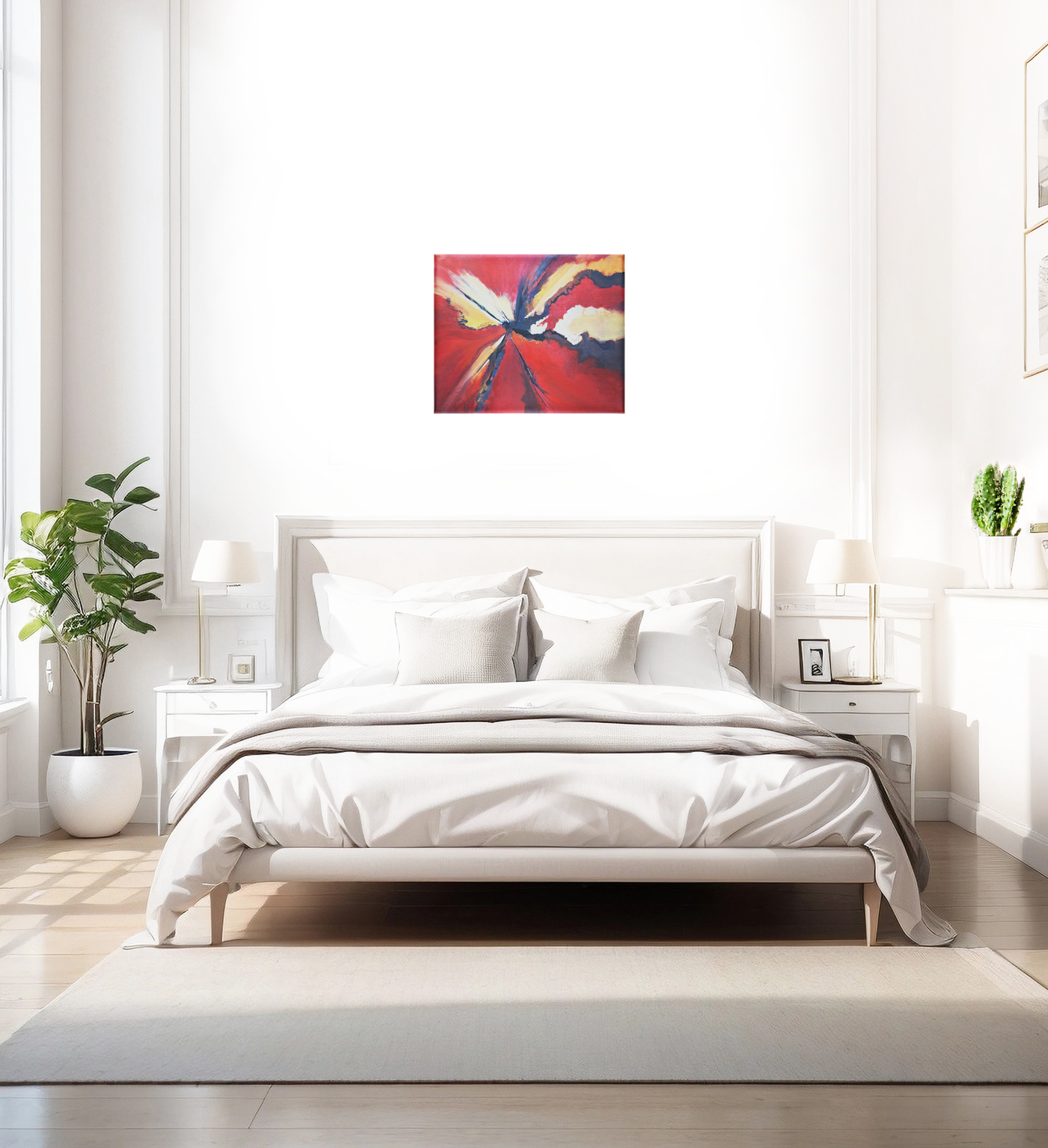 The colour palette is dominated by passionate reds intersected by bold strokes of navy blue and brilliant white, with touches of warm yellow creating points of energetic contrast. Our print enhancement team have preserved every nuance of the artist's brushwork, from the explosive central point to the fluid movements that radiate outward, capturing both the violence and beauty of evolutionary processes. The interplay between light and shadow creates a sense of depth that pulls viewers into this cosmic narrative.