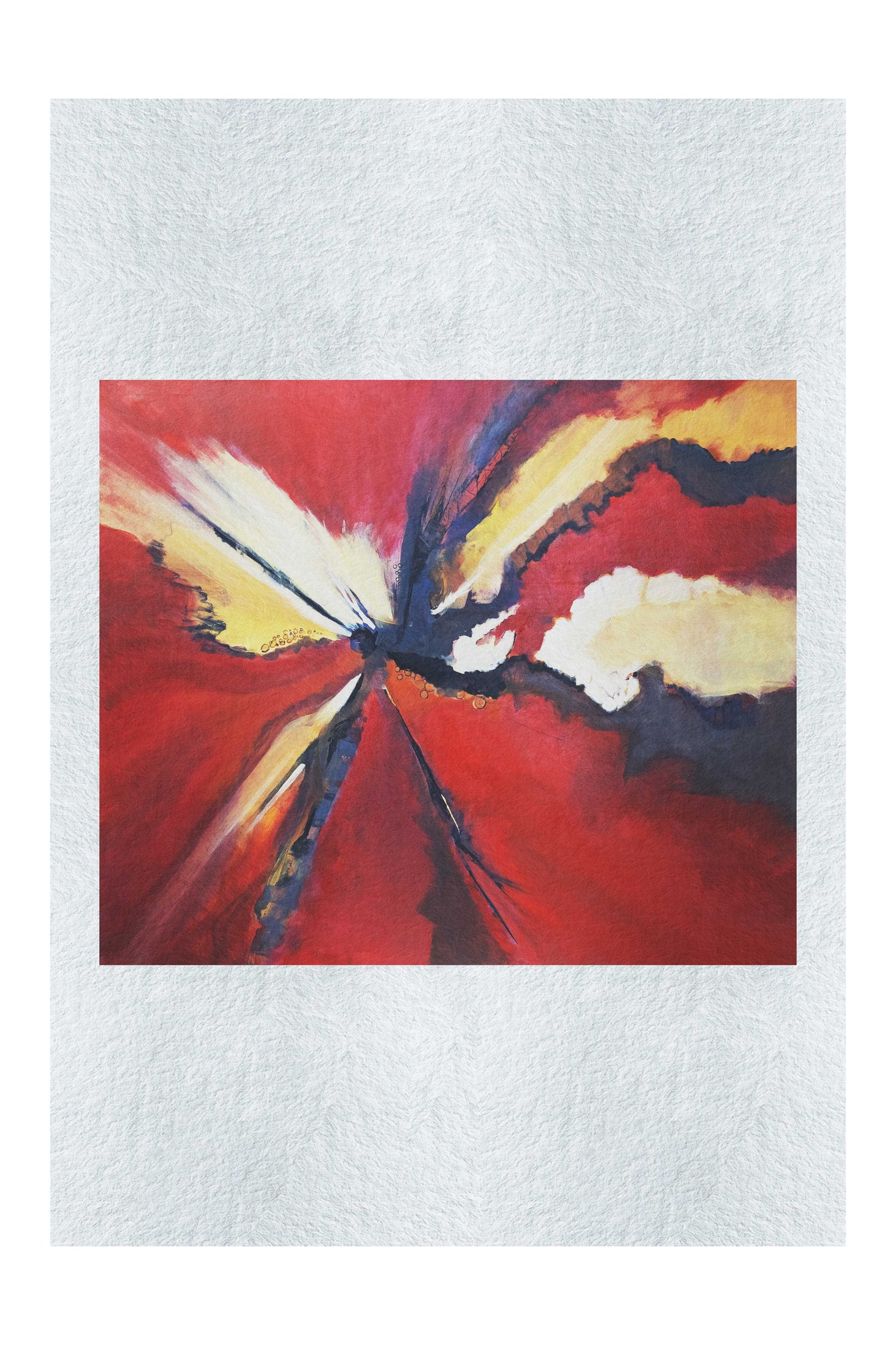 The colour palette is dominated by passionate reds intersected by bold strokes of navy blue and brilliant white, with touches of warm yellow creating points of energetic contrast. Our print enhancement team have preserved every nuance of the artist's brushwork, from the explosive central point to the fluid movements that radiate outward, capturing both the violence and beauty of evolutionary processes. The interplay between light and shadow creates a sense of depth that pulls viewers into this cosmic narrative.