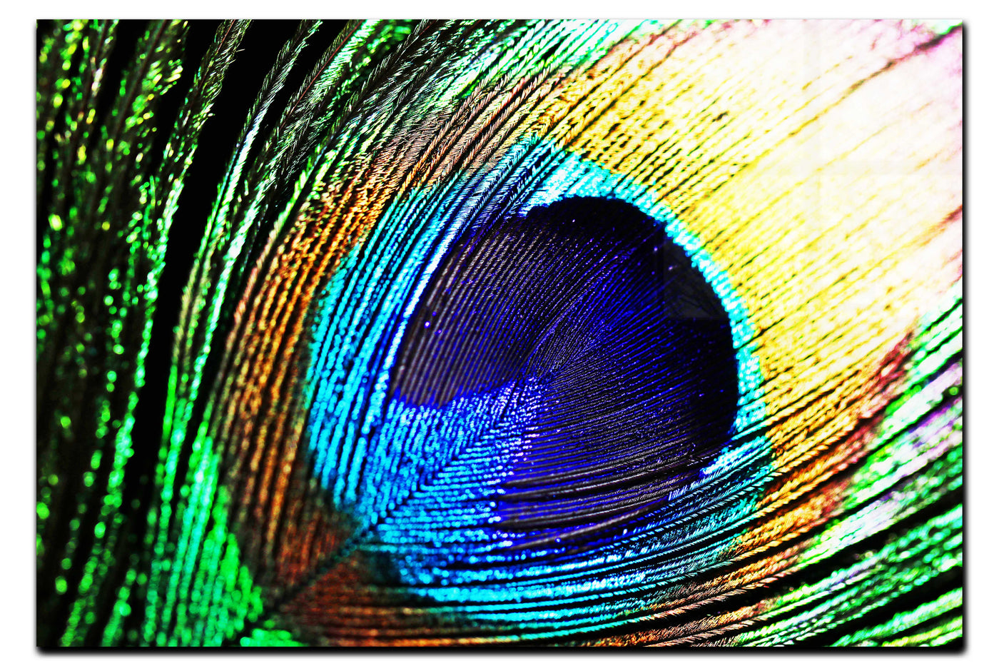 This captivating image, captured by the 101 Canvas Prints photography team, zeroes in on the mesmerising detail of a peacock feather, revealing nature's artistry in high definition. The photograph centres on the feather's distinctive 'eye', drawing the viewer into its hypnotic swirls and gradients. Every minute detail is preserved, from the soft, frond-like edges to the precise patterning of the central area.