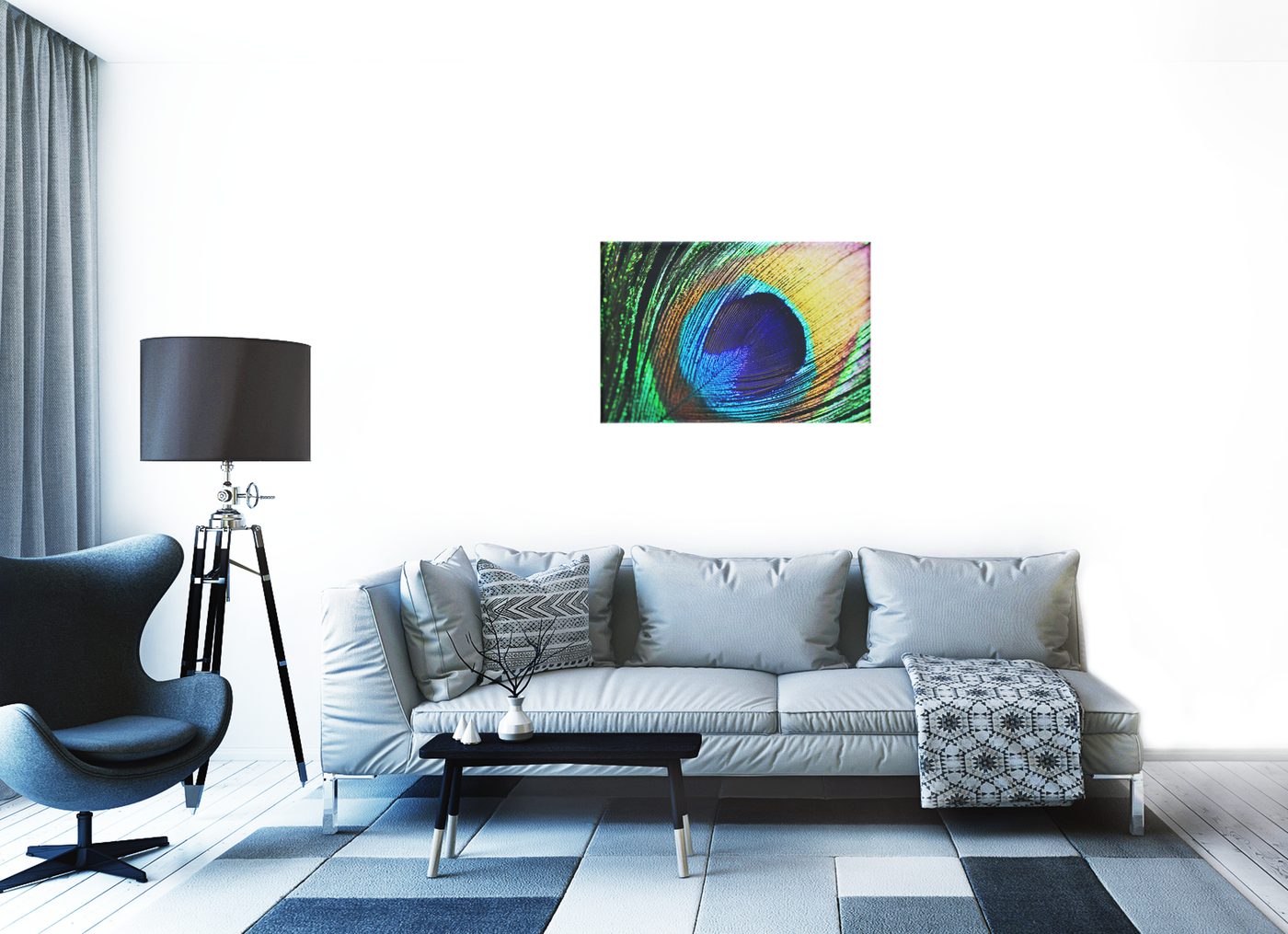 The colour palette is a rich tapestry of jewel tones, dominated by a deep, royal blue at the centre, surrounded by concentric rings of turquoise, gold, and emerald green. The lighting technique employed by the 101 Canvas Prints photographers emphasises the iridescent quality of the feather, creating a subtle shimmer that seems to dance across its surface. The intricate texture of the barbules is clearly visible, revealing the complex structure that gives the feather its unique appearance.