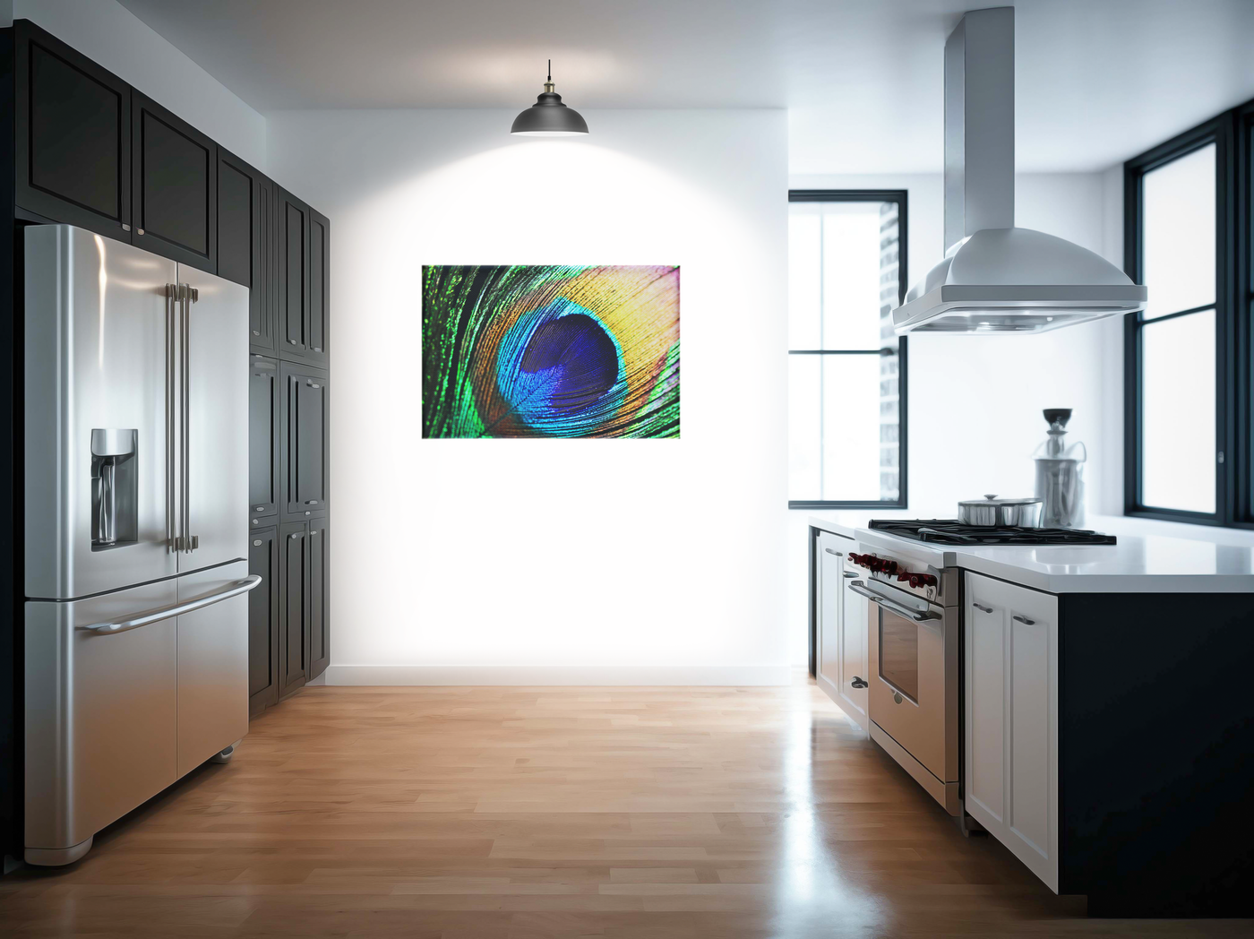 This stunning close-up of a peacock feather captures the intricate beauty of nature in exquisite detail. The image, expertly framed by the 101 Canvas Prints photography team, focuses on the iconic 'eye' of the feather, showcasing its mesmerising patterns and sumptuous colours. The composition draws the viewer in, inviting them to explore the delicate structures and gradients that make up this natural wonder.