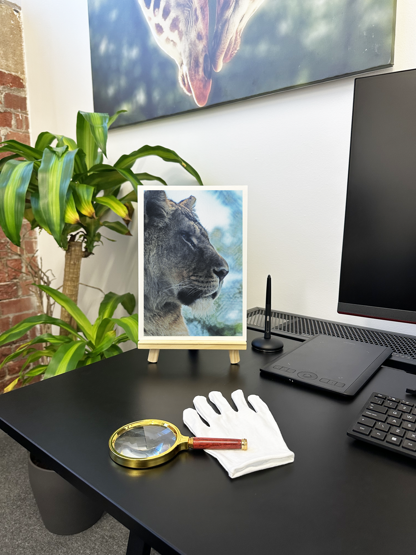 This lioness Fine Art print is sure to be exhilarating in your home or office. The portrait will draw you in with her intense and beautiful eyes, then keep you engaged with the rest of her gorgeous and detailed face. A great gift, especially for lion lovers!