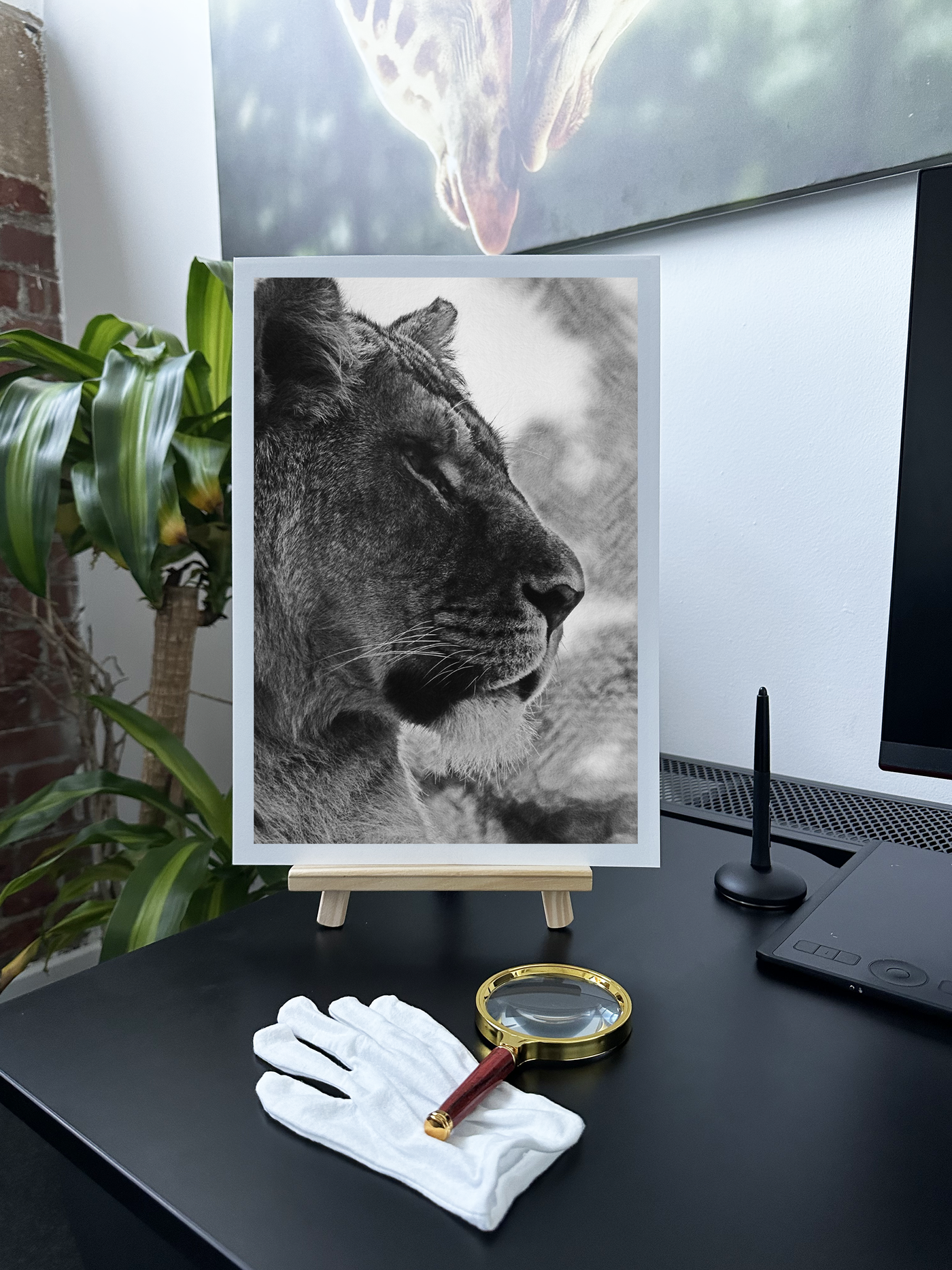 This lioness Monochrome Fine Art print is sure to be exhilarating in your home or office. The portrait will draw you in with her intense and beautiful eyes, then keep you engaged with the rest of her gorgeous and detailed face. A great gift, especially for lion lovers!