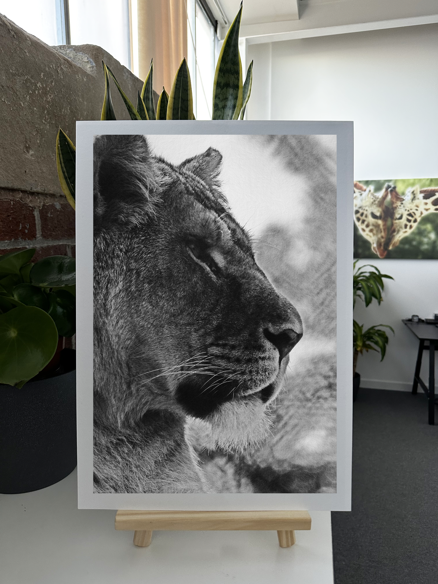 The print depicts of a beautiful and fierce lioness, taken from a slightly left side profile. The lioness has a glossy coat and large eyes. She is looking into the distance, showing some of her fierceness yet remaining calm and in control.