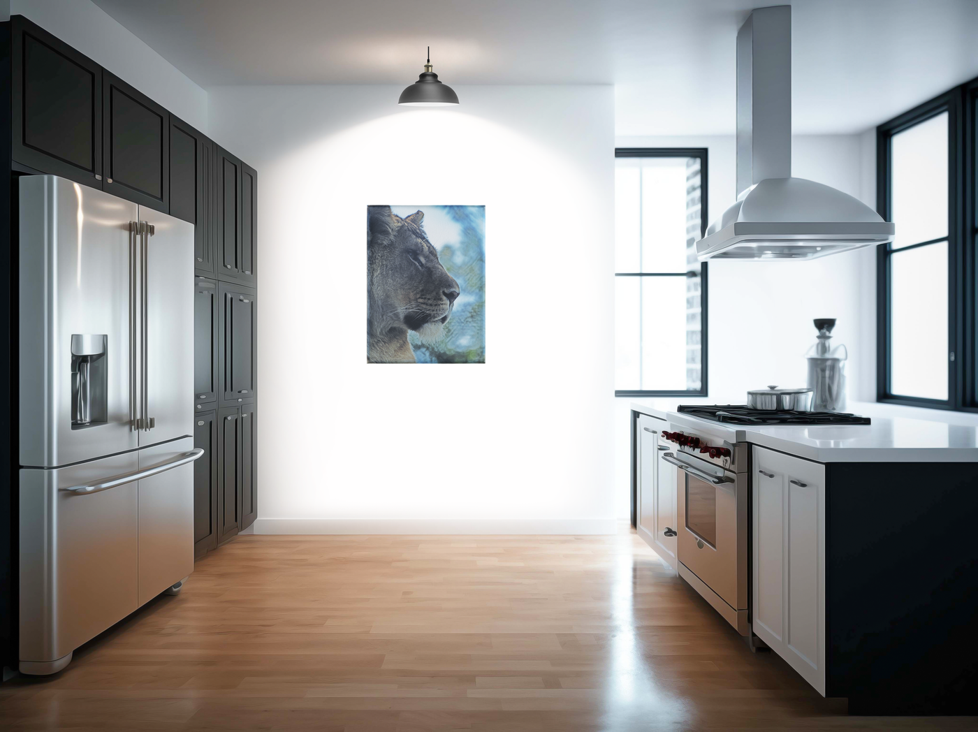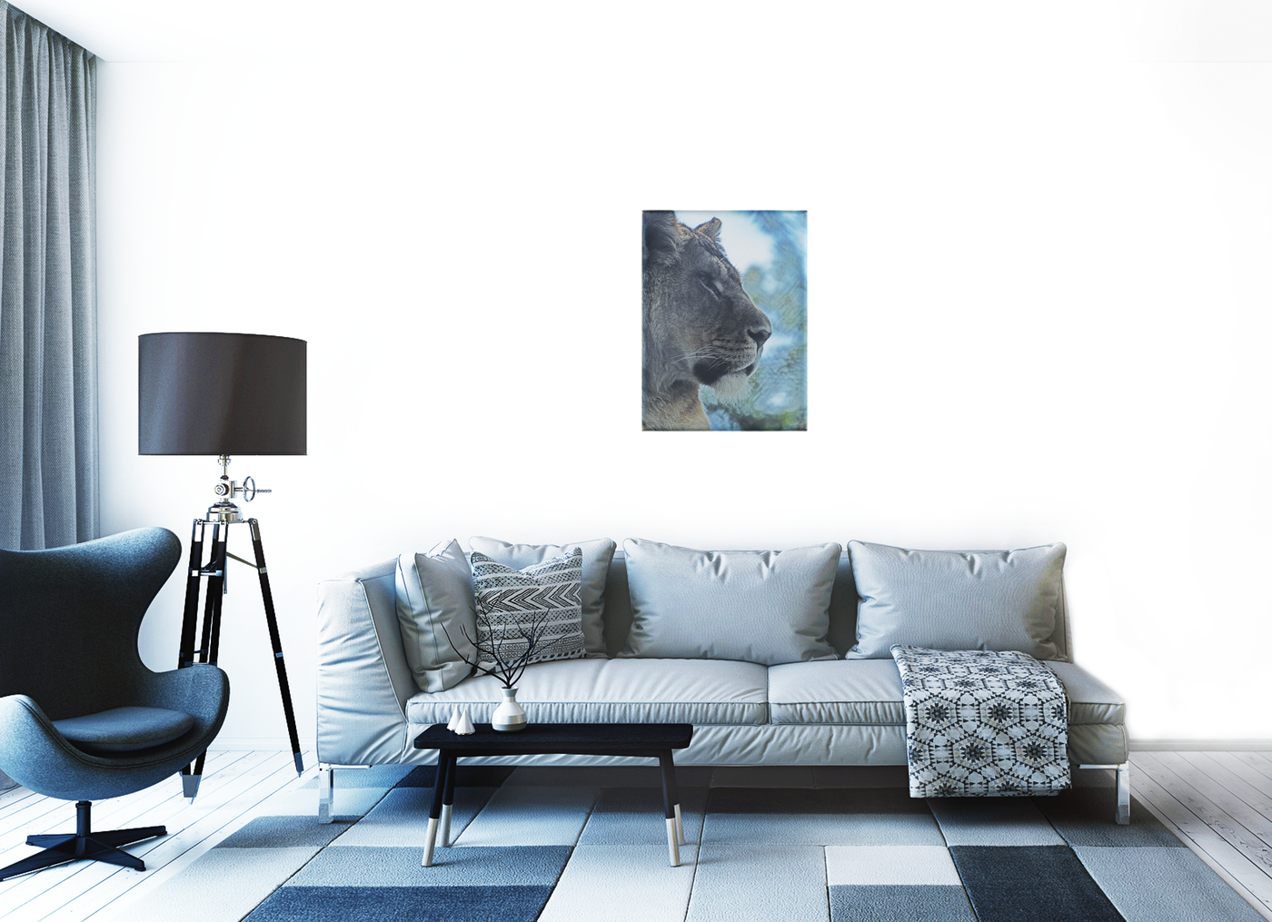 The print depicts of a beautiful and fierce lioness, taken from a slightly left side profile. The lioness has a glossy coat and large eyes. She is looking into the distance, showing some of her fierceness yet remaining calm and in control.