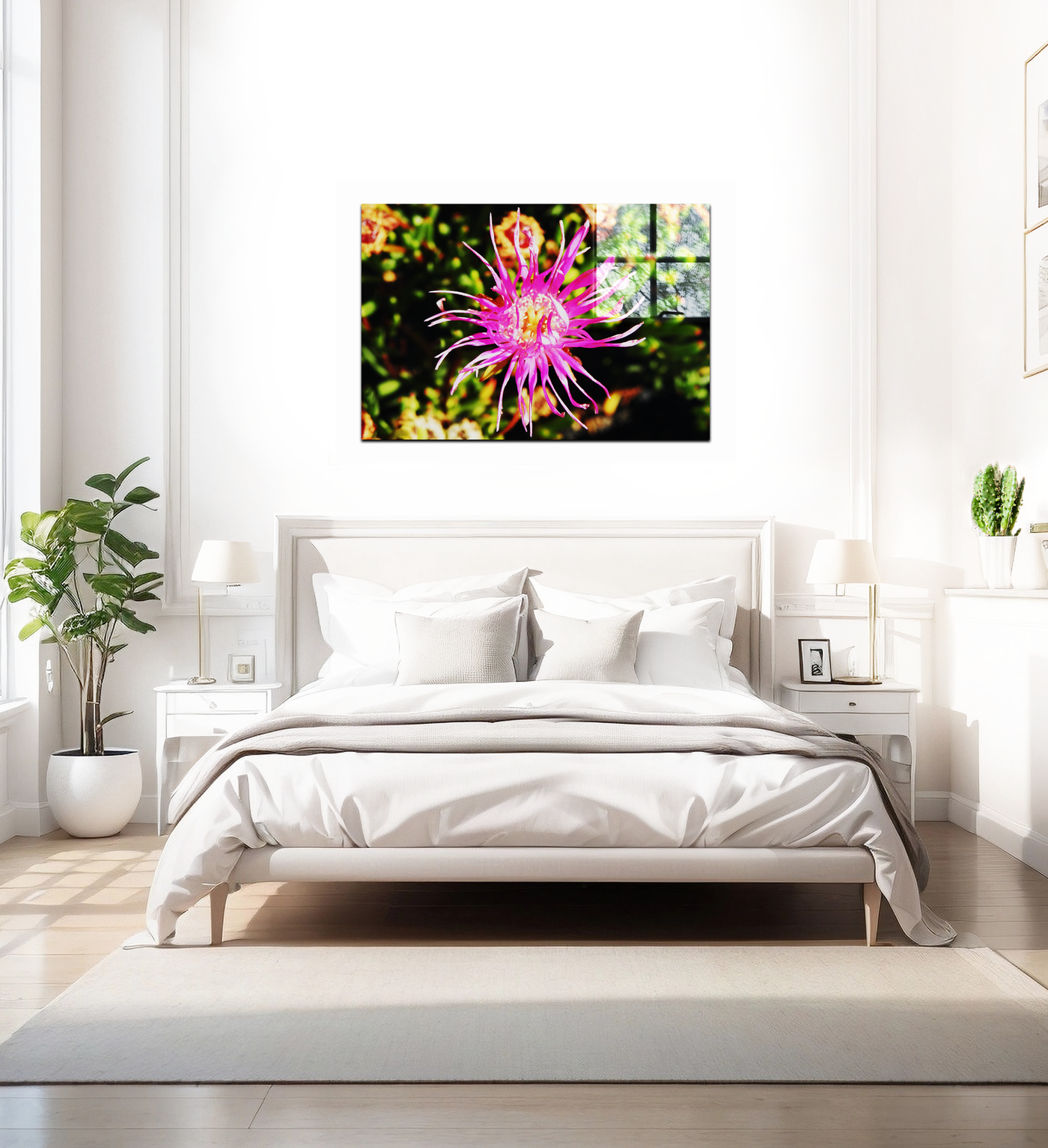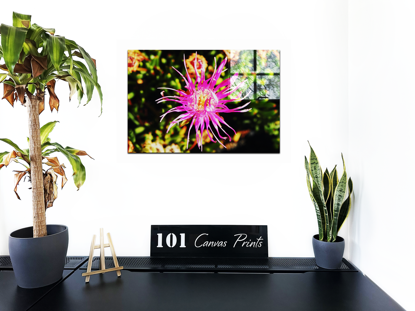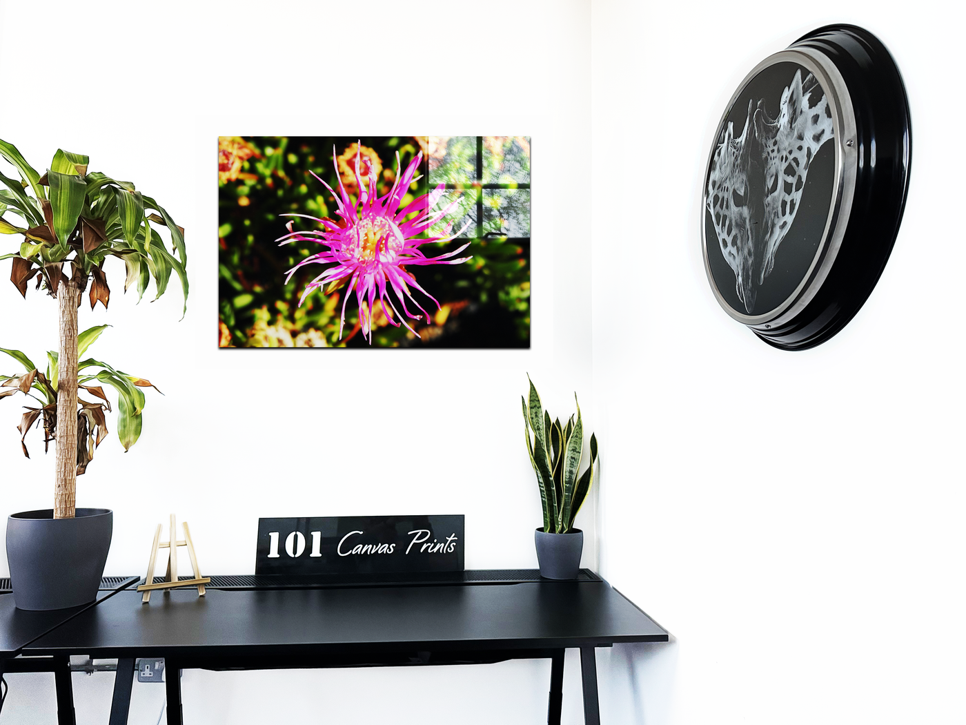 The acrylic-set medium takes this already striking image to new heights of visual impact. The glossy finish intensifies the vibrant colours, making the pink flower appear to glow against the lush green background. This treatment also adds depth to the image, enhancing the three-dimensional quality of the flower and creating the illusion that it's bursting from the surface. Our expert team at 101 Canvas Prints has meticulously reproduced every detail captured by our skilled photographers, ensuring that this piece will be a showstopper in any setting. It would be particularly impactful in a contemporary dining area, a bright home office, or as a statement piece in a neutral-toned living room, where its vivid colours and dynamic composition can truly shine.