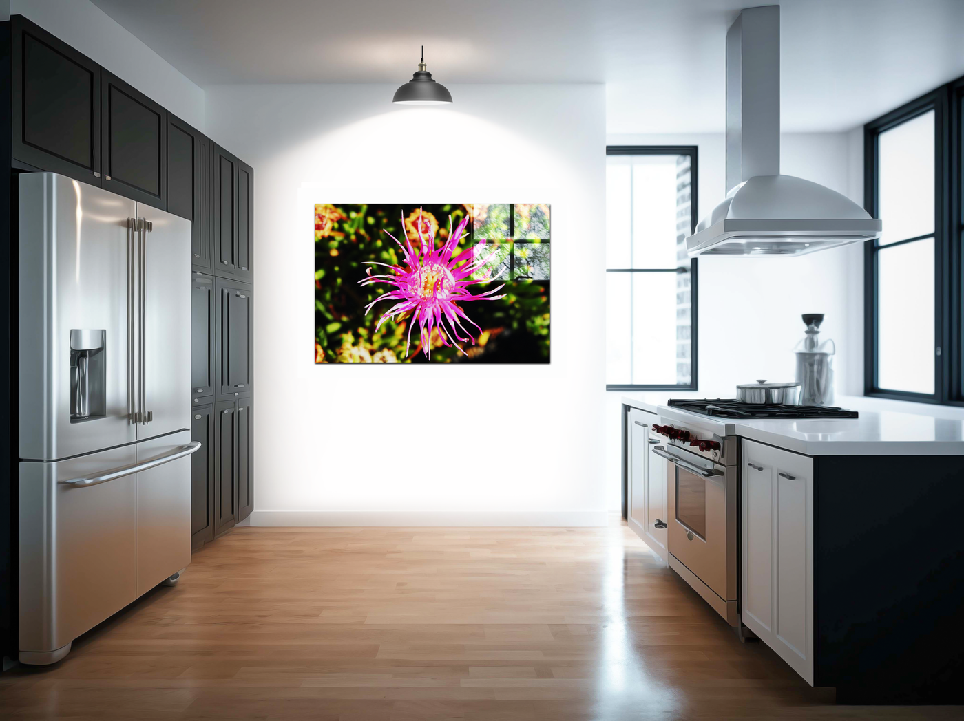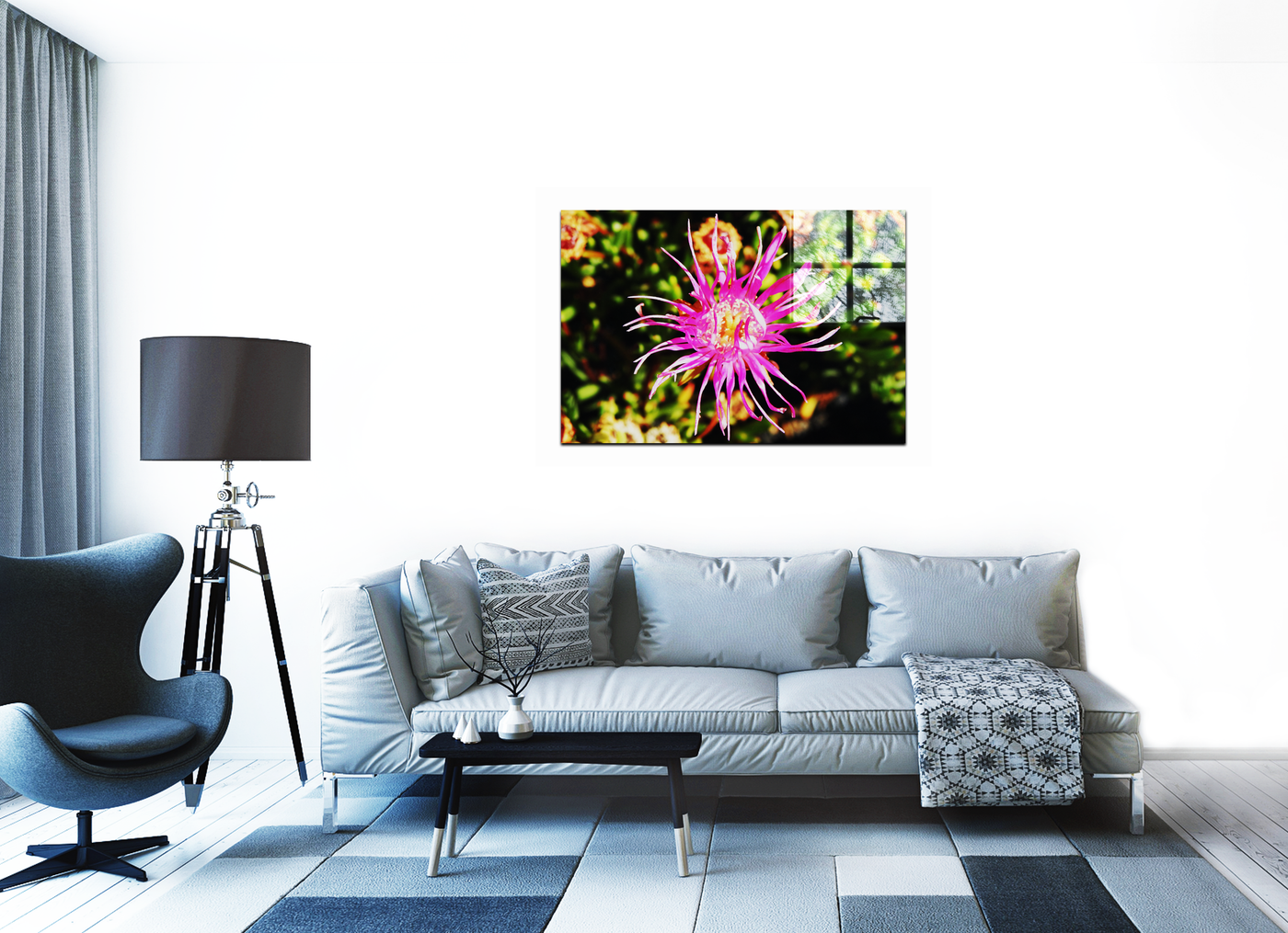 This breathtaking acrylic-set print captures the explosive energy of a vibrant pink wildflower, likely a thistle species, in exquisite detail. The composition places the flower at the forefront, its spiky petals radiating outwards in a spectacular display of nature's artistry. The surrounding greenery provides depth and context, enhancing the flower's dramatic impact.