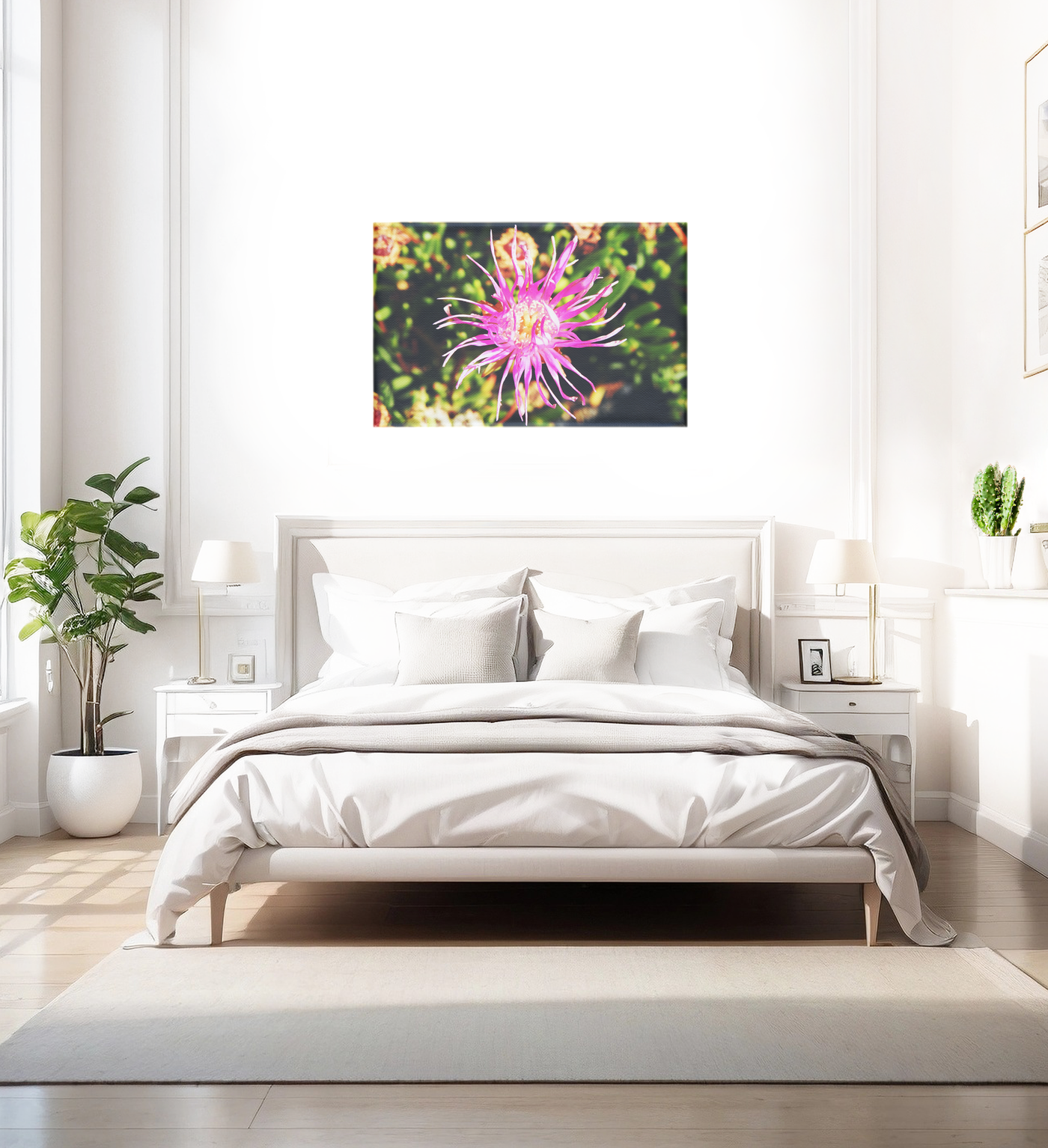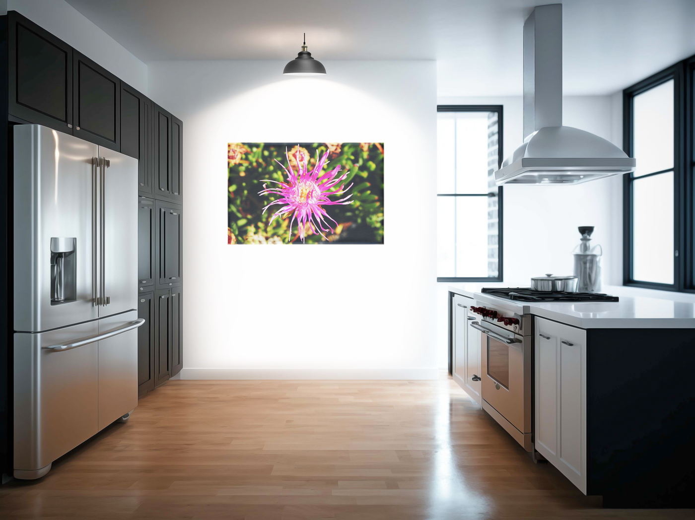 This captivating Canvas print showcases the explosive beauty of a vivid pink wildflower, likely a species of thistle, in full bloom. The composition centres on the flower's intricate structure, with its delicate, spiky petals radiating outwards like a natural firework frozen in time. The surrounding greenery provides a lush backdrop, enhancing the flower's dramatic presence.