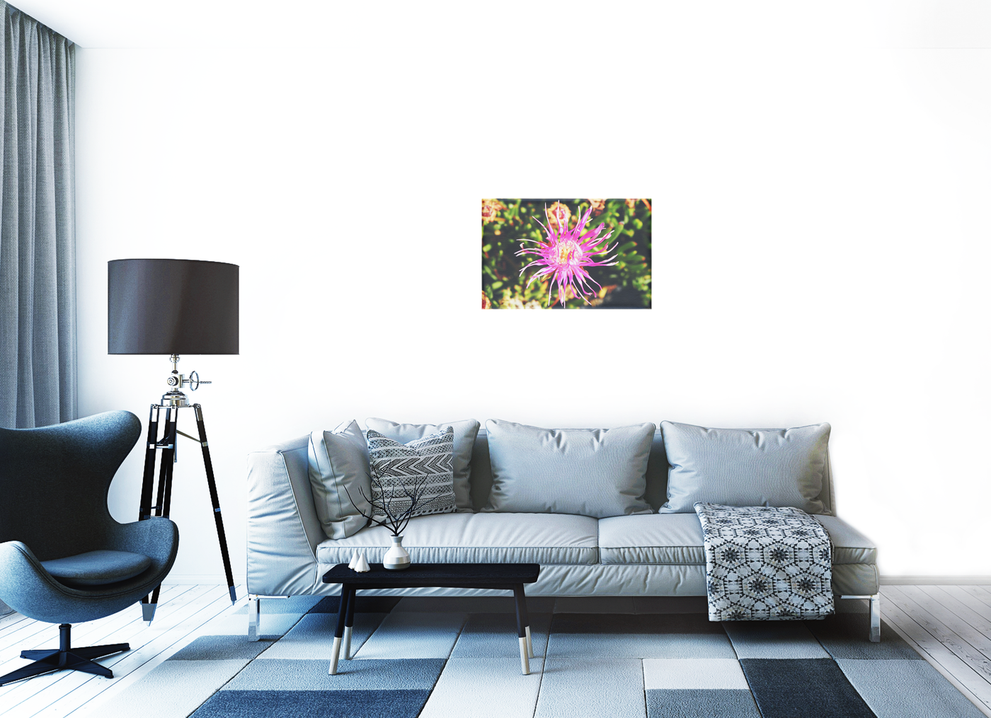 This captivating Canvas print showcases the explosive beauty of a vivid pink wildflower, likely a species of thistle, in full bloom. The composition centres on the flower's intricate structure, with its delicate, spiky petals radiating outwards like a natural firework frozen in time. The surrounding greenery provides a lush backdrop, enhancing the flower's dramatic presence.
