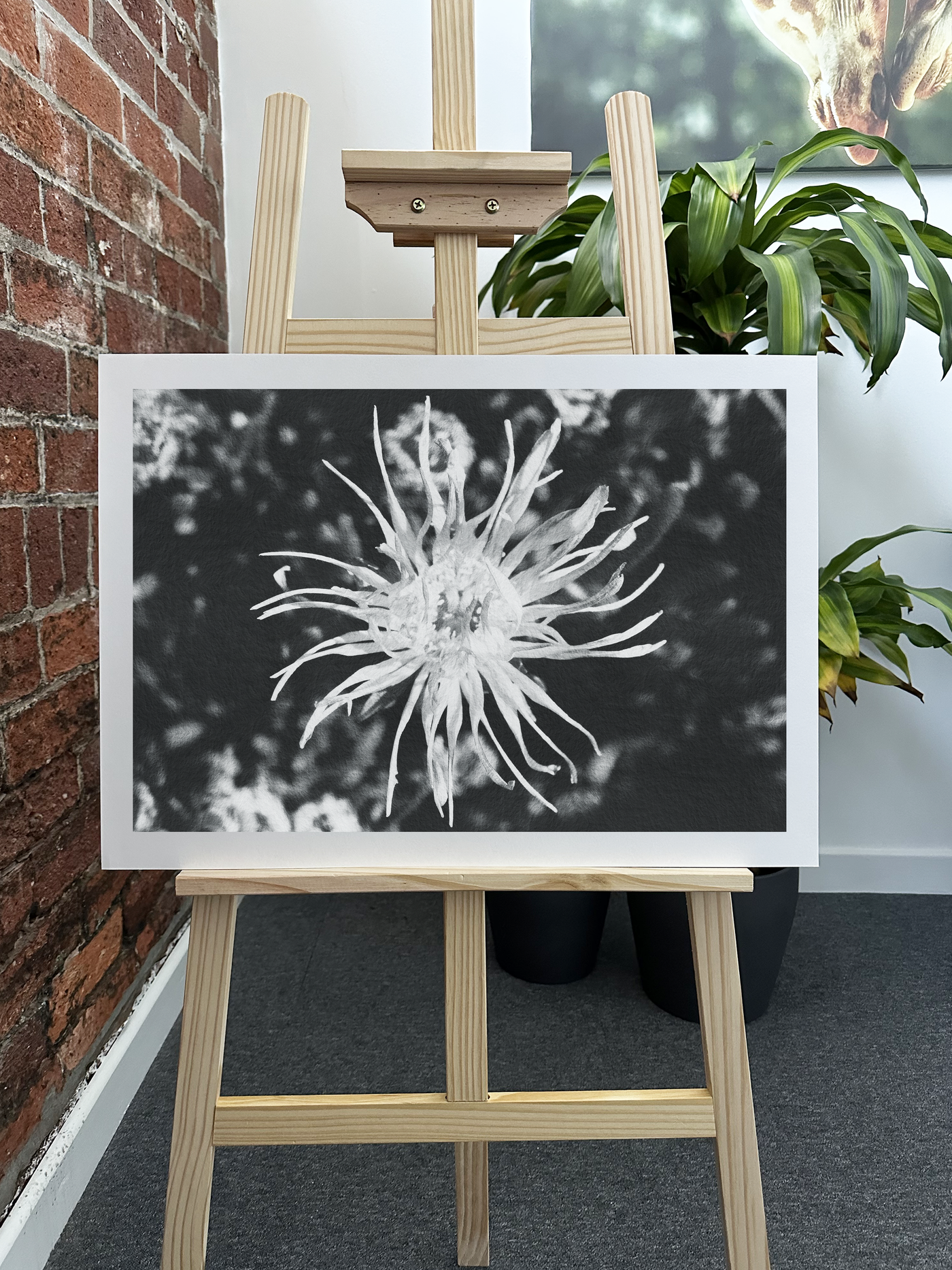 This captivating Monochrome Fine Art print showcases the explosive beauty of a vivid wildflower, likely a species of thistle, in full bloom. The composition centres on the flower's intricate structure, with its delicate, spiky petals radiating outwards like a natural firework frozen in time. The surrounding greenery provides a lush backdrop, enhancing the flower's dramatic presence.