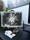 This captivating Monochrome Fine Art print showcases the explosive beauty of a vivid wildflower, likely a species of thistle, in full bloom. The composition centres on the flower's intricate structure, with its delicate, spiky petals radiating outwards like a natural firework frozen in time. The surrounding greenery provides a lush backdrop, enhancing the flower's dramatic presence.