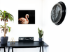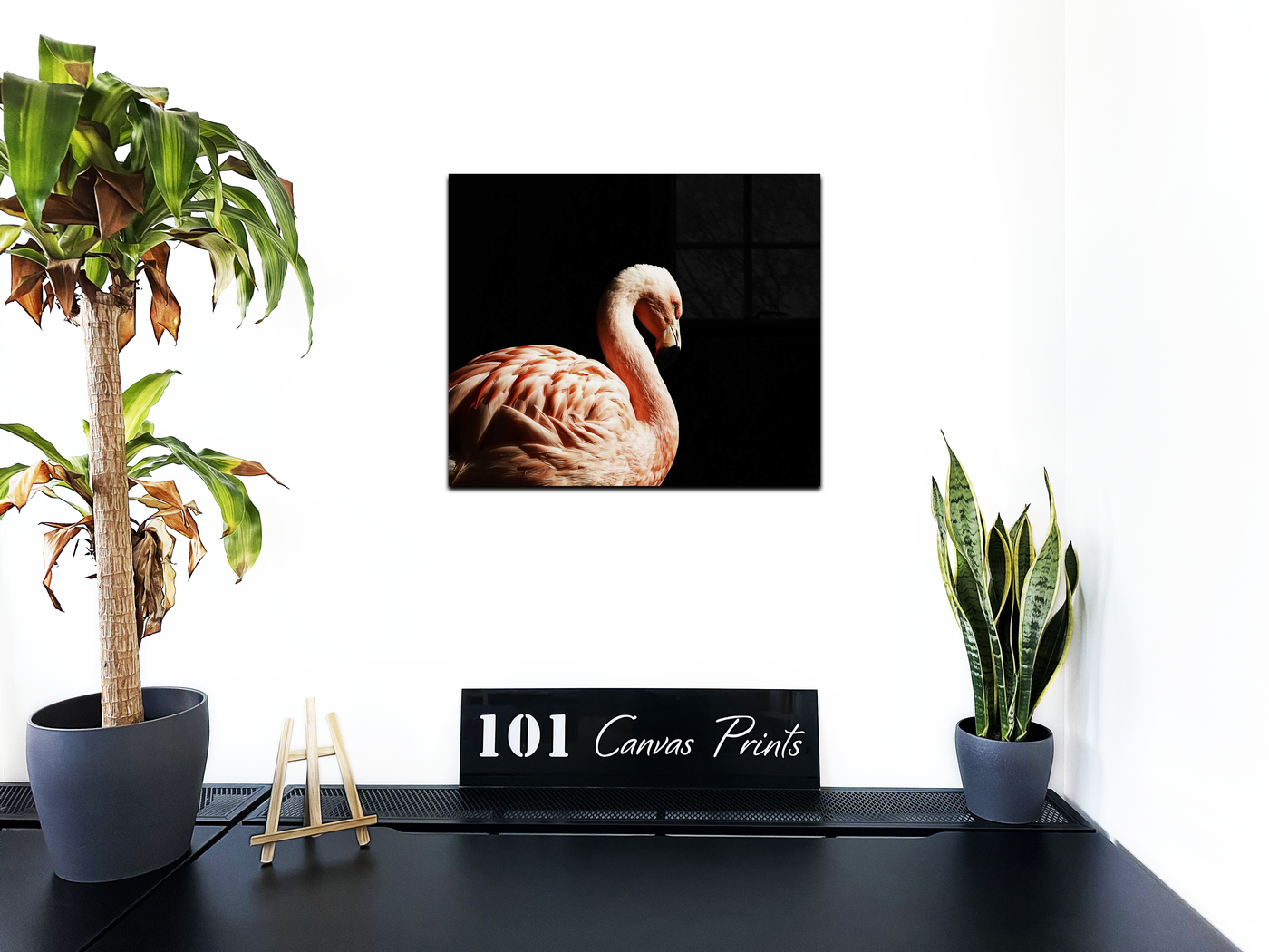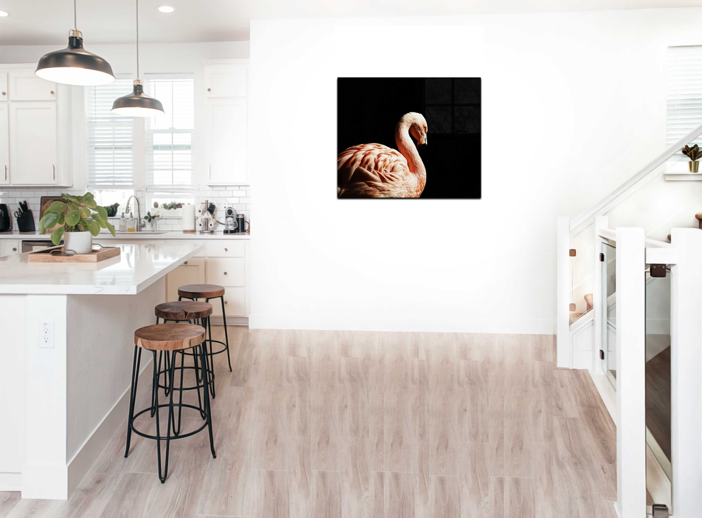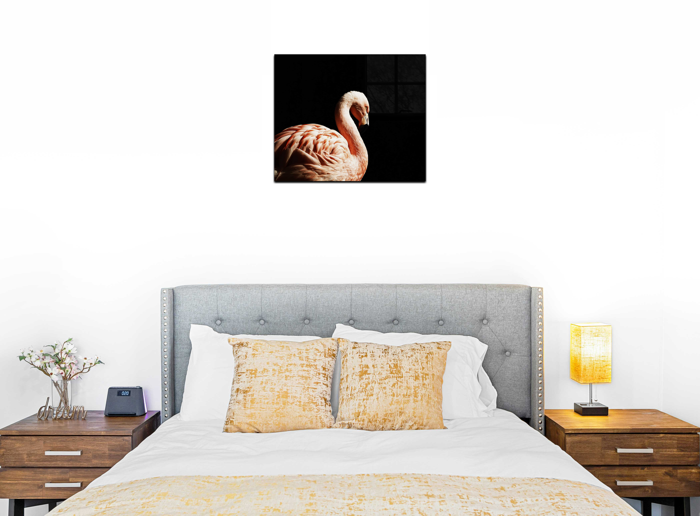 As an acrylic-set print, this image takes on a new dimension of depth and vibrancy. The high-gloss finish of the Acrylic enhances the contrast between the flamingo and its dark surroundings, making the bird appear to glow against the backdrop. The Acrylic medium intensifies the pinks, bringing out their warmth and creating a lifelike quality that almost seems three-dimensional. This print would be a showstopping piece in a contemporary setting, perhaps in a minimalist dining room or as a focal point in a stylish office, where its dramatic composition and vivid colours would create a powerful visual impact.
