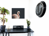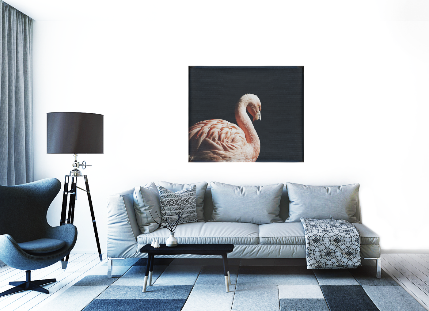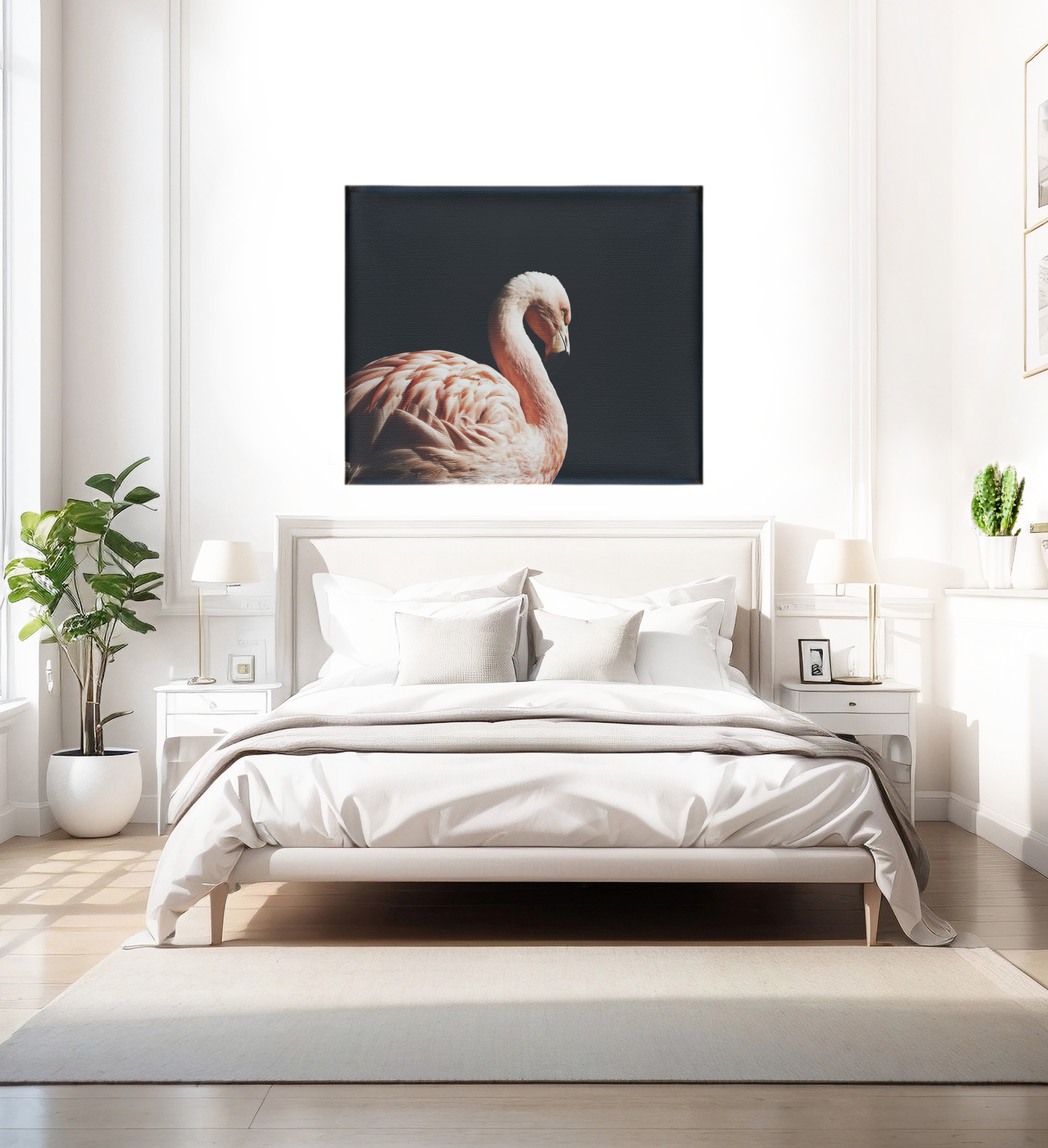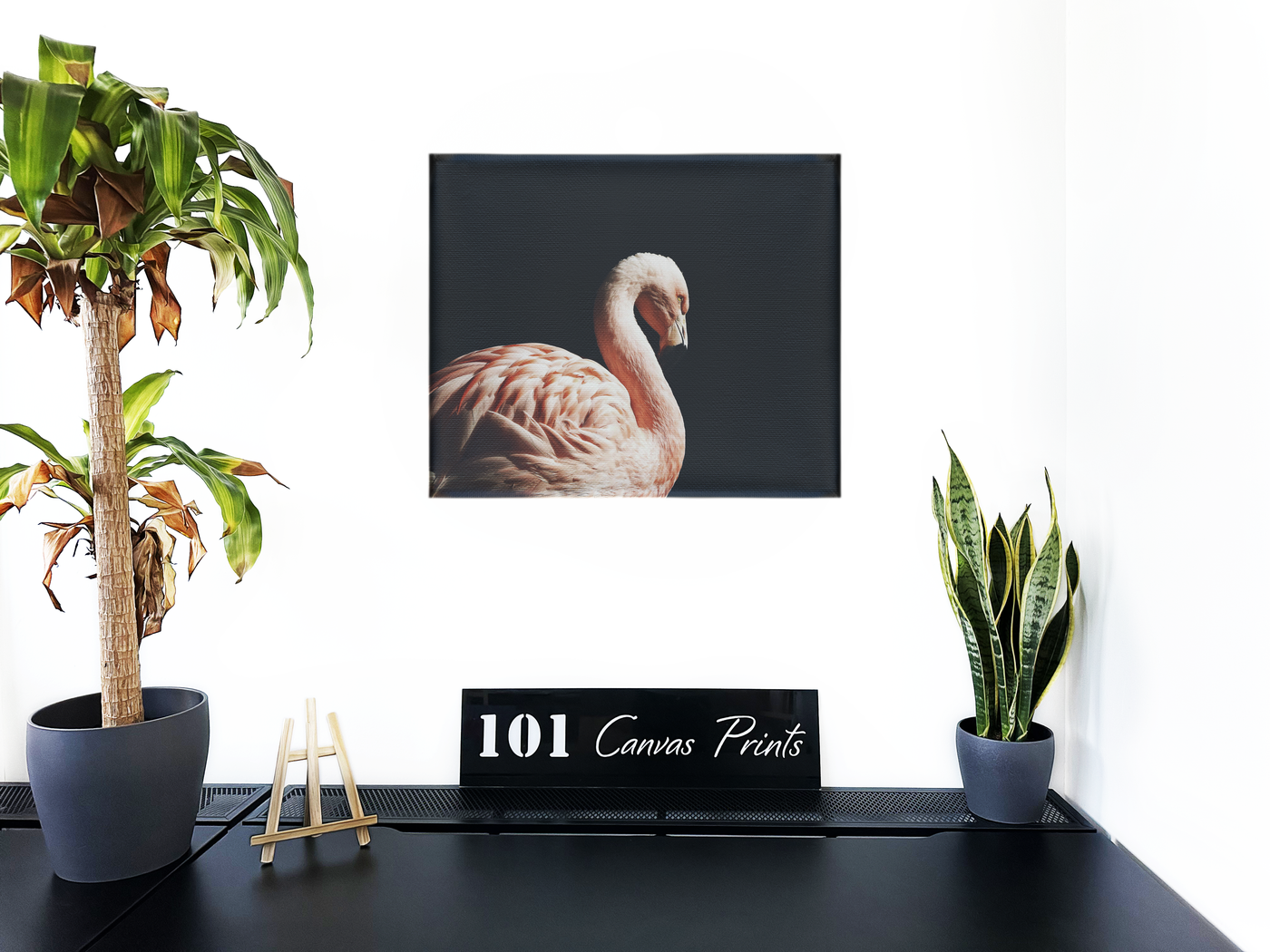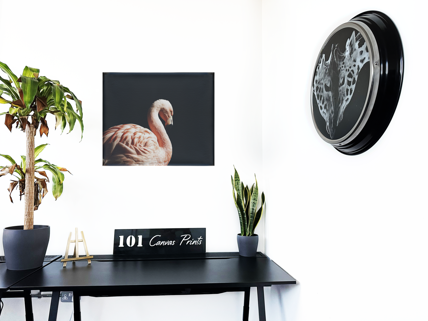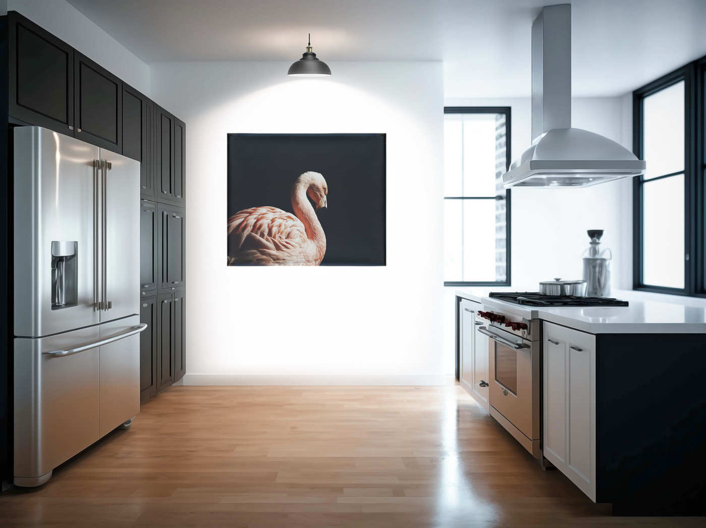 Rendered on Canvas, this image takes on a particularly painterly quality. The natural texture of the Canvas softens the contrast between the flamingo and the background, creating a more nuanced transition between light and shadow. This print would be a striking addition to a variety of interiors, from a sophisticated living room to a serene bedroom, where its combination of delicate colouration and dramatic composition could serve as a captivating focal point.