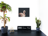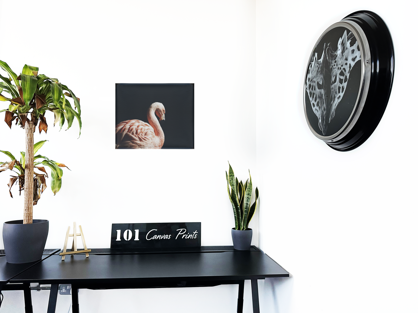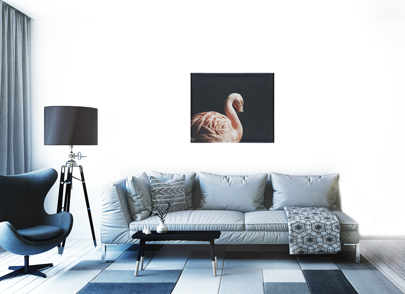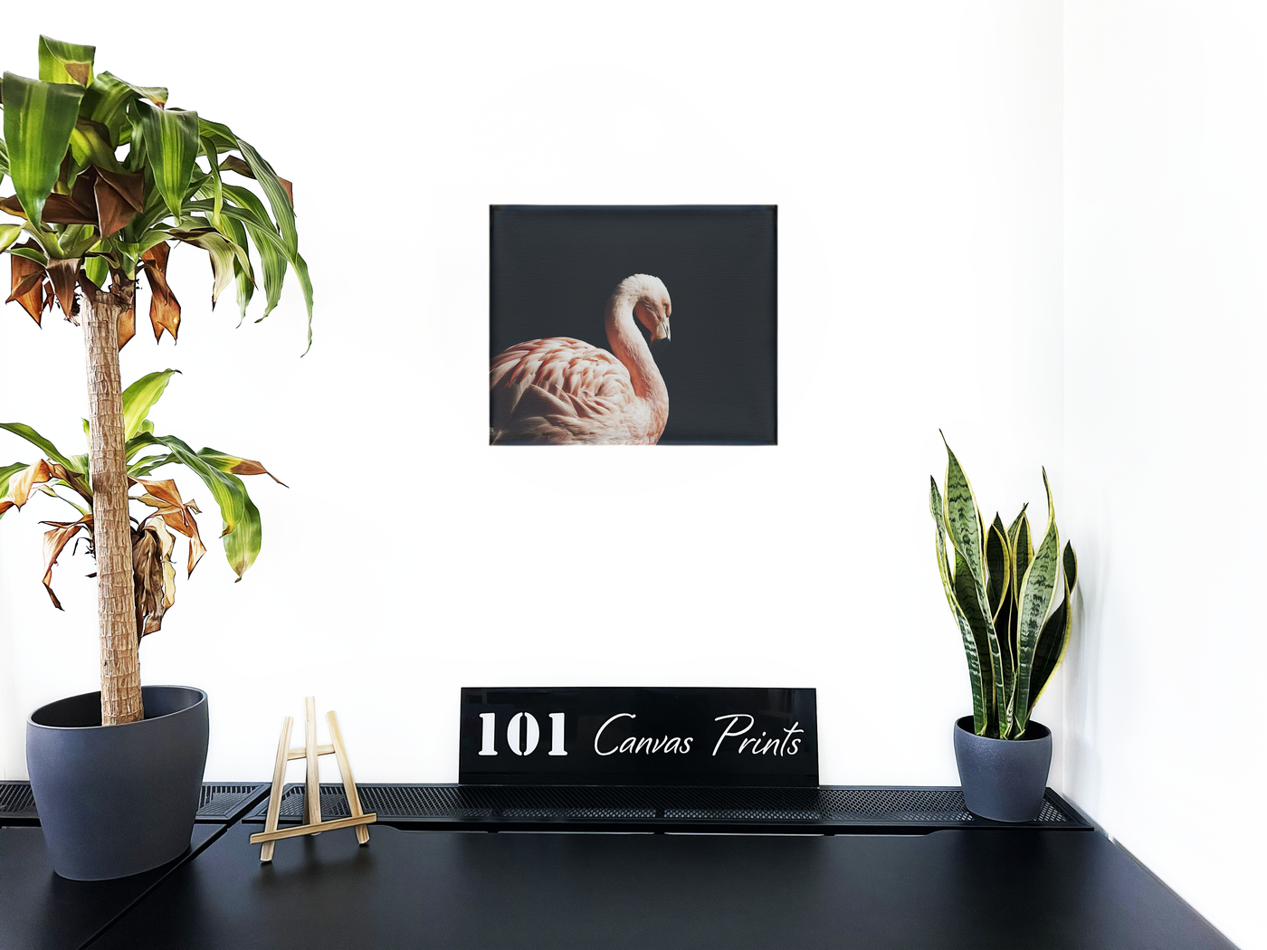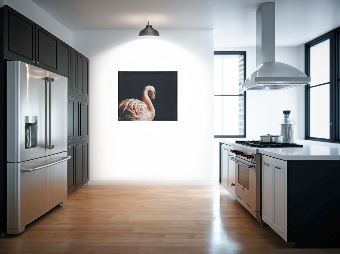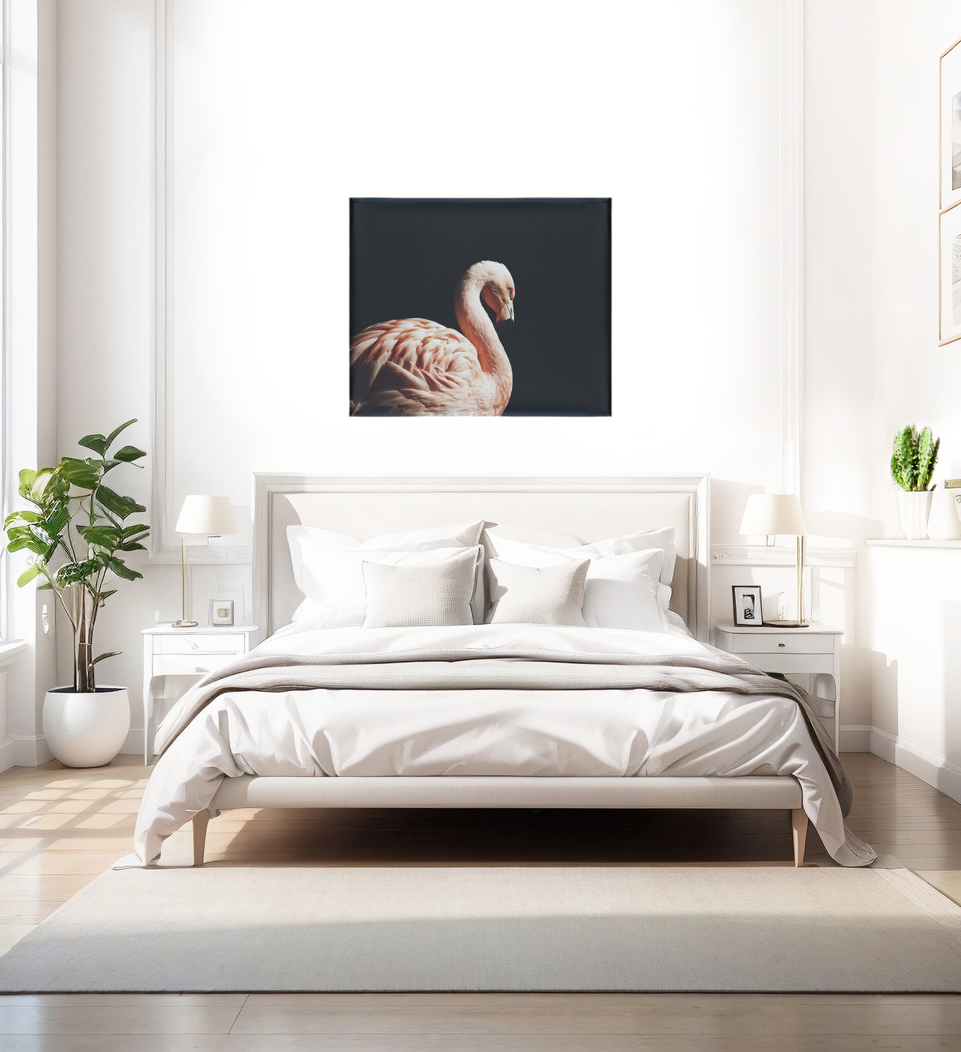 Rendered on Canvas, this image takes on a particularly painterly quality. The natural texture of the Canvas softens the contrast between the flamingo and the background, creating a more nuanced transition between light and shadow. This print would be a striking addition to a variety of interiors, from a sophisticated living room to a serene bedroom, where its combination of delicate colouration and dramatic composition could serve as a captivating focal point.
