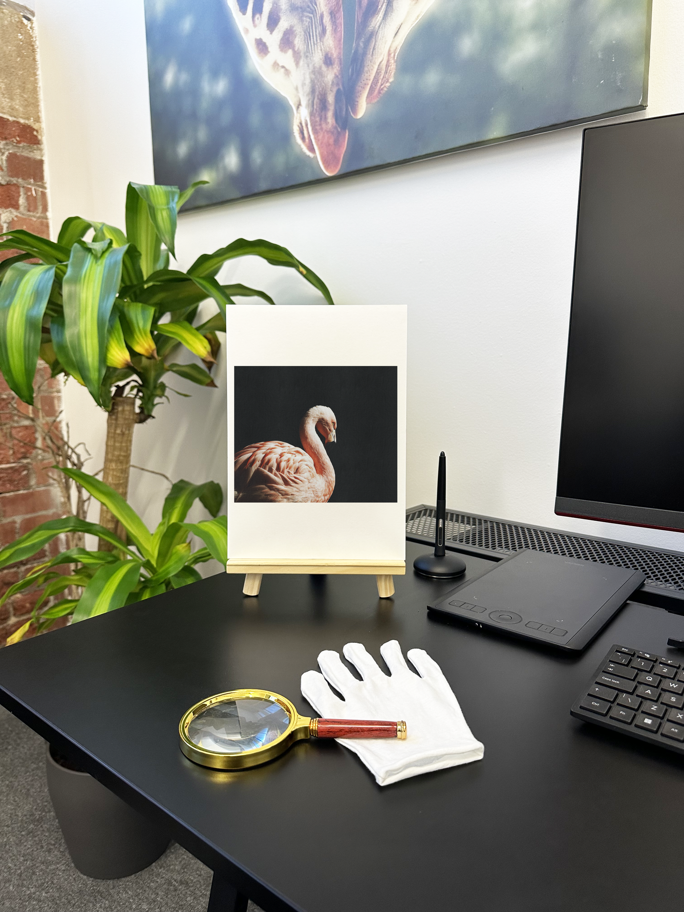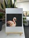 Rendered on Fine Art print paper, this image takes on a particularly painterly quality. The natural texture of the Fine Art print softens the contrast between the flamingo and the background, creating a more nuanced transition between light and shadow. This print would be a striking addition to a variety of interiors, from a sophisticated living room to a serene bedroom, where its combination of delicate colouration and dramatic composition could serve as a captivating focal point.