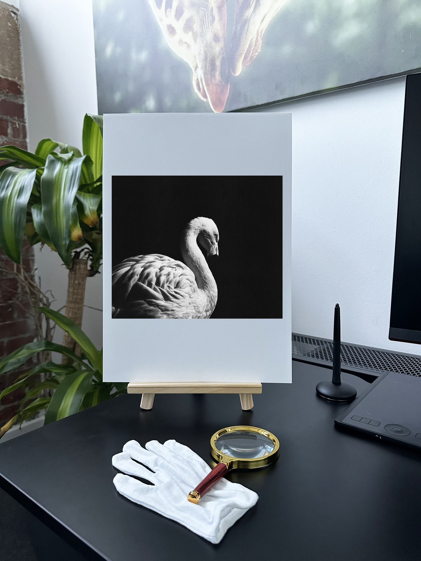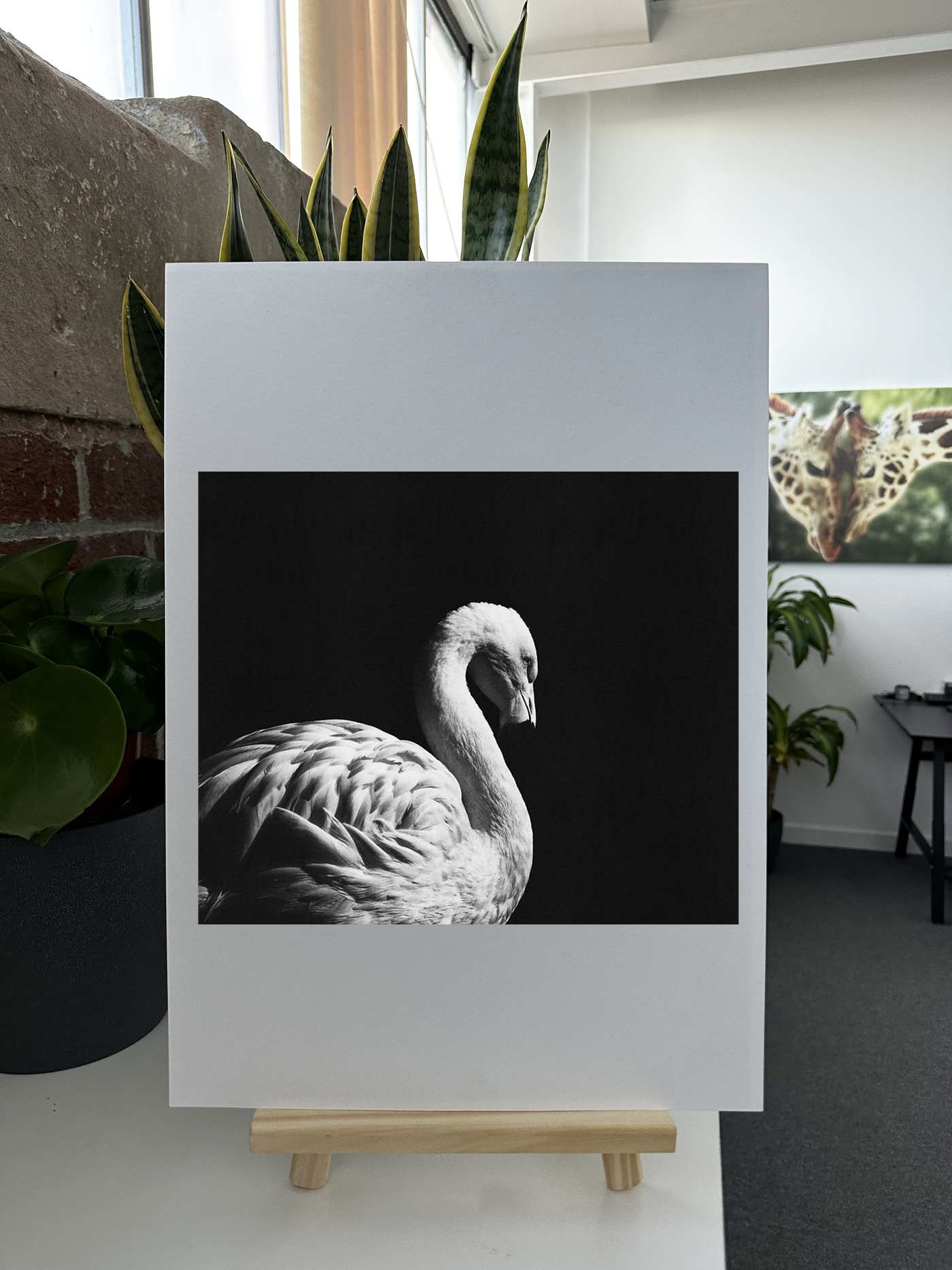 Rendered on Fine Art print paper, this image takes on a particularly painterly quality. The natural texture of the Monochrome Fine Art print softens the contrast between the flamingo and the background, creating a more nuanced transition between light and shadow. This print would be a striking addition to a variety of interiors, from a sophisticated living room to a serene bedroom, where its combination of delicate Monochromatic tonality and dramatic composition could serve as a captivating focal point.