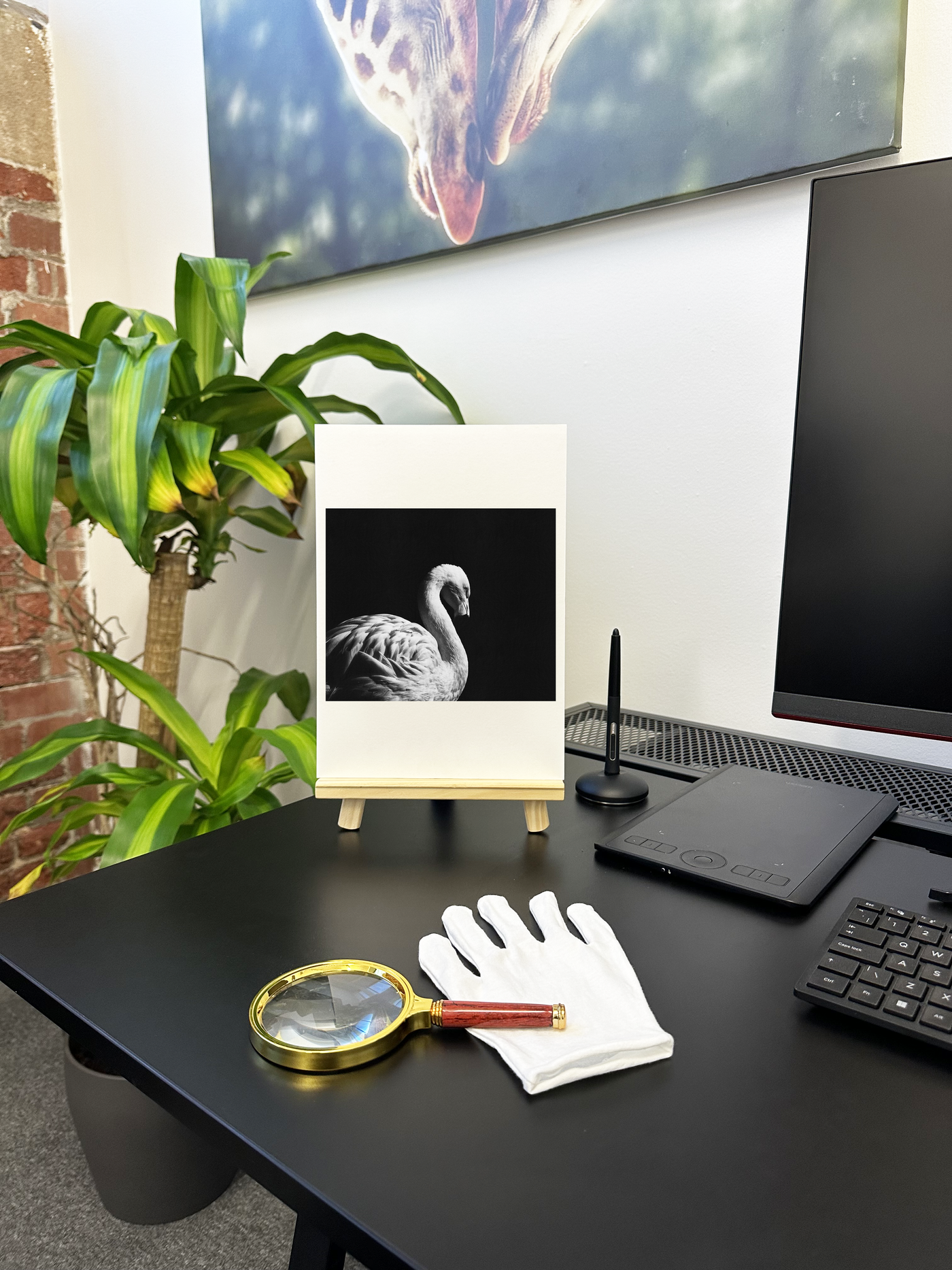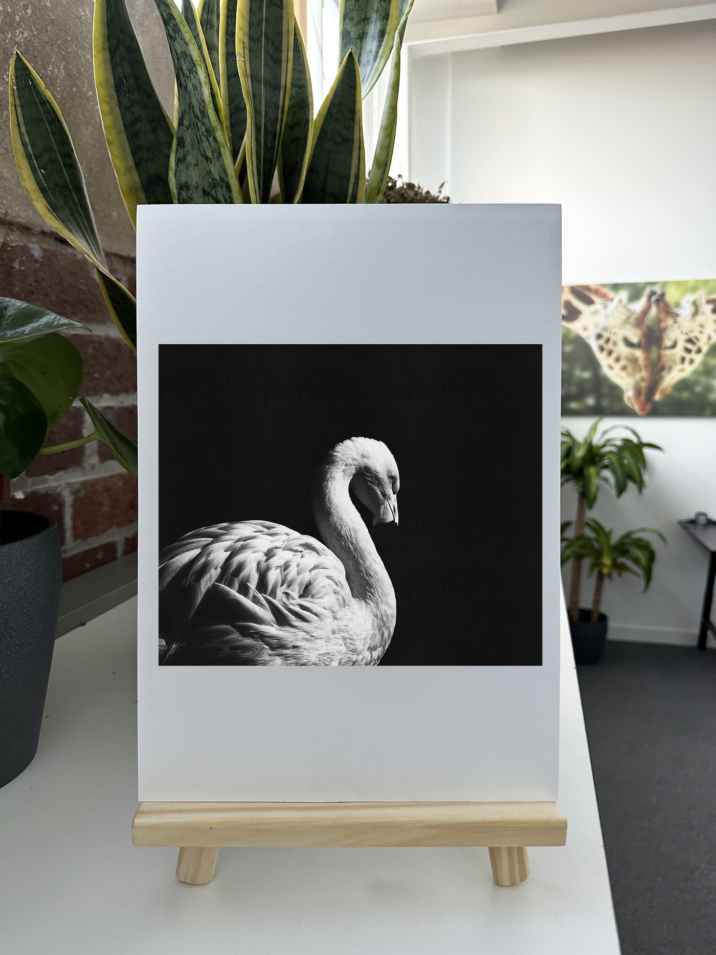 Rendered on Fine Art print paper, this image takes on a particularly painterly quality. The natural texture of the Monochrome Fine Art print softens the contrast between the flamingo and the background, creating a more nuanced transition between light and shadow. This print would be a striking addition to a variety of interiors, from a sophisticated living room to a serene bedroom, where its combination of delicate Monochromatic tonality and dramatic composition could serve as a captivating focal point.