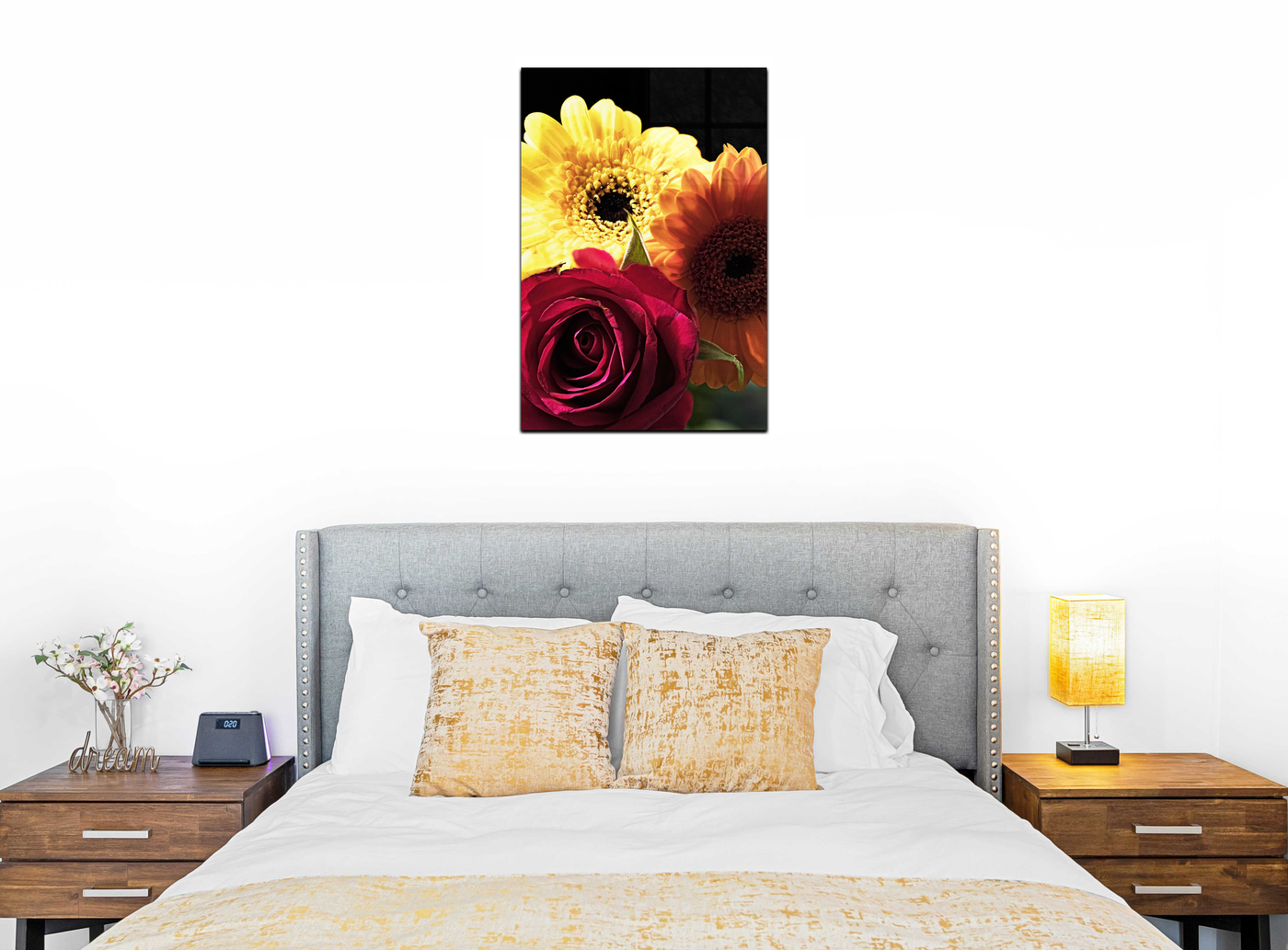 The photographer's mastery of light brings out an extraordinary range of tones within each flower, from the deep burgundy shadows within the rose to the brilliant yellow highlights of the gerberas. Through our precise photography and print enhancement process, we've maintained every nuance of colour and texture, from the smooth curves of rose petals to the intricate detail of the daisies' centres. The dark background provides perfect contrast, allowing each flower to command attention while contributing to the overall harmony.