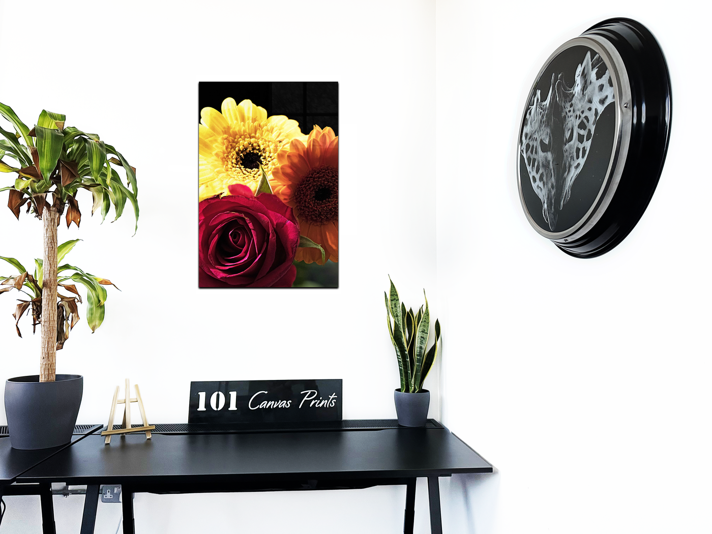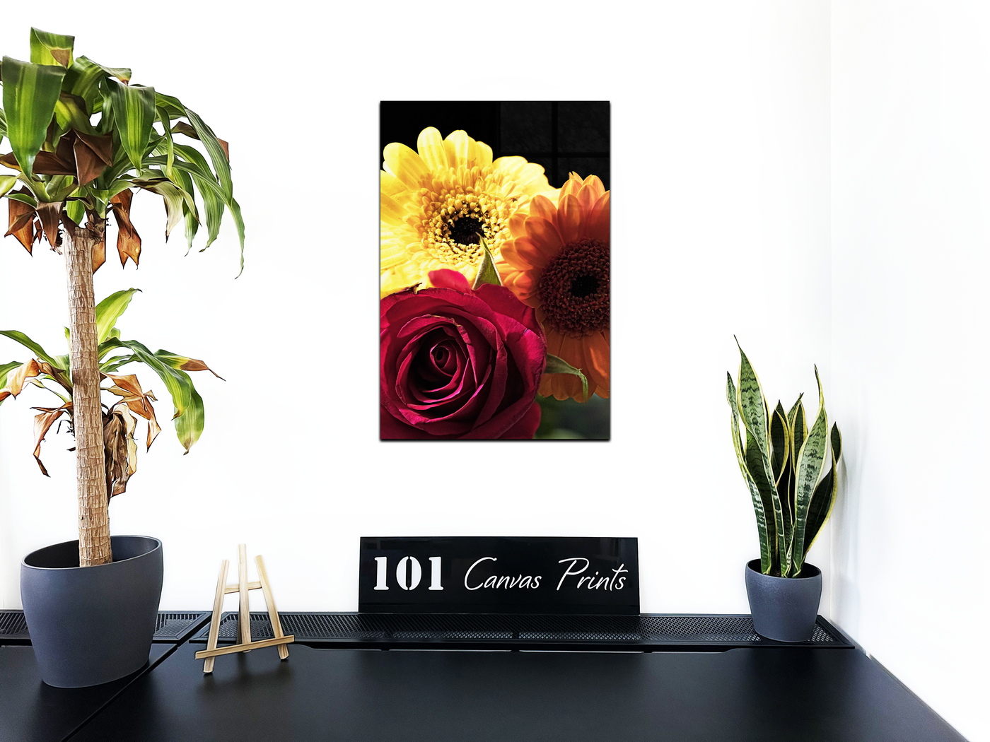 This stunning floral composition, expertly reproduced by the 101 Canvas Prints team, creates a harmonious dialogue between different flower varieties and colours. The photograph artfully combines the sophisticated elegance of a deep red rose with the sunny optimism of yellow gerbera daisies, creating a balanced arrangement that speaks to both refinement and joy. The careful positioning of each bloom creates a natural movement through the composition, from intimate detail to broader forms.
