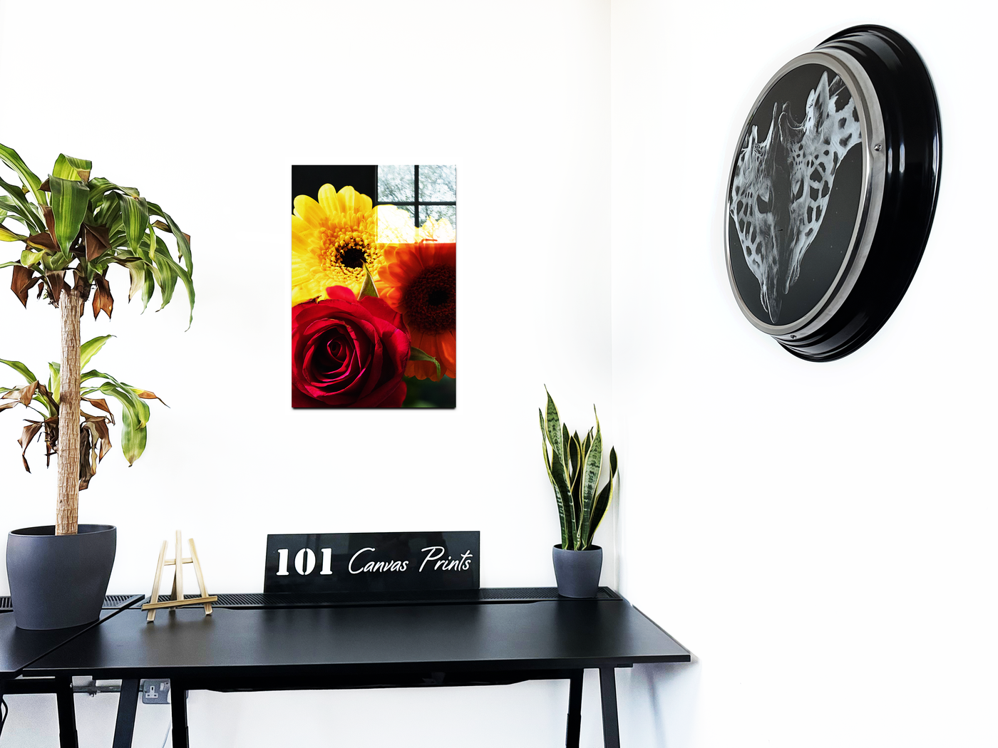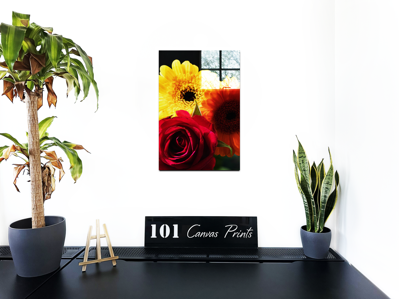 This stunning floral composition, expertly reproduced by the 101 Canvas Prints team, creates a harmonious dialogue between different flower varieties and colours. The photograph artfully combines the sophisticated elegance of a deep red rose with the sunny optimism of yellow gerbera daisies, creating a balanced arrangement that speaks to both refinement and joy. The careful positioning of each bloom creates a natural movement through the composition, from intimate detail to broader forms.