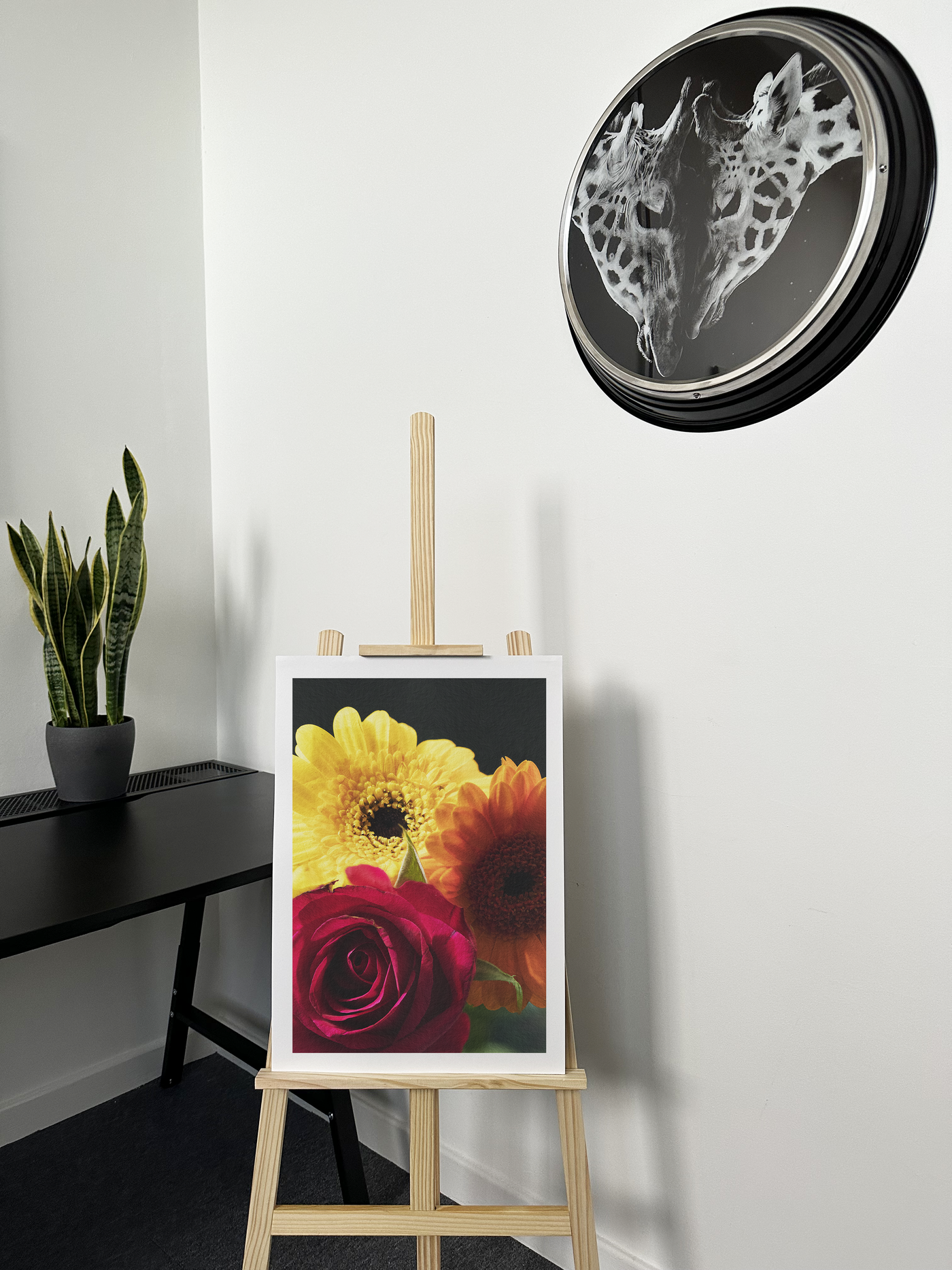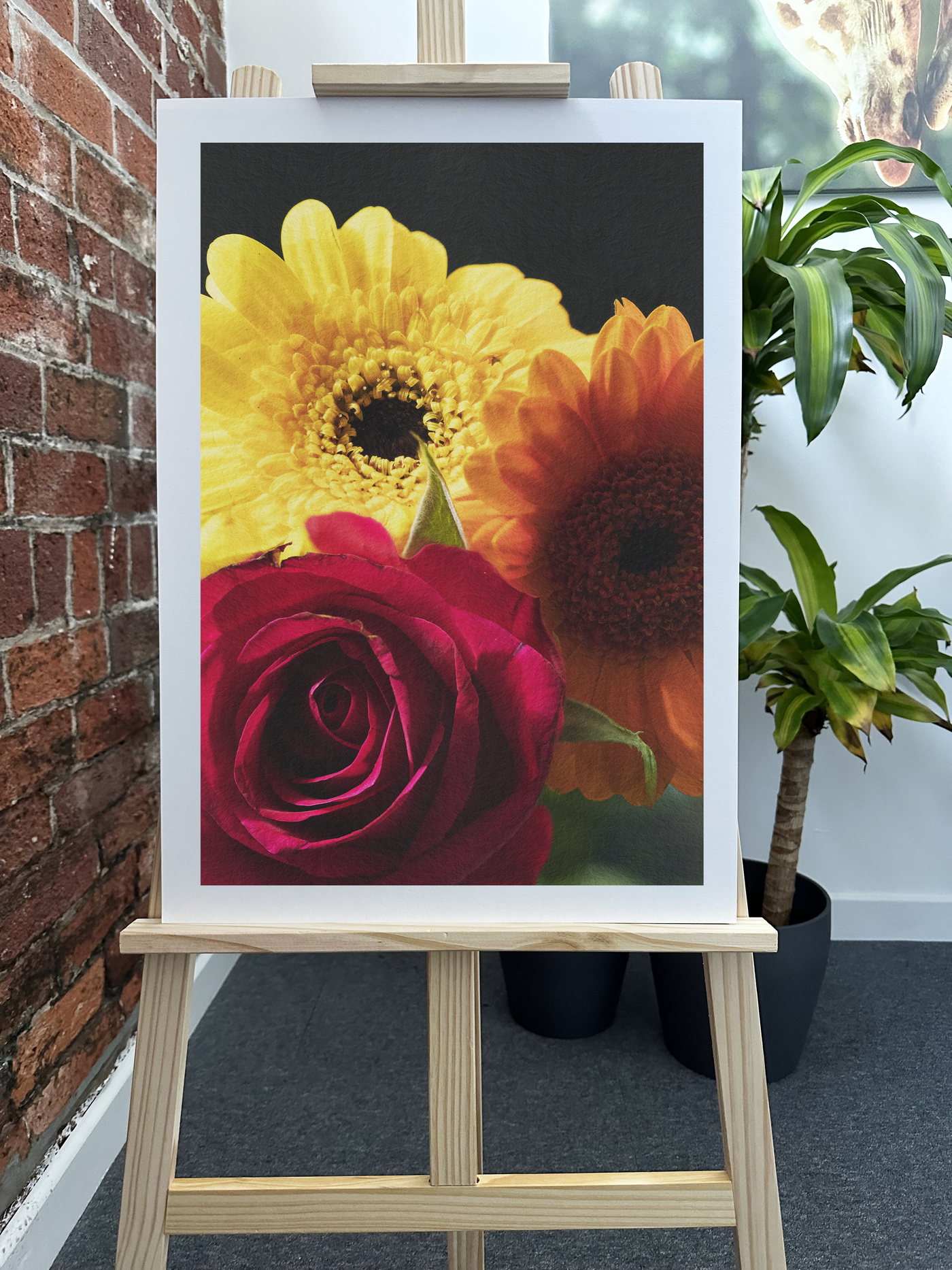Reproduced on our premium Fine Art paper, this floral arrangement takes on an additional layer of artistic refinement. The natural, matte finish of the Fine Art print softens the intense colours just enough to create a sophisticated gallery-quality appearance while maintaining the photograph's vibrant impact. This piece would make a stunning addition to any space where its celebration of natural beauty can lift spirits and add warmth, from a contemporary living room to a professional office environment.