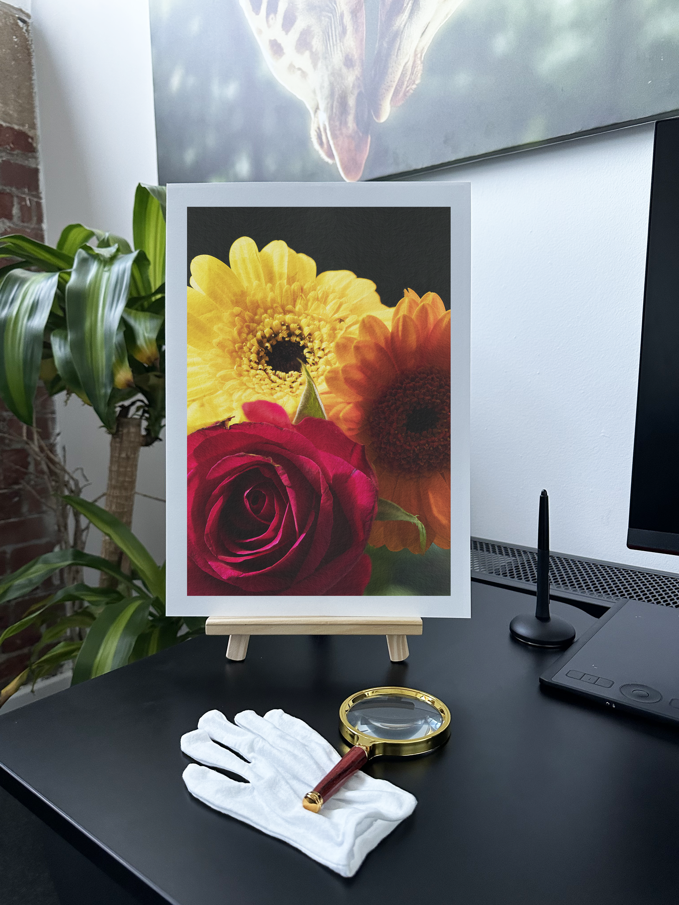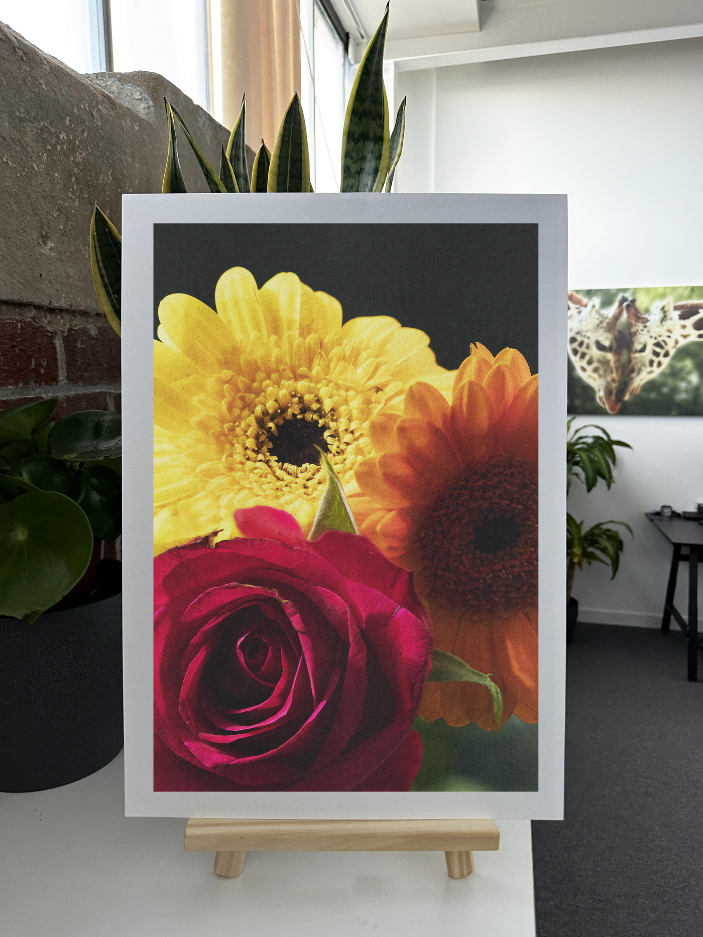 Reproduced on our premium Fine Art paper, this floral arrangement takes on an additional layer of artistic refinement. The natural, matte finish of the Fine Art print softens the intense colours just enough to create a sophisticated gallery-quality appearance while maintaining the photograph's vibrant impact. This piece would make a stunning addition to any space where its celebration of natural beauty can lift spirits and add warmth, from a contemporary living room to a professional office environment.