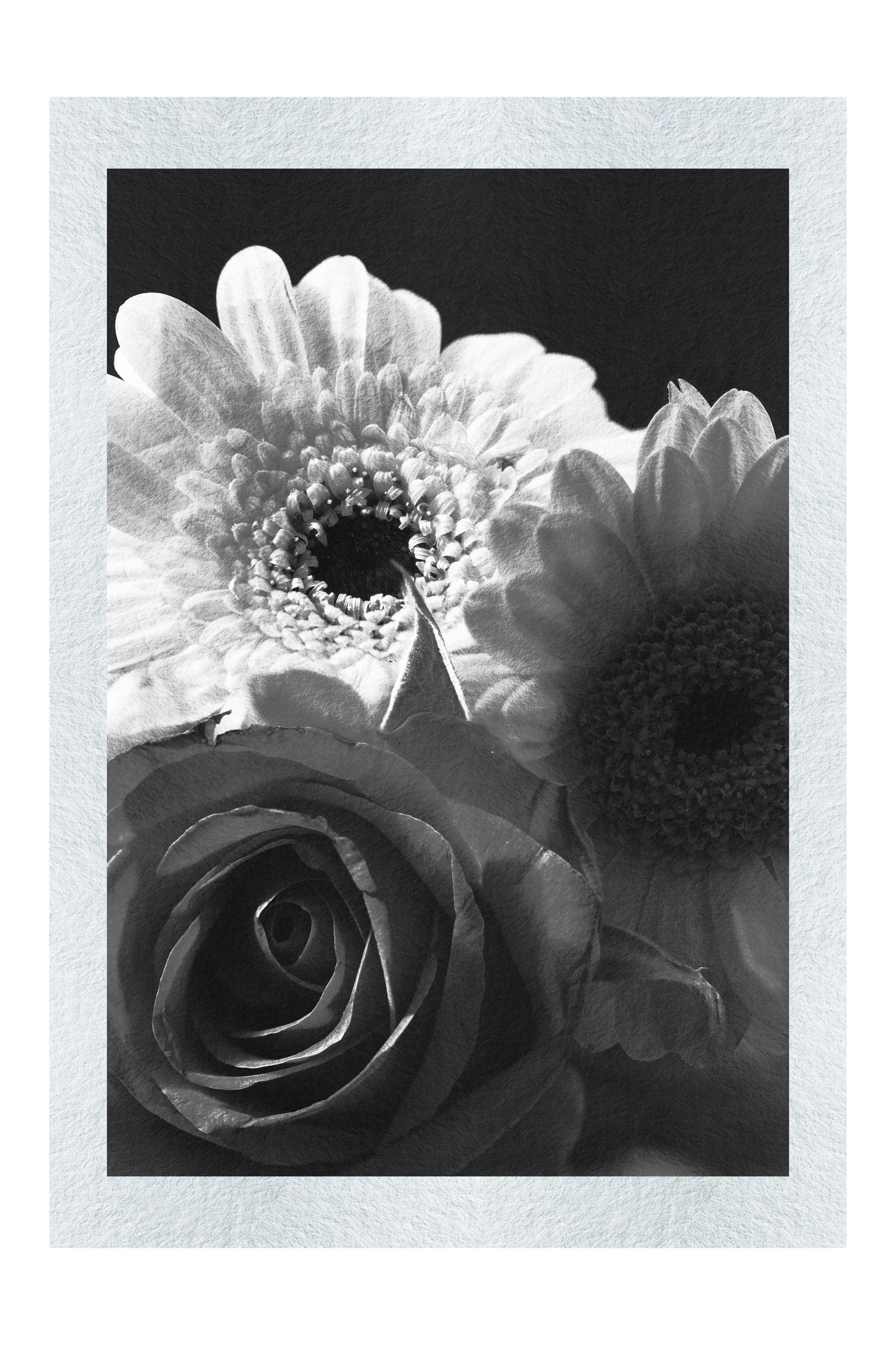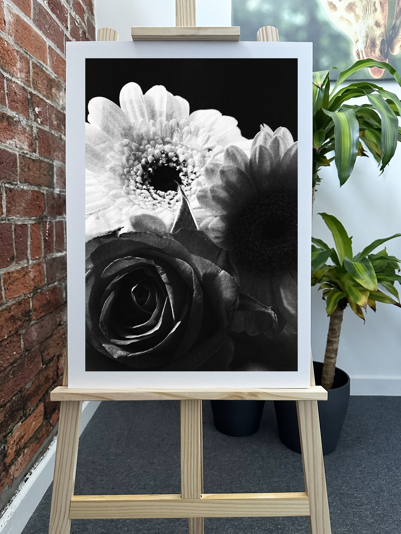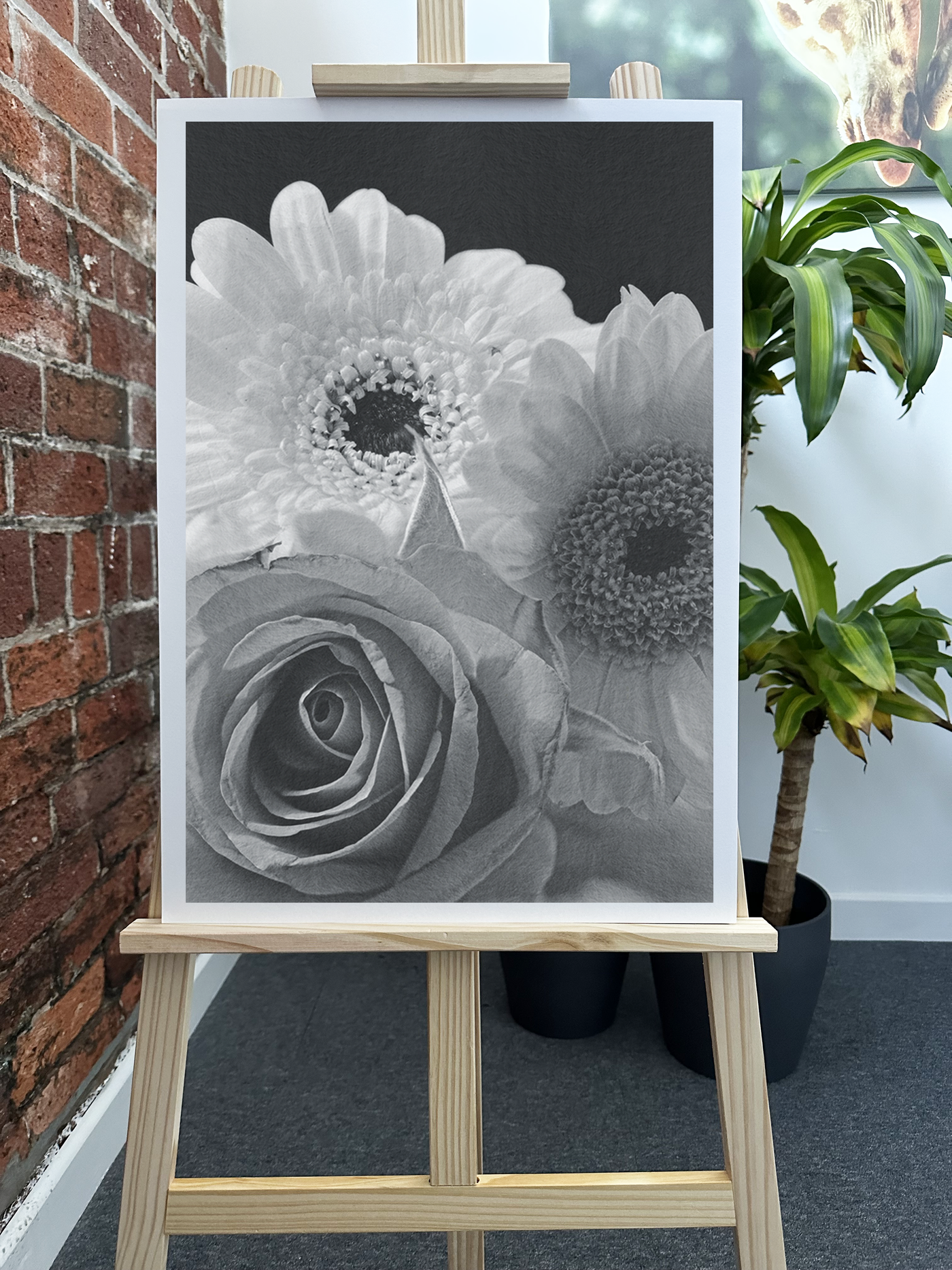 The Monochrome palette is rich and complementary, combining the deep hues of the rose with bright, cheerful tones of the gerberas. Our print enhancement team have carefully preserved every subtle detail of the flowers' textures, from the velvety surface of the rose petals to the intricate patterns of the gerberas' centres. The dark background adds depth and drama, allowing each bloom to stand out with remarkable clarity.