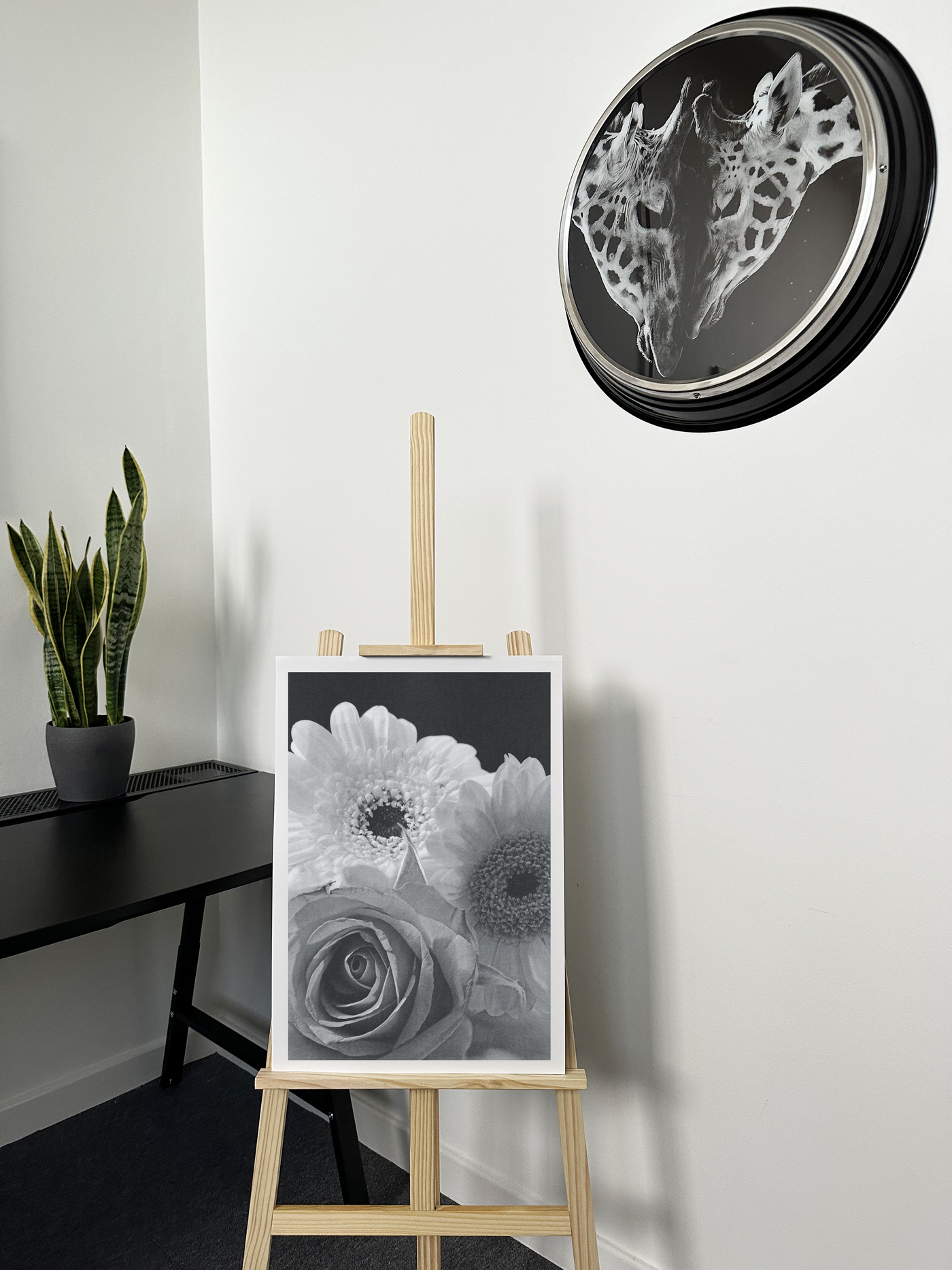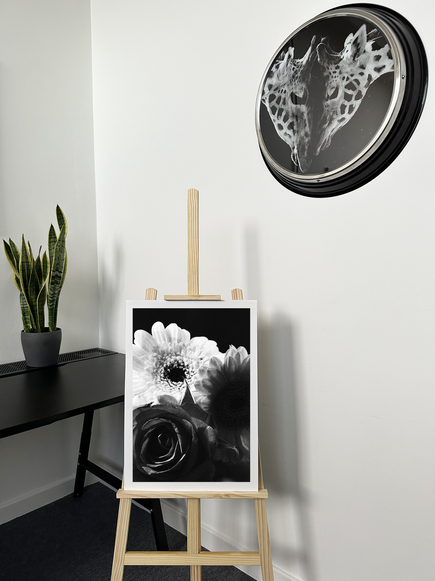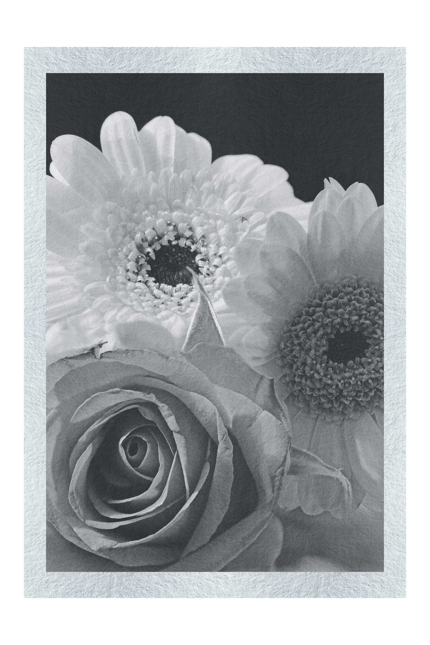 The Monochrome palette is rich and complementary, combining the deep hues of the rose with bright, cheerful tones of the gerberas. Our print enhancement team have carefully preserved every subtle detail of the flowers' textures, from the velvety surface of the rose petals to the intricate patterns of the gerberas' centres. The dark background adds depth and drama, allowing each bloom to stand out with remarkable clarity.
