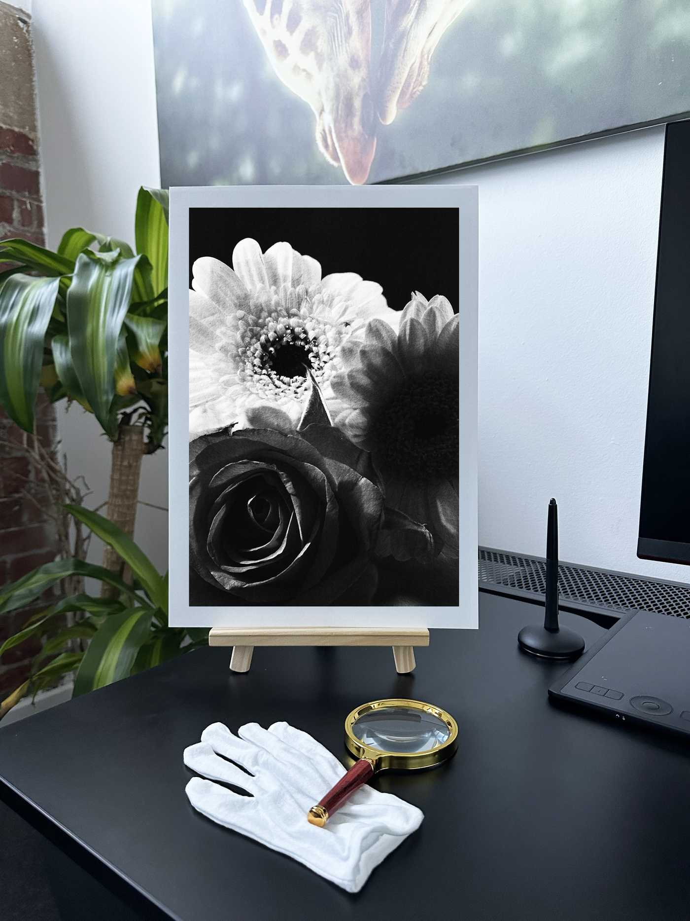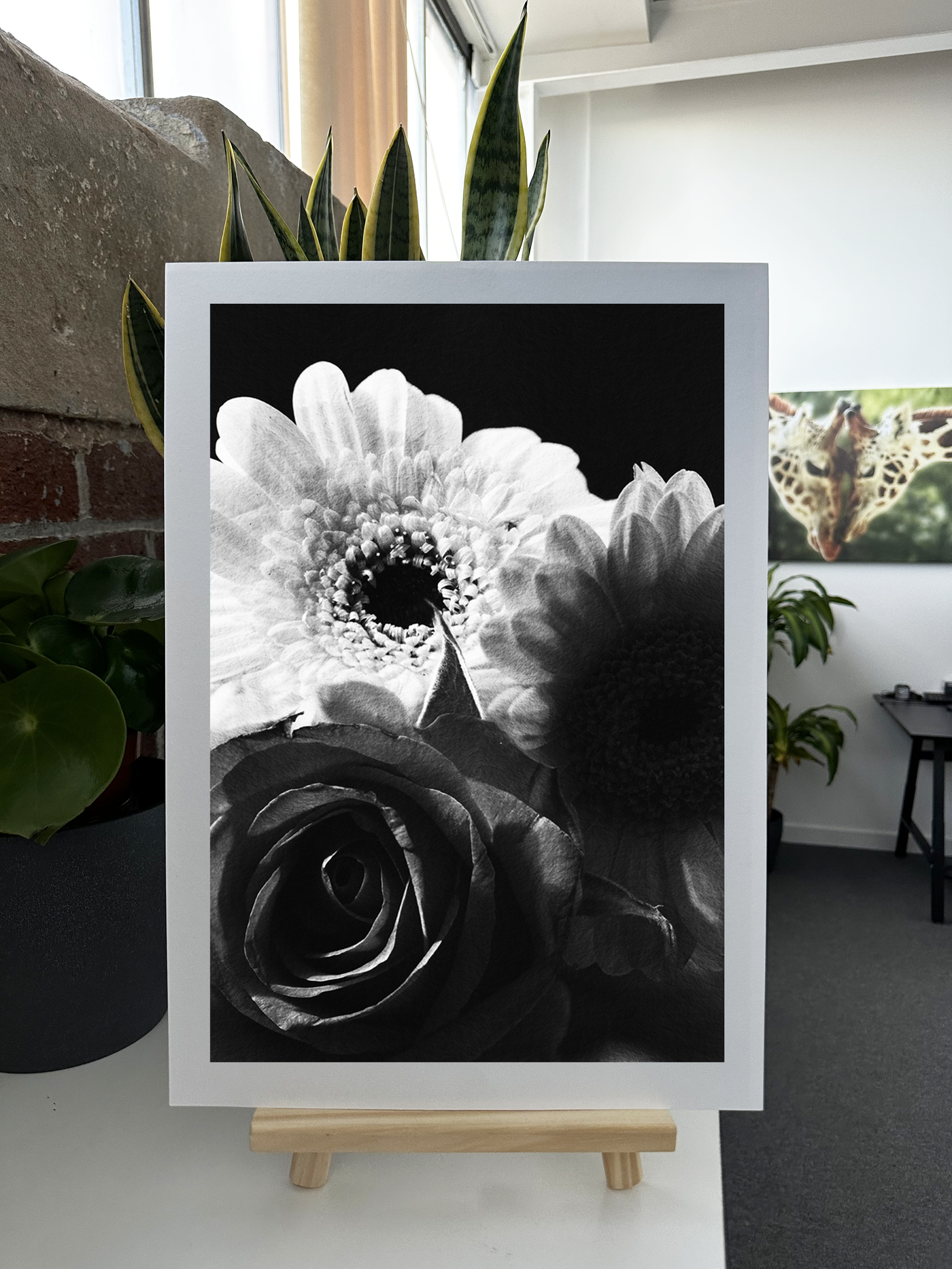 The Monochrome palette is rich and complementary, combining the deep hues of the rose with bright, cheerful tones of the gerberas. Our print enhancement team have carefully preserved every subtle detail of the flowers' textures, from the velvety surface of the rose petals to the intricate patterns of the gerberas' centres. The dark background adds depth and drama, allowing each bloom to stand out with remarkable clarity.