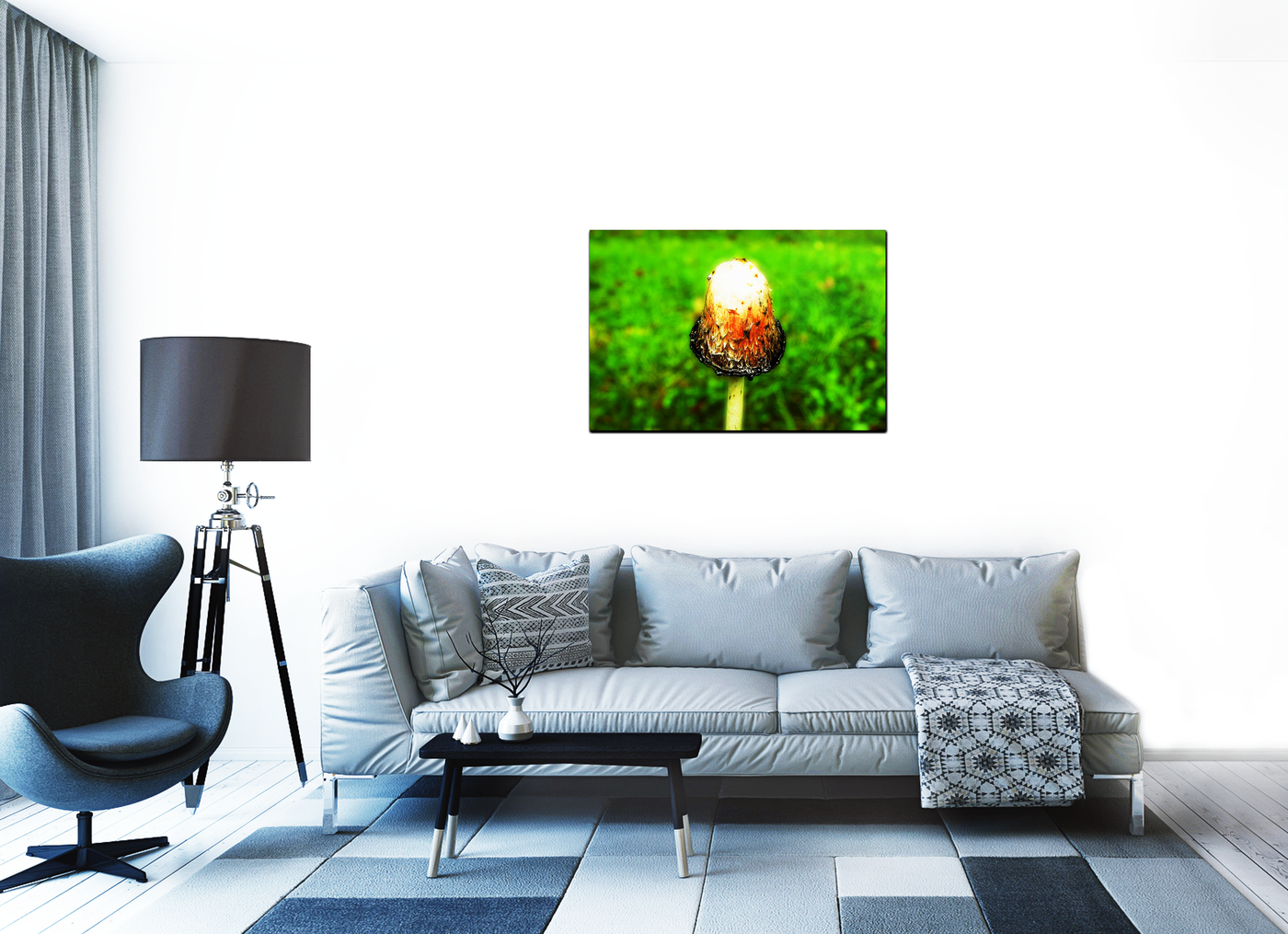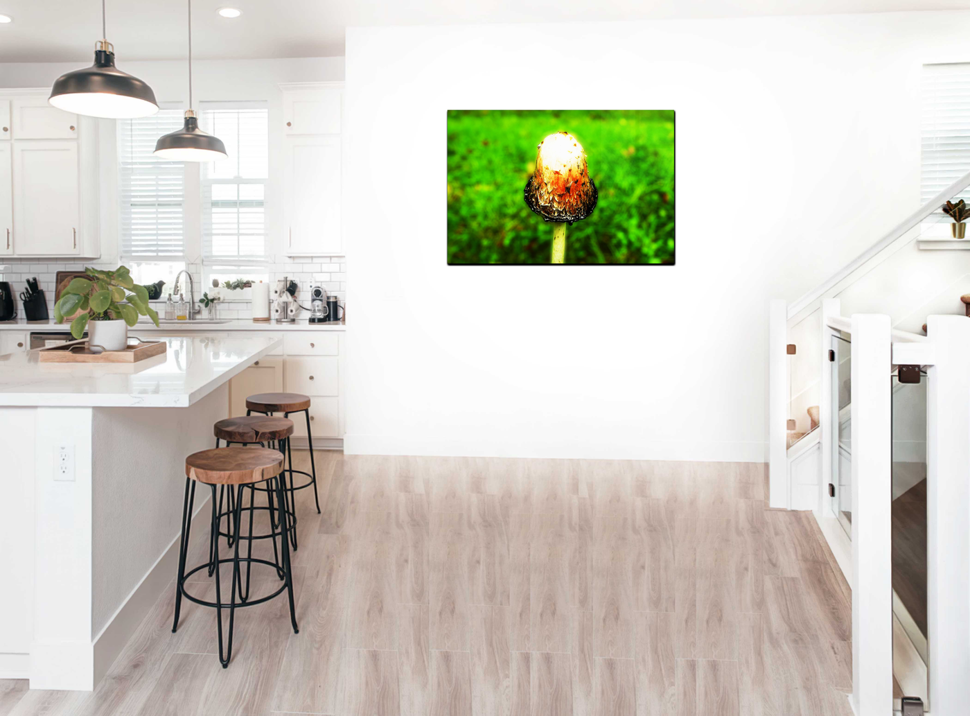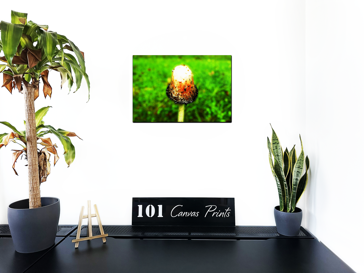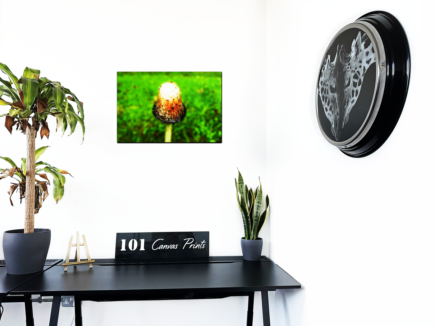 The acrylic-set print's glossy finish amplifies the vibrancy of the colours, making them appear even more intense and life-like. It enhances the contrast between the sharp detail of the mushroom and the soft blur of the background, creating a sense of depth that draws the viewer into the scene. 101 Canvas Prints' skilled photographers have produced a piece that comes alive in modern interiors, nature centres, or botanical-themed spaces. In these settings, the print's crisp details and vivid colours invite viewers to pause and marvel at the often-overlooked beauty of the natural world, celebrating the small wonders that surround us.