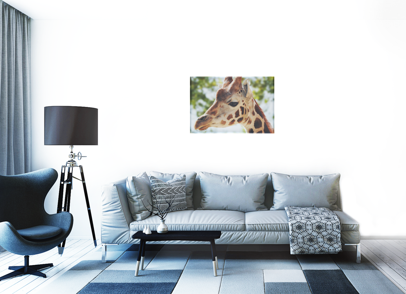 Giraffes, with their distinctive long necks, are the tallest living terrestrial mammals. In this stunning Canvas print, the giraffes face is sharpened and its posture is accentuated by the bokeh created from the branches and leaves in the background. The light sky and many shades of green in the background create a perfect balance to the bright yellow glow of the giraffes skin.