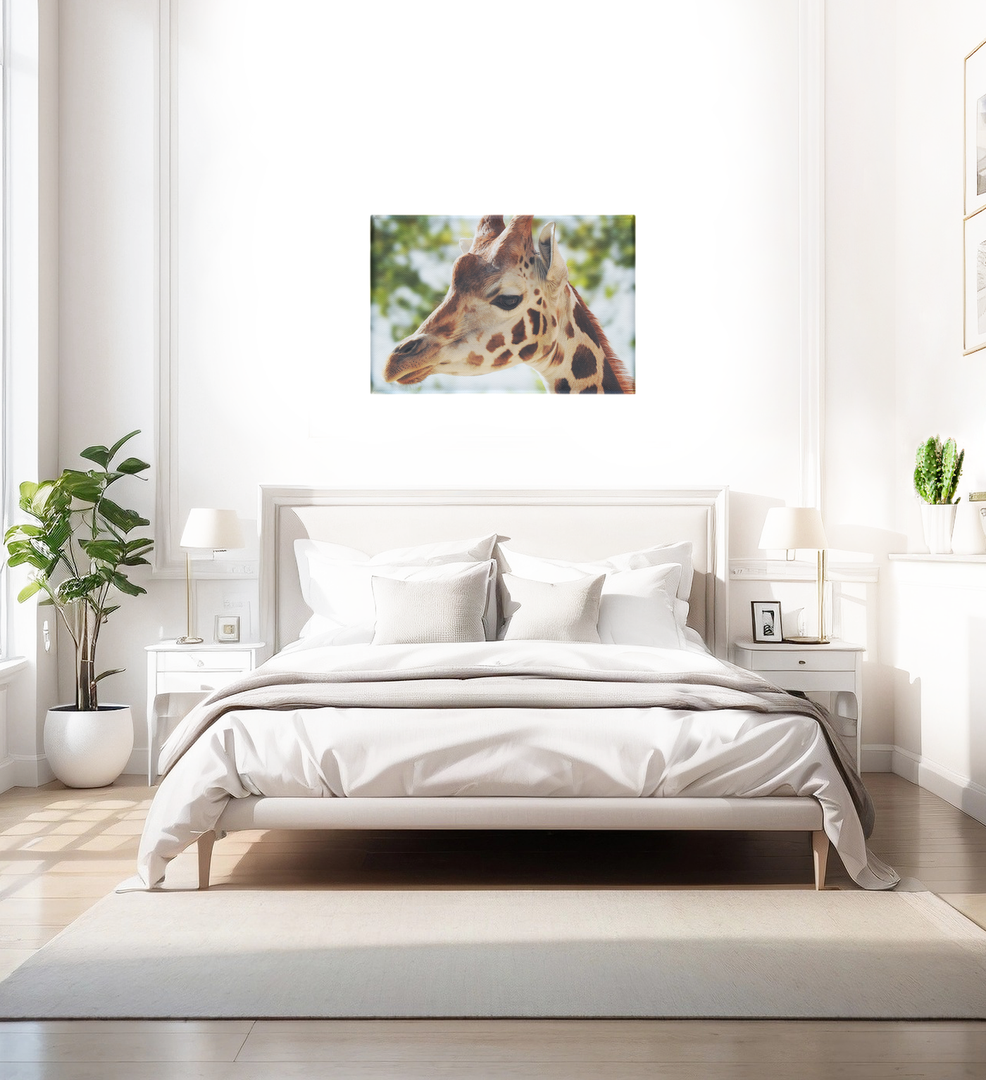 The Giraffe Portrait Canvas Print is a stunning piece of art that will add sophistication and style to any room in your home. Full of personality and character, it features a detailed portrait of a beautiful African giraffe, with a light sky and blurred tree branches and leaves in the background.