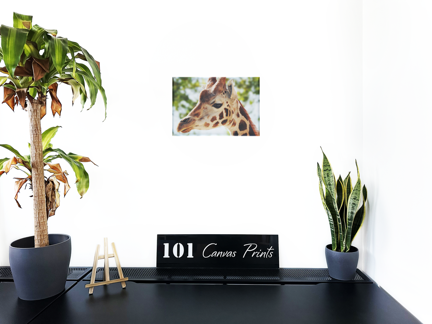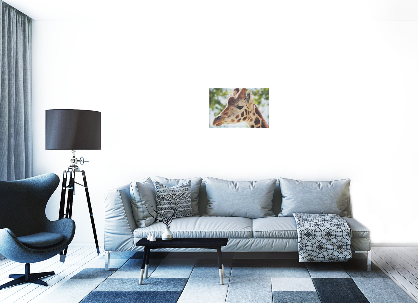 Giraffes, with their distinctive long necks, are the tallest living terrestrial mammals. In this stunning Canvas print, the giraffes face is sharpened and its posture is accentuated by the bokeh created from the branches and leaves in the background. The light sky and many shades of green in the background create a perfect balance to the bright yellow glow of the giraffes skin.