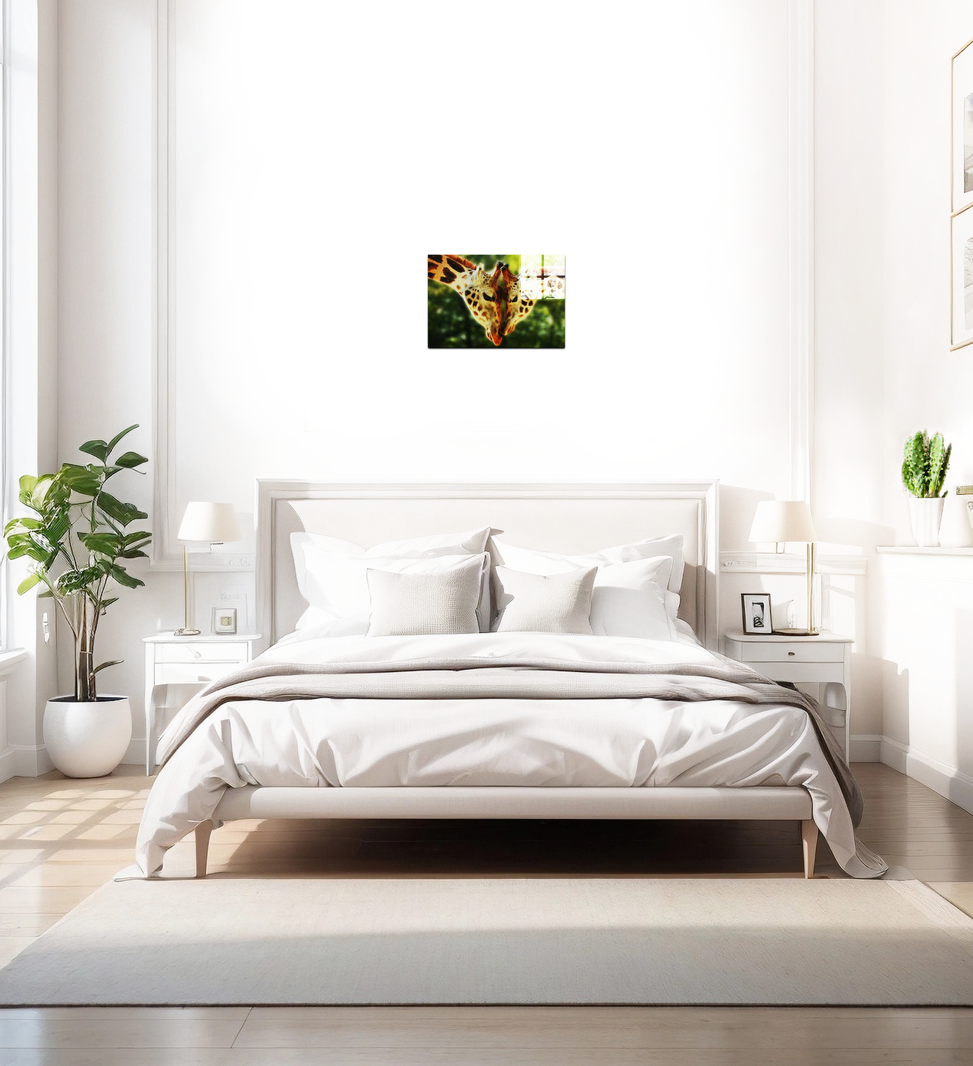 Giraffes are extremely affectionate animals with one another, partners tend to spend almost 24 hours a day together; the male leaves the female to feed at night, but otherwise they stay side by side. As such, these animals are commonly referred to as "romantic partners." In this stunning print, two giraffes tenderly touch heads in a loving parental embrace.