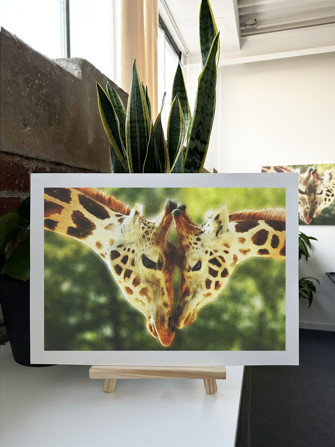 Giraffes are extremely affectionate animals with one another, partners tend to spend almost 24 hours a day together; the male leaves the female to feed at night, but otherwise they stay side by side. As such, these animals are commonly referred to as "romantic partners." In this stunning print, two giraffes tenderly touch heads in a loving parental embrace.