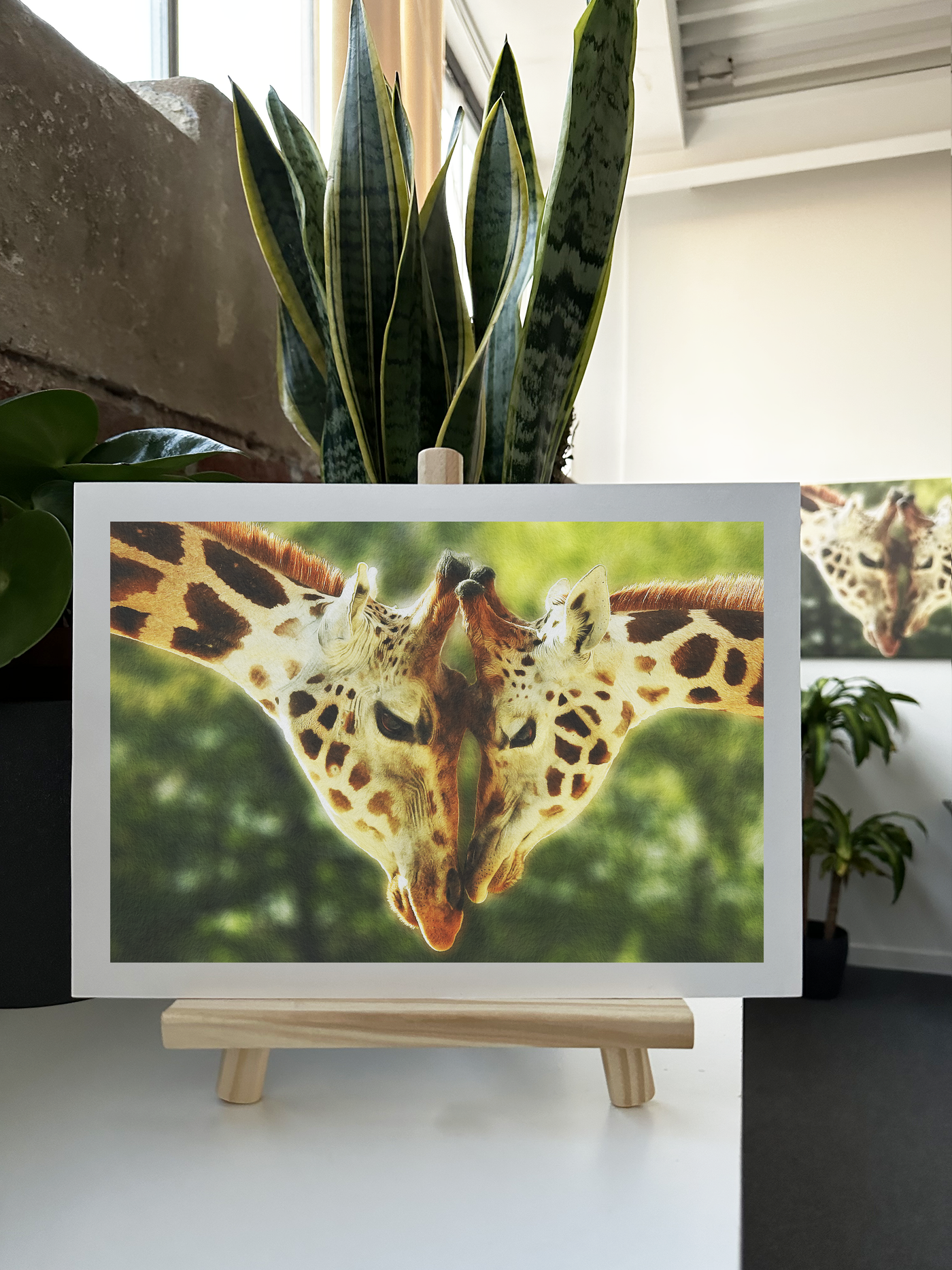 Giraffes are extremely affectionate animals with one another, partners tend to spend almost 24 hours a day together; the male leaves the female to feed at night, but otherwise they stay side by side. As such, these animals are commonly referred to as "romantic partners." In this stunning print, two giraffes tenderly touch heads in a loving parental embrace.