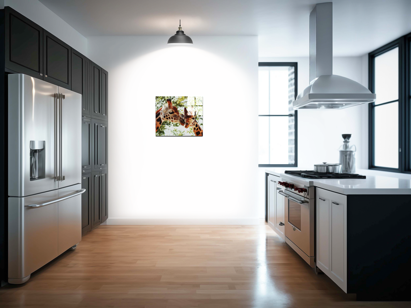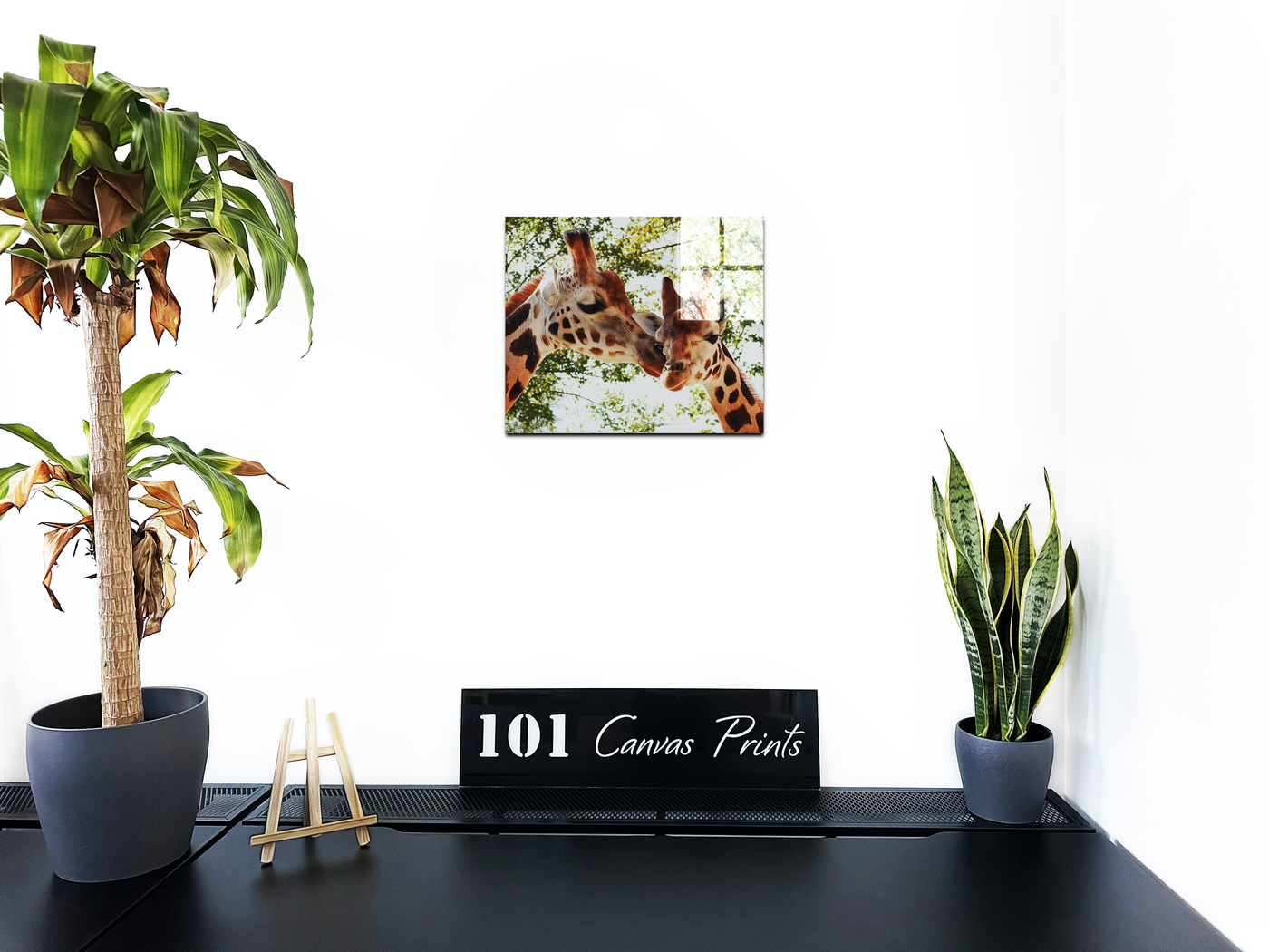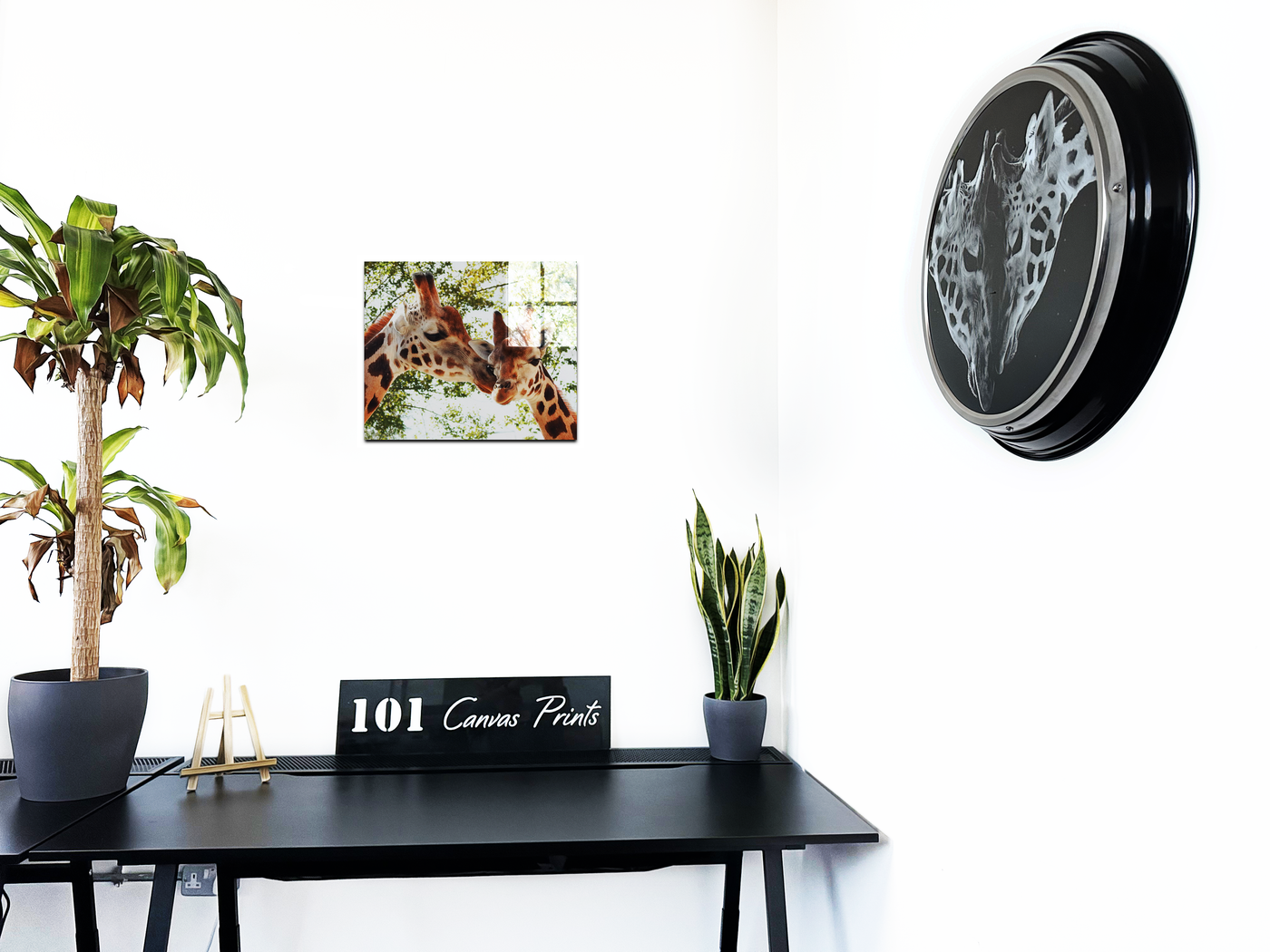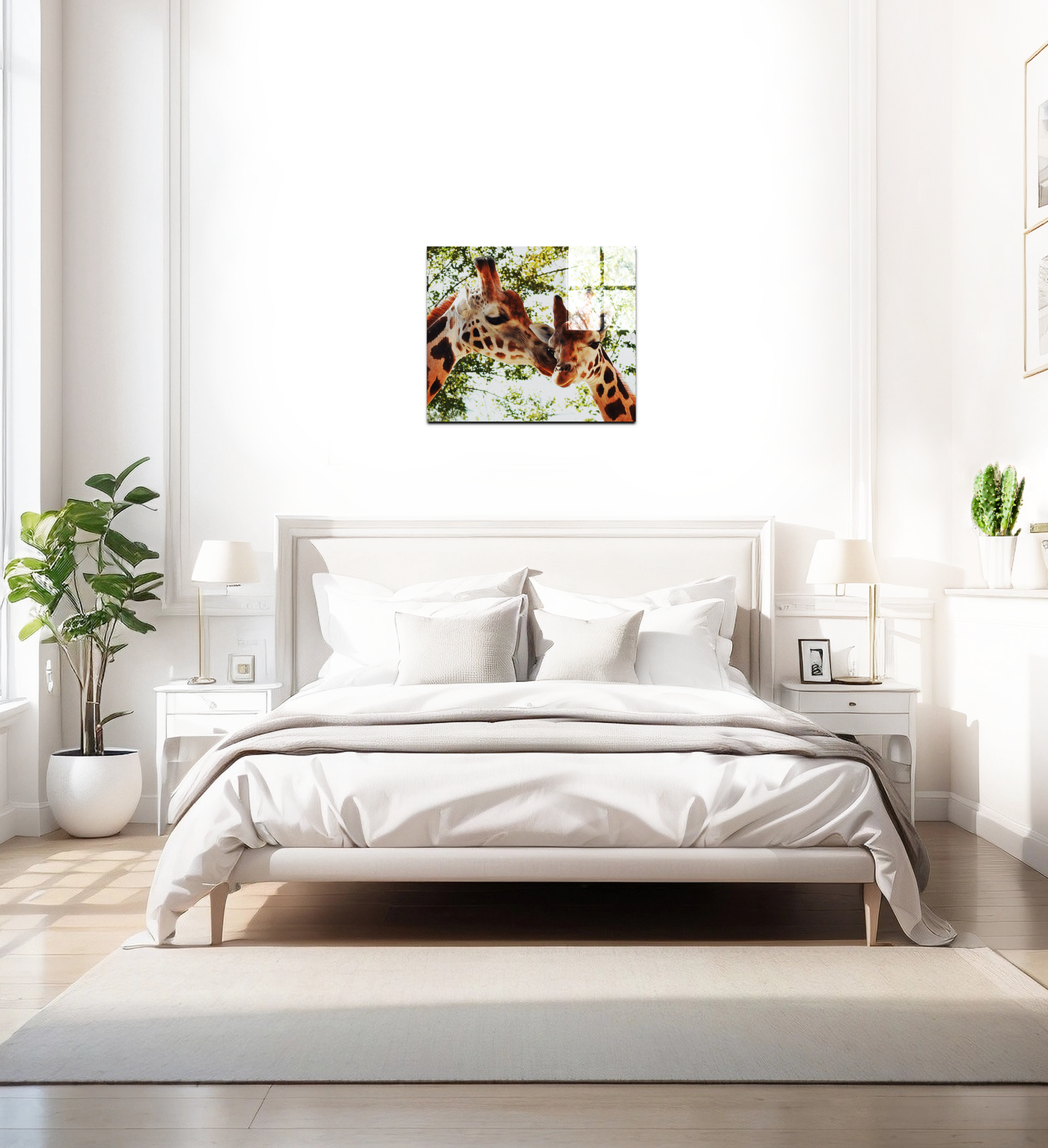 The Giraffes Kiss Acrylic print is a beautiful interpretation of the love between partners. The male giraffe holds his head close to the female partners head, as the two share an embrace.
